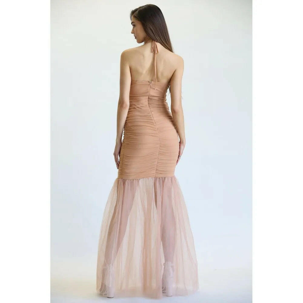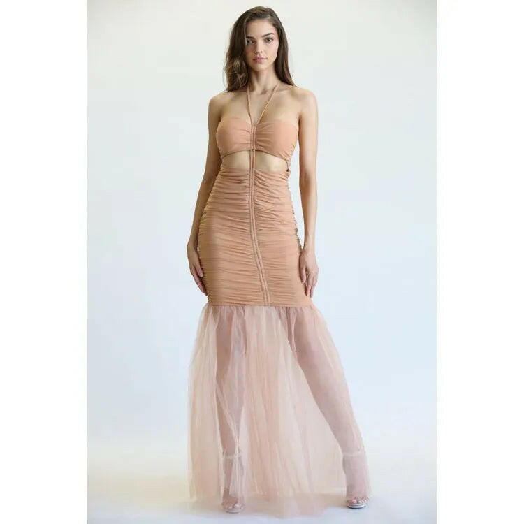 Indulge in this Aayla dress featuring tulle fabric, a halter tie back strapless design, and a sweetheart bustline tunneled bodice with a front cutout. The ruched details throughout add a touch of whimsy, while the mermaid-style layered skirt and zipper back closure keep you looking effortlessly chic. Nude lining.