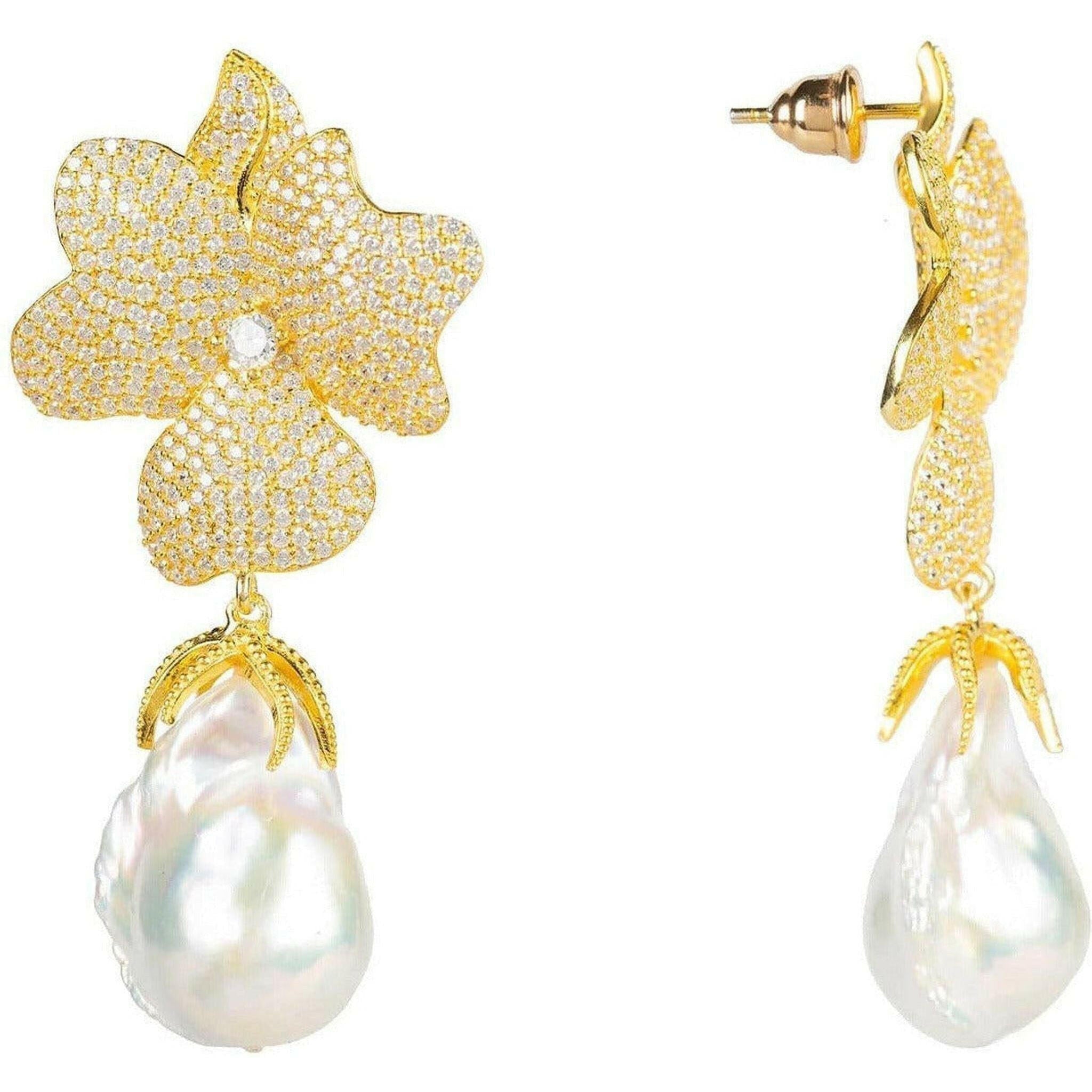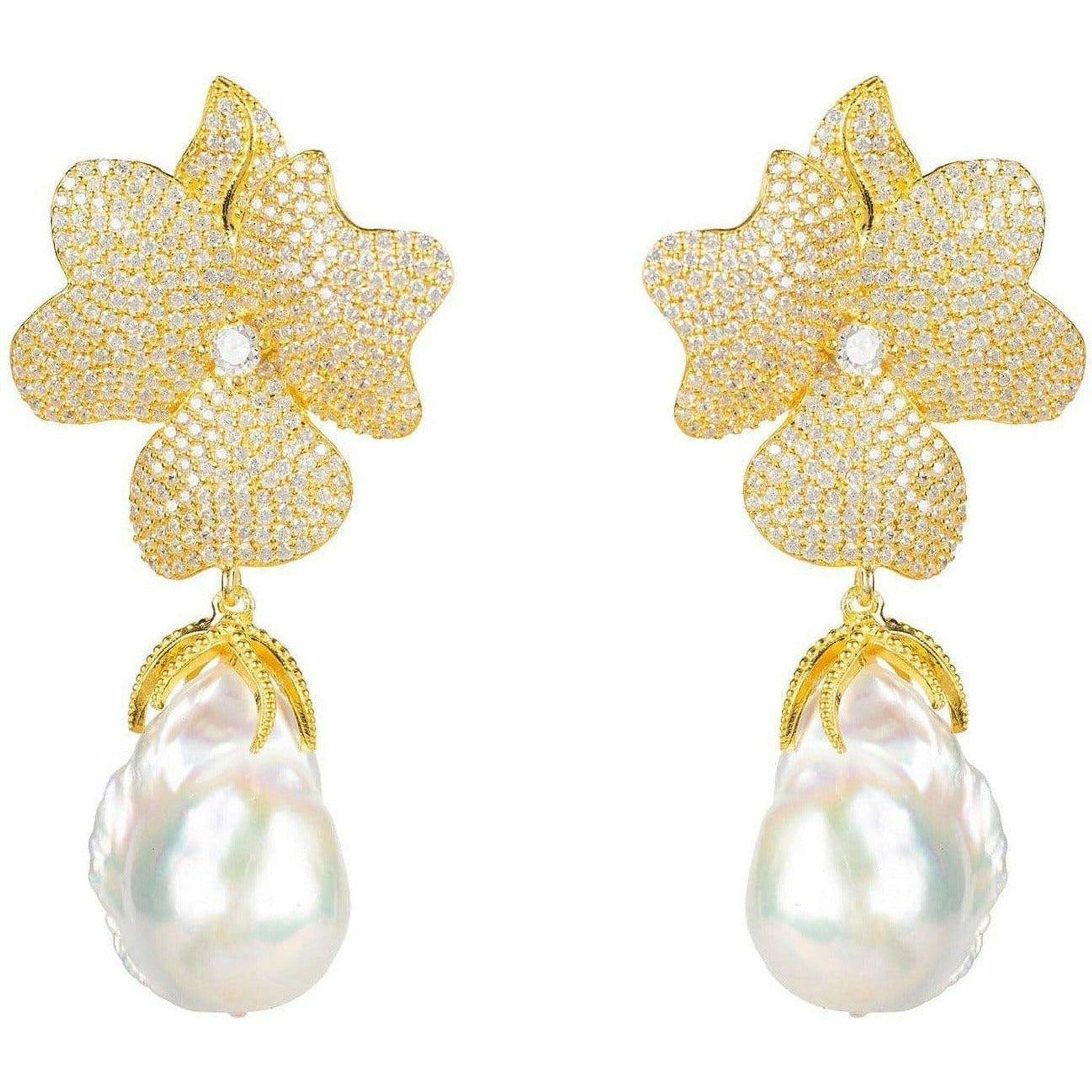 These Baroque Pearl White Flower Drop Earrings Gold are a lovely addition to any outfit. These earrings feature beautiful floral tips encrusted with sparkling cubic zirconia and dangling baroque pearls. They're pierced earrings with post backs and butterfly fastenings. Made from 925 sterling silver and dipped in lavish 22ct gold. They are 5.5cm long and 3cm wide, and weigh approximately 26g.