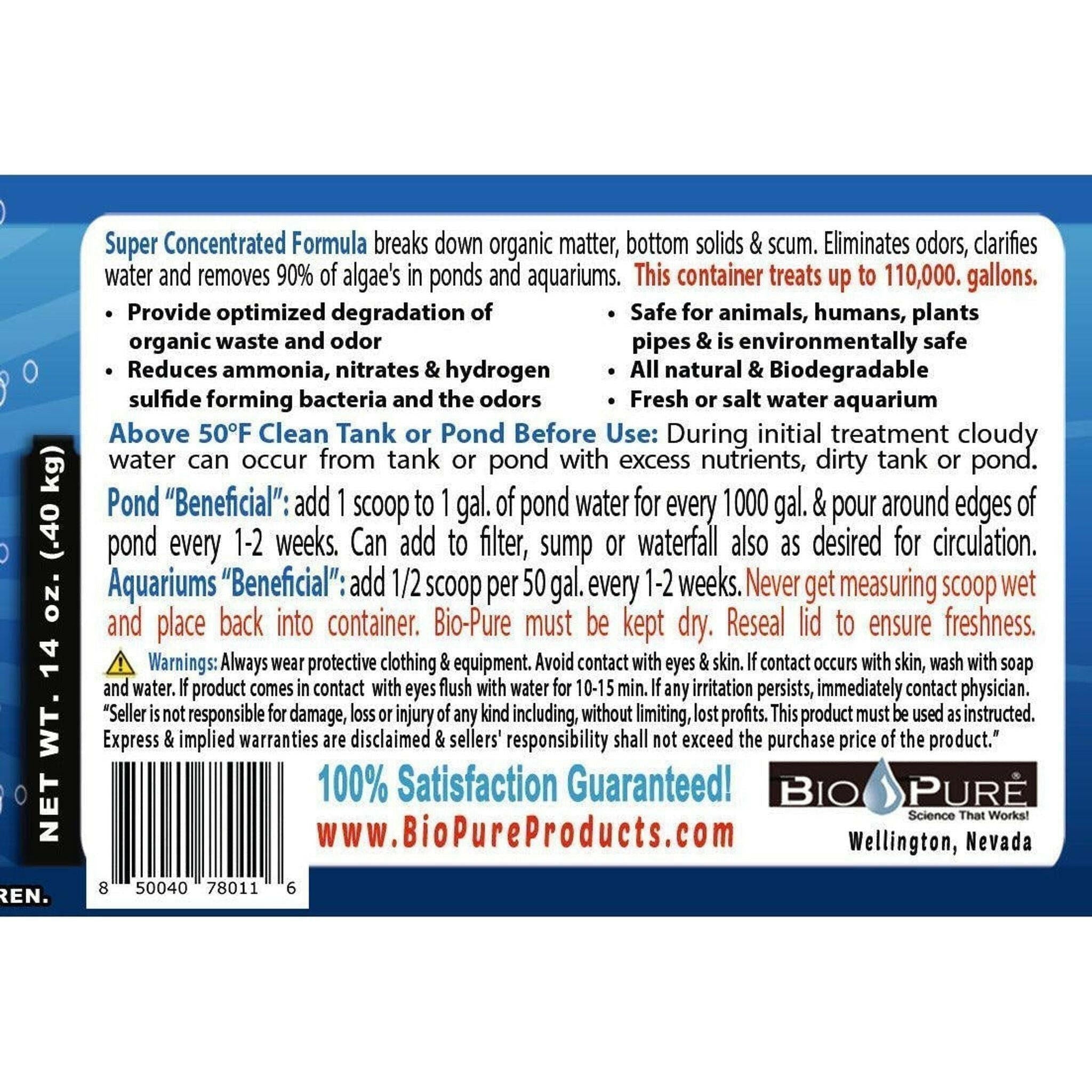 - Bio-Pure Pond & Aquarium Beneficial 50/50 wt. 14 oz., which treats up to 110,000 gallons of water for aquarium and pool cleaning with beneficial pond bacteria