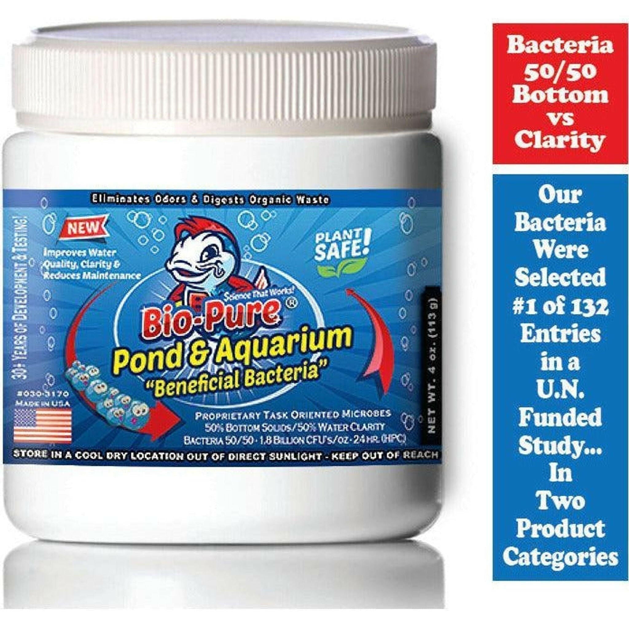 - Bio-Pure Pond & Aquarium Beneficial 50/50 wt. 4 oz., which treats up to 30,000 gallons of water for aquarium and pool cleaning with beneficial pond bacteria