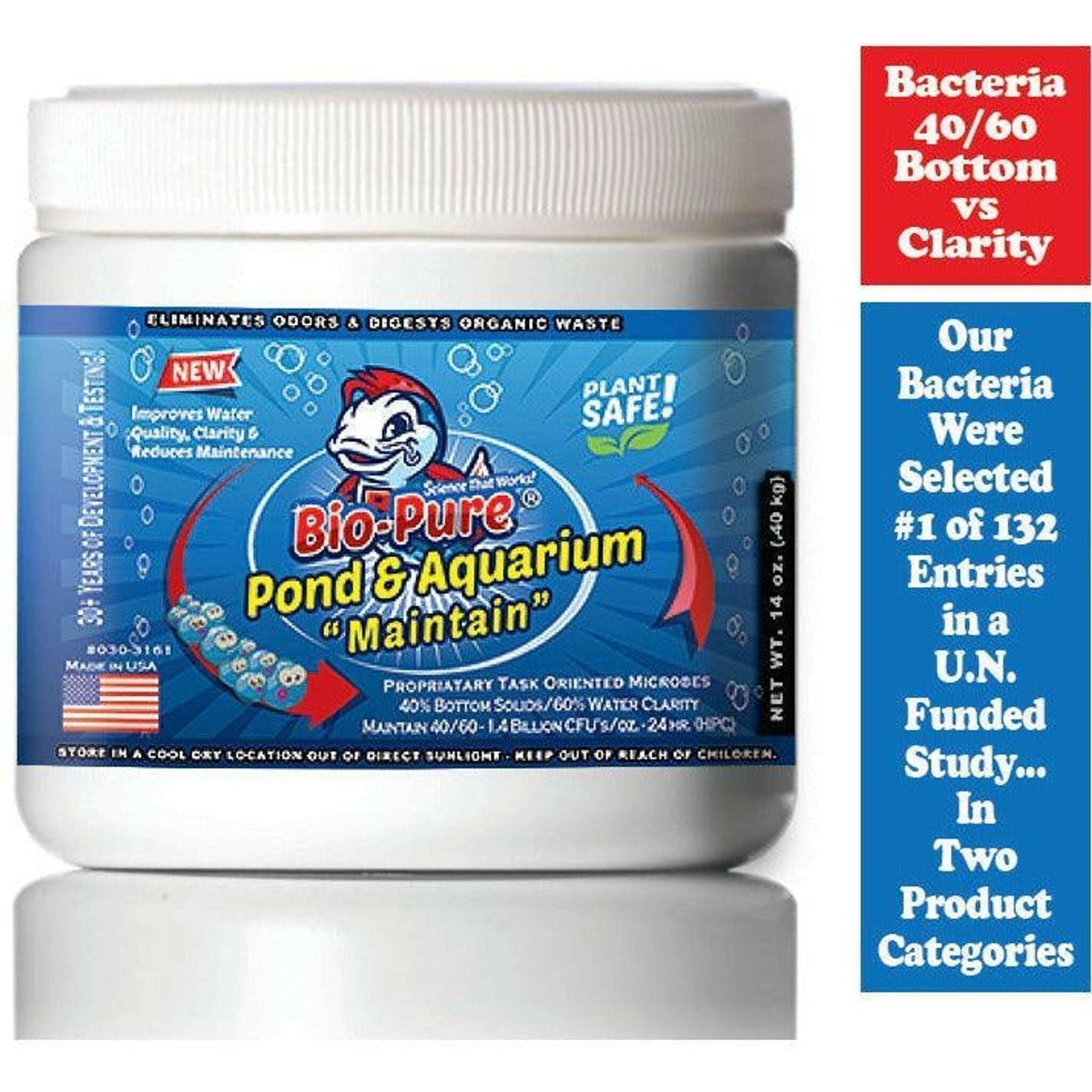 - Bio-Pure Pond & Aquarium Maintain 40/60 wt. 14 oz., which treats up to 55,000 gallons of water for aquarium and pool cleaning with beneficial pond bacteria
