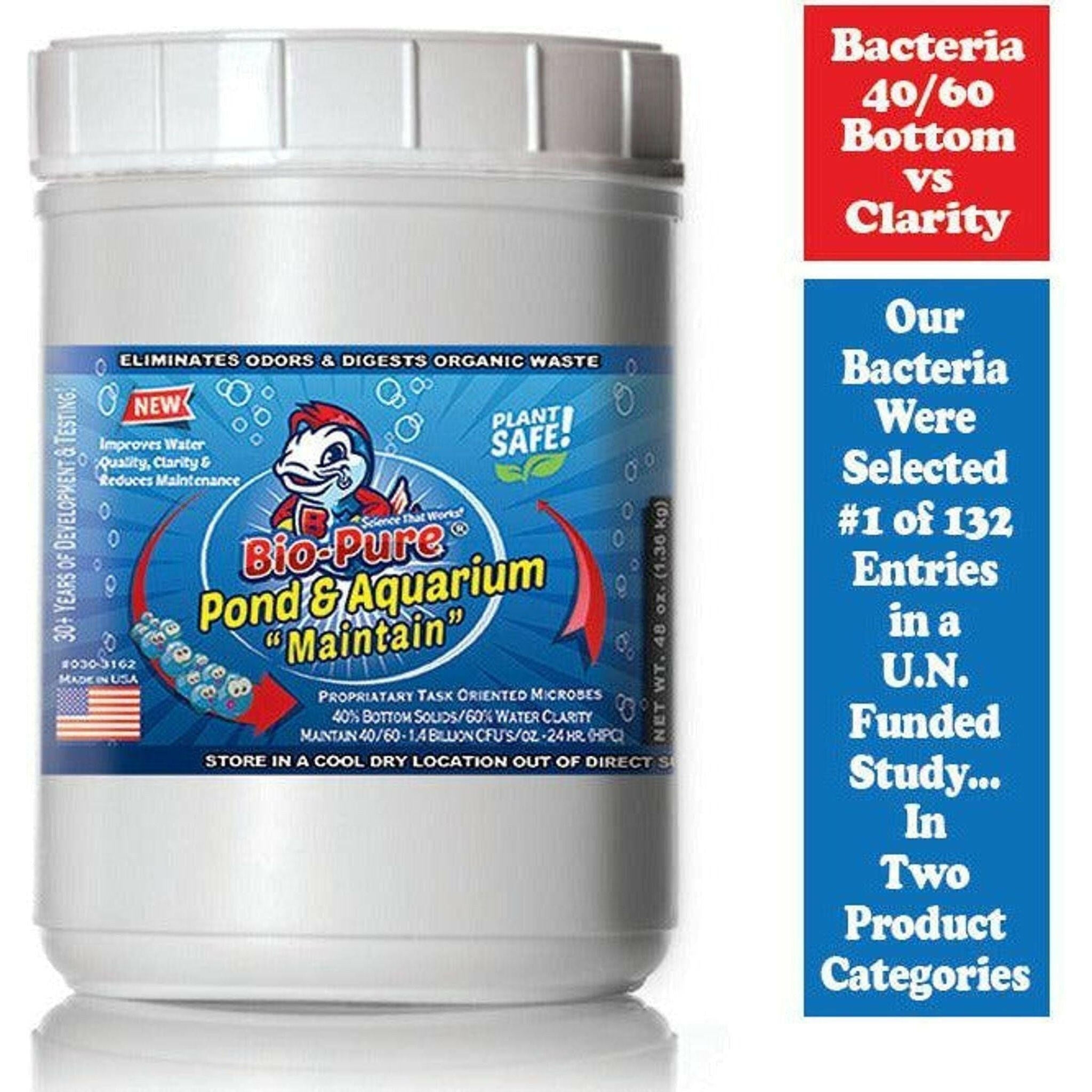 Pond & Aquarium Maintain 40/60 48 oz. is Proprietary Microbial Cleaning (24/7) working in aerobic and anaerobic conditions. All-natural microbes (multi-species), carriers, nutrients, specialized enzymes. Furthermore, one microbe becomes 9 - 10 million waste digesting microbes in 24 hours, absolutely safe for fish.