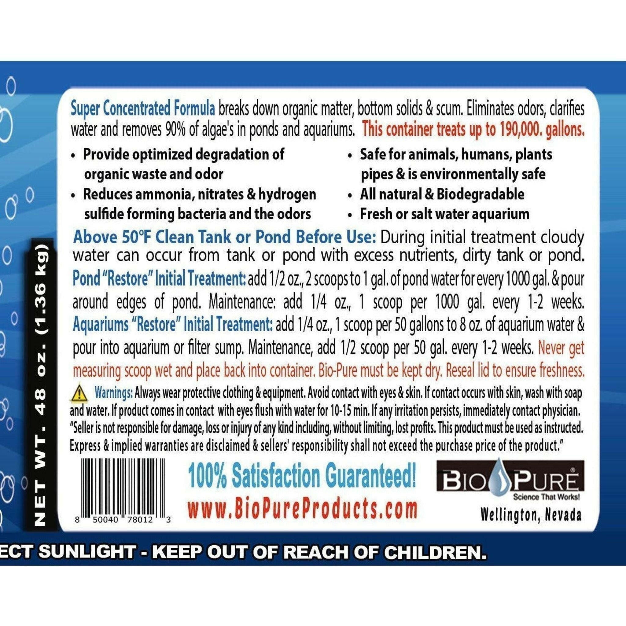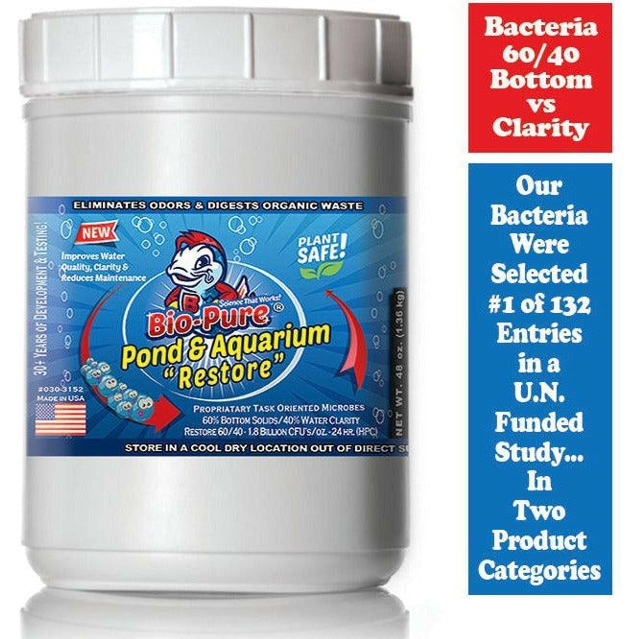 Pond & Aquarium Restore 60/40 48 oz. is Proprietary Microbial Cleaning (24/7) working in aerobic and anaerobic conditions. All-natural microbes (multi-species), carriers, nutrients, specialized enzymes. Furthermore, one microbe becomes 9 - 10 million waste digesting microbes in 24 hours, absolutely safe for fish. Moreover, this water conditioner contains good bacteria to maintain the pH level of the pond or aquarium. In addition, it maintains other water parameters to keep water features at best. Restore 60/40 - Bio-Pure aquarium and pond "Restore" is designed for the aquarium or pond that has been a little neglected. Remember, the microbial/bacteria concentrate is a 60/40 blend where 60% of microbe species focus on substrate waste and 40% on water clarity. However, the microbial focus is on cleaning suspended micro-organics waste that causes reduced water clarity to improve water clarity. CLOUDY WATER!!! Your aquarium or pond will experience a mild to extreme microbe bloom the first 1-3 days, depending on how dirty the aquarium or pond environment is. Then, microbes gather the buoyant waste and seed it into the system. As a result, the environment will clear and prepare to be AMAZED!!! Therefore, the only Aquatic Therapy Cleaner for aquarium & pond beneficial bacteria treatment; pond restoration, aquarium restoration, and pond/aquarium water treatment, "GUARANTEED" improves pond/aquarium water quality. Furthermore, enhancing the clarity and reducing the frequency of water changes save time & money! Products include: