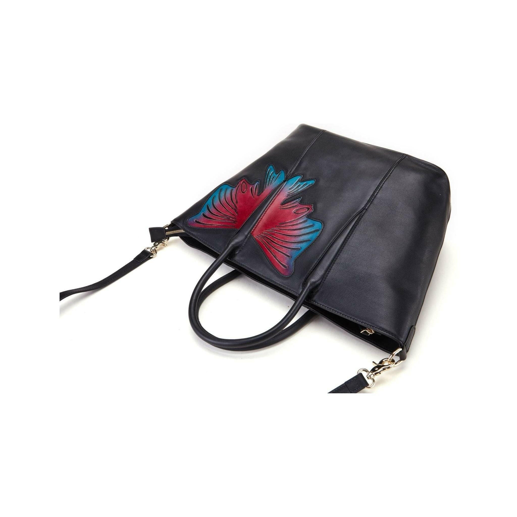 - Exterior: hand tooled and hand painted butterfly, detachable & adjustable leather strap, top handle, 4 bottom feet, one back zipper pocket