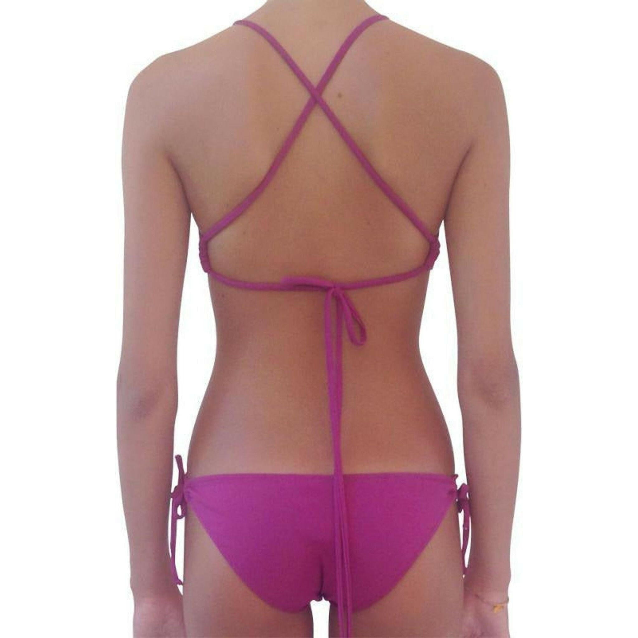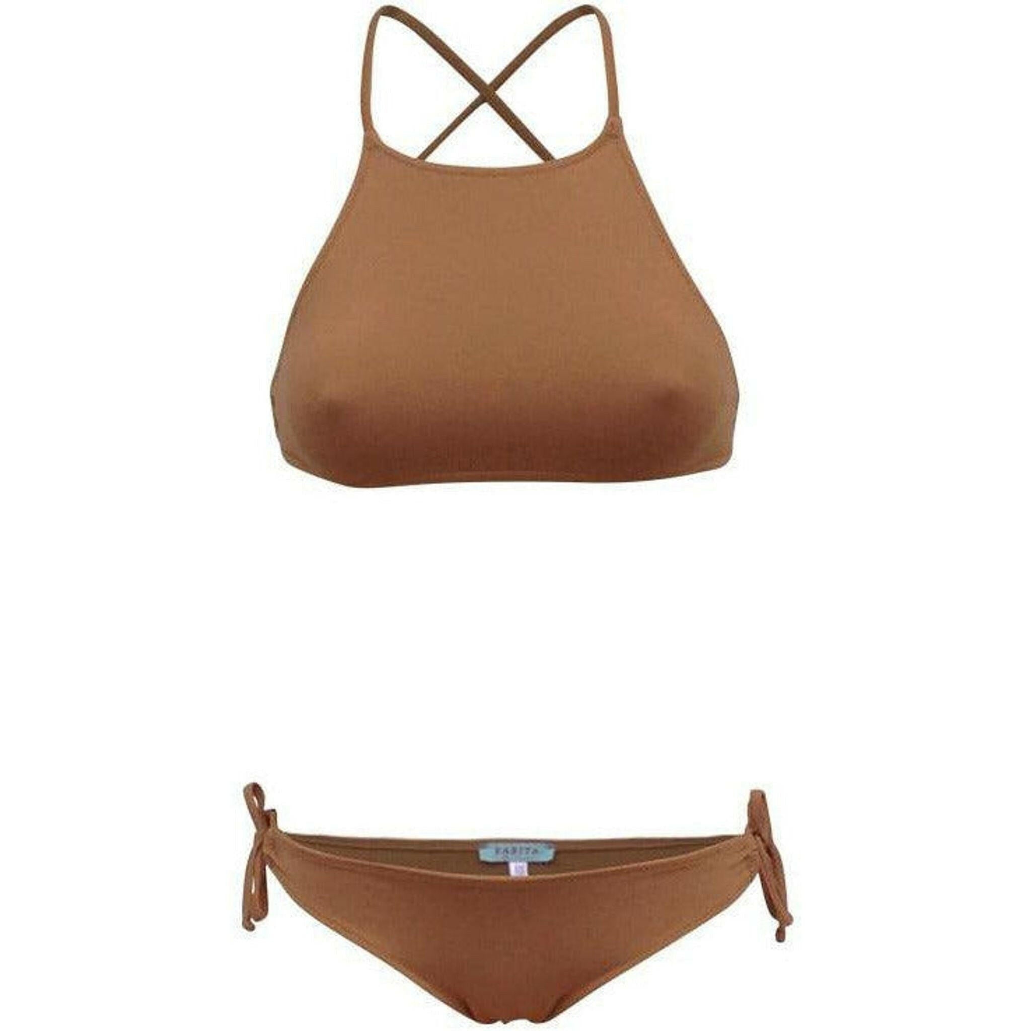 Calipso is the ultimate trend in bikini Top, it's a high neck halter top, open cross-back straps. Dafne bottom is low rise and features side sliding adjustable straps for a customizable fitting.