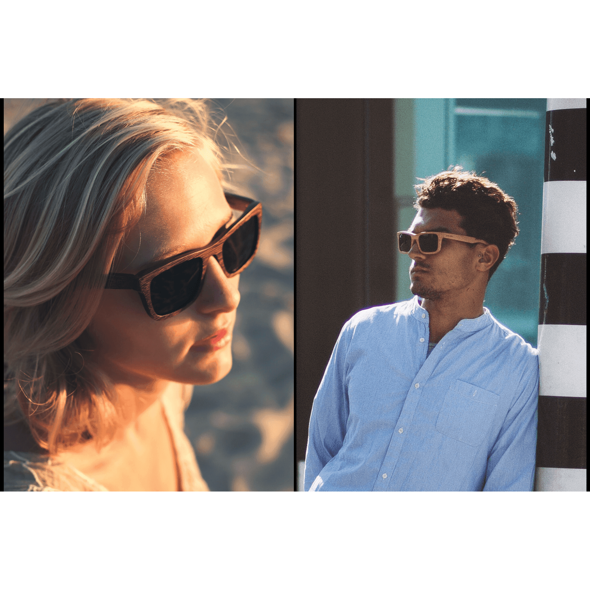 Bold wooden frames with geometric balance. Carver bamboo sunglasses feature squared lenses with a slight angle and come in a microfiber pouch with a free bamboo case.