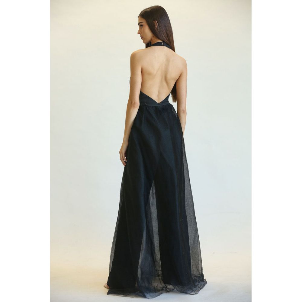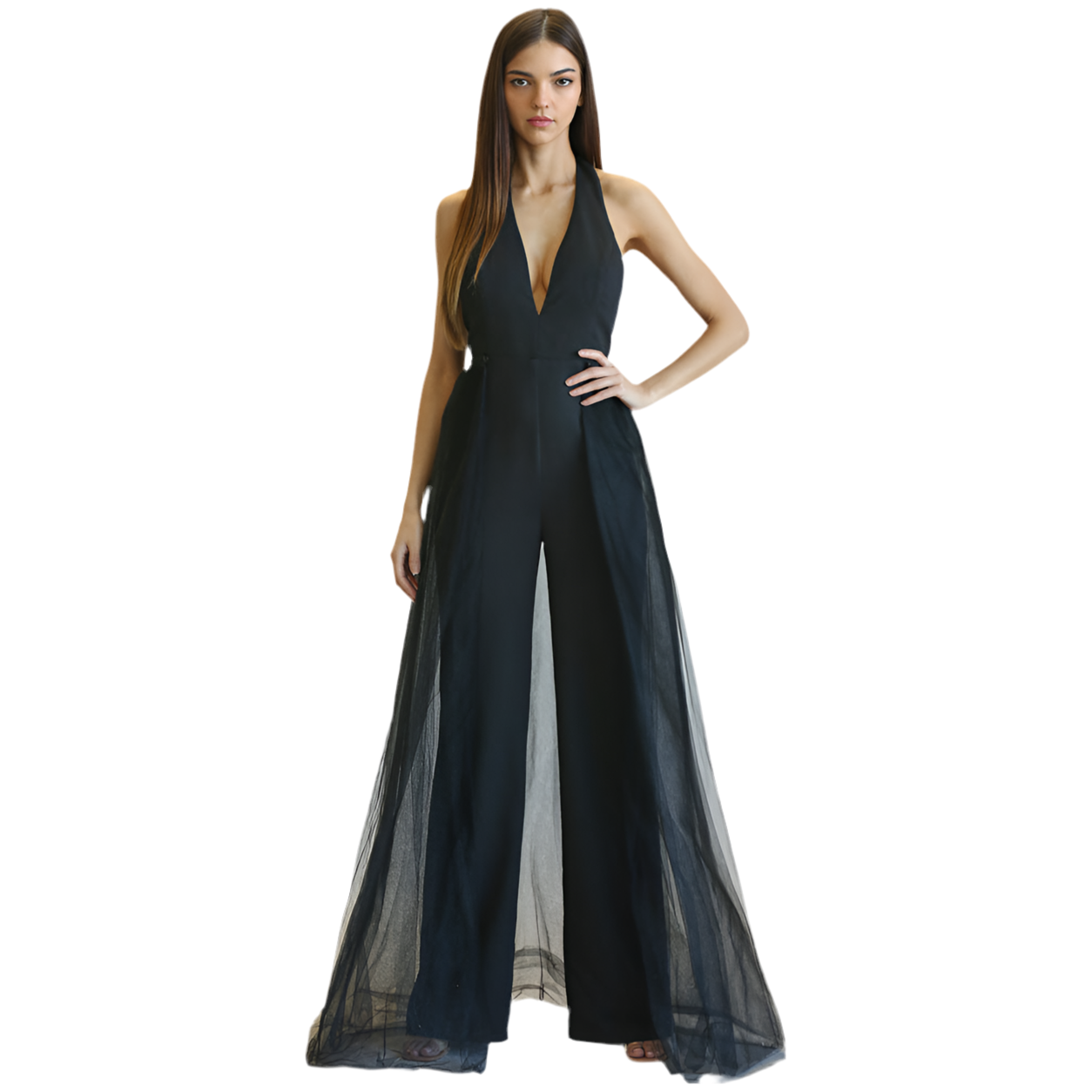 A playful, quirky jumpsuit and dress combo made of solid, stretchy fabric. With a halter neckline and button closure, it also features a high-waist and wide leg pant fit. A removable, multi-layered tulle skirt adds a touch of fun. Complete with a unique V-cut back and zipper closure.