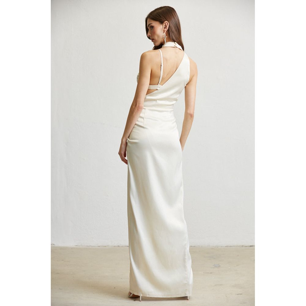 Quirky satin dress with mock neck, intricate beading, and a plunging bust. Detailed with ruching and a detached bralette, complete with a single beaded cup. Invisible zipper closure on one side for easy wear.