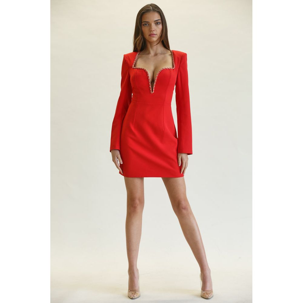 The Kylie Dress boasts a sturdy, stretchable woven fabric with a square, notched neckline adorned with a 'Chanel' chain trim. Complete with padded shoulders, long sleeves, and a finished hem, this dress also features a