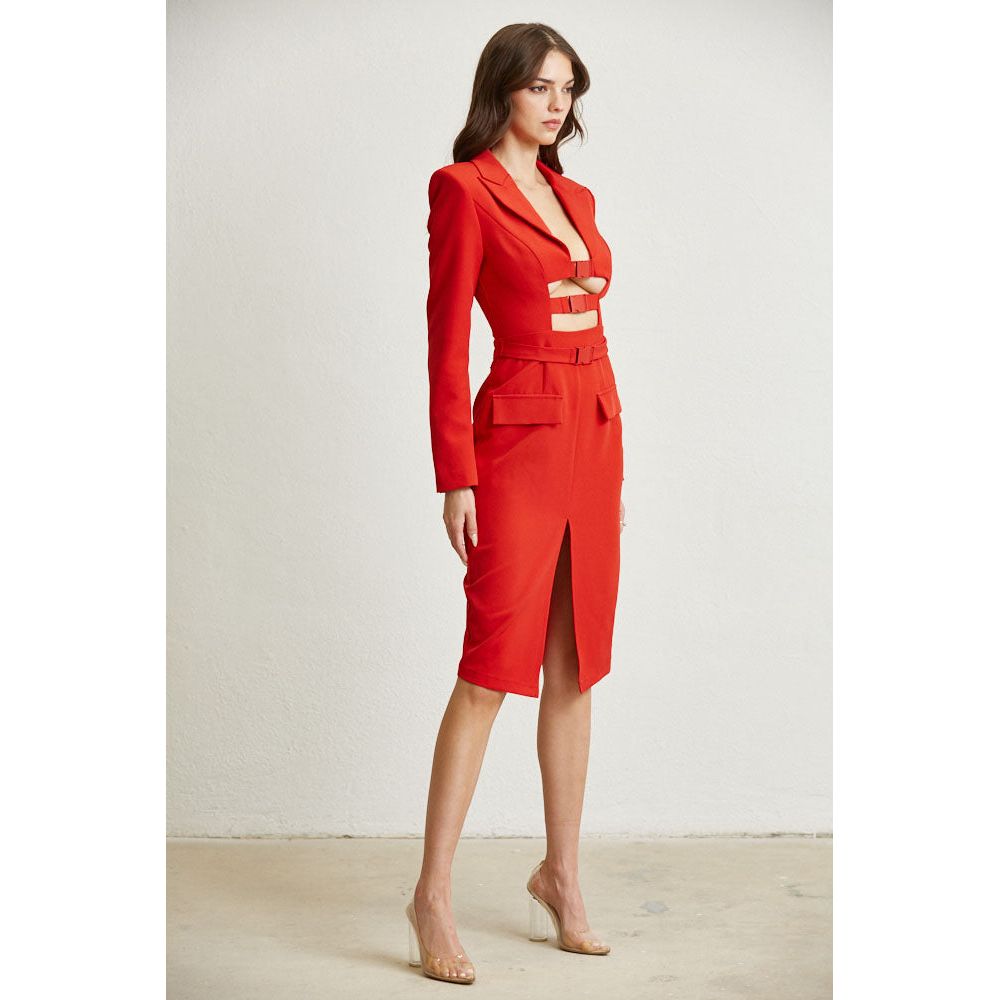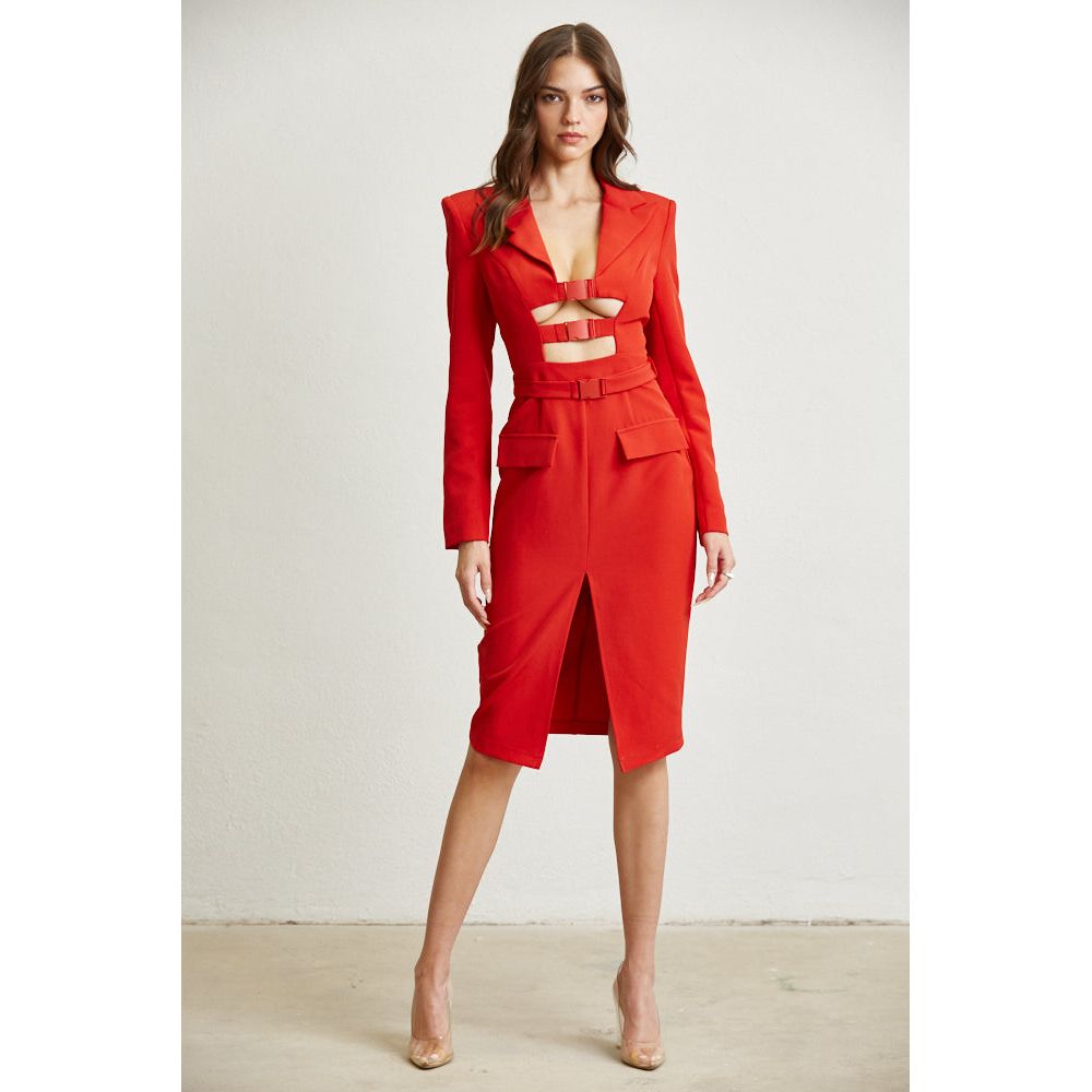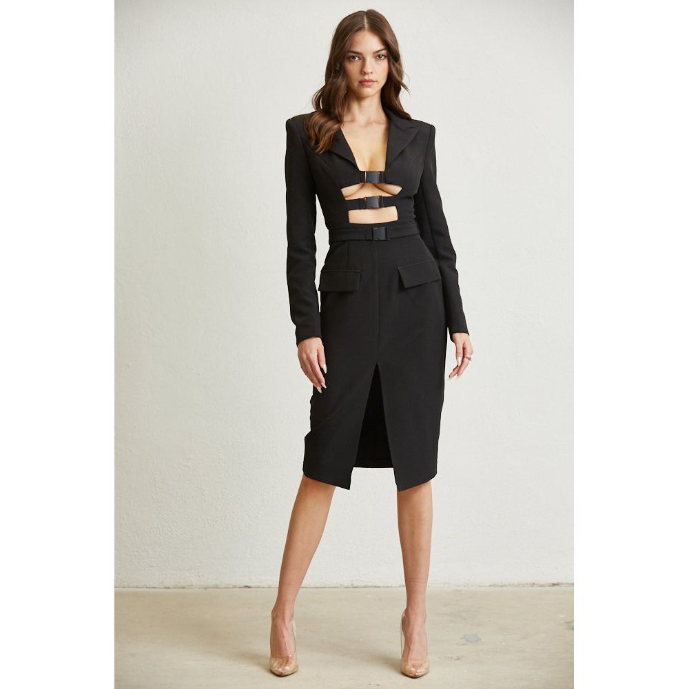 Upgrade your wardrobe with this quirky Notched Collar Buckle Dress. This dress will elevate your style game and show off your playful side.