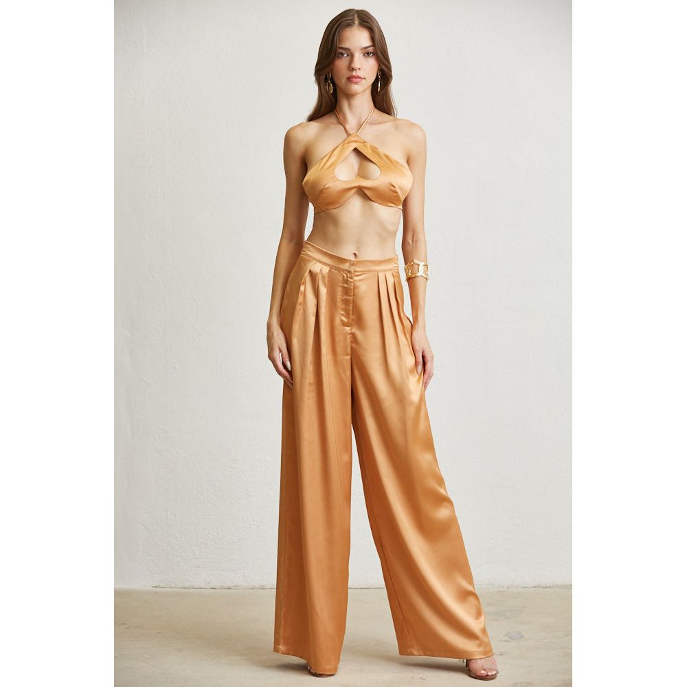 Pamper yourself with the Ivy Luxe Satin Fabric Set. This set includes a halter neck top with an upside down heart shape and a matching cutout bra with underwire and elastic strap back. The high waist, wide leg pant features