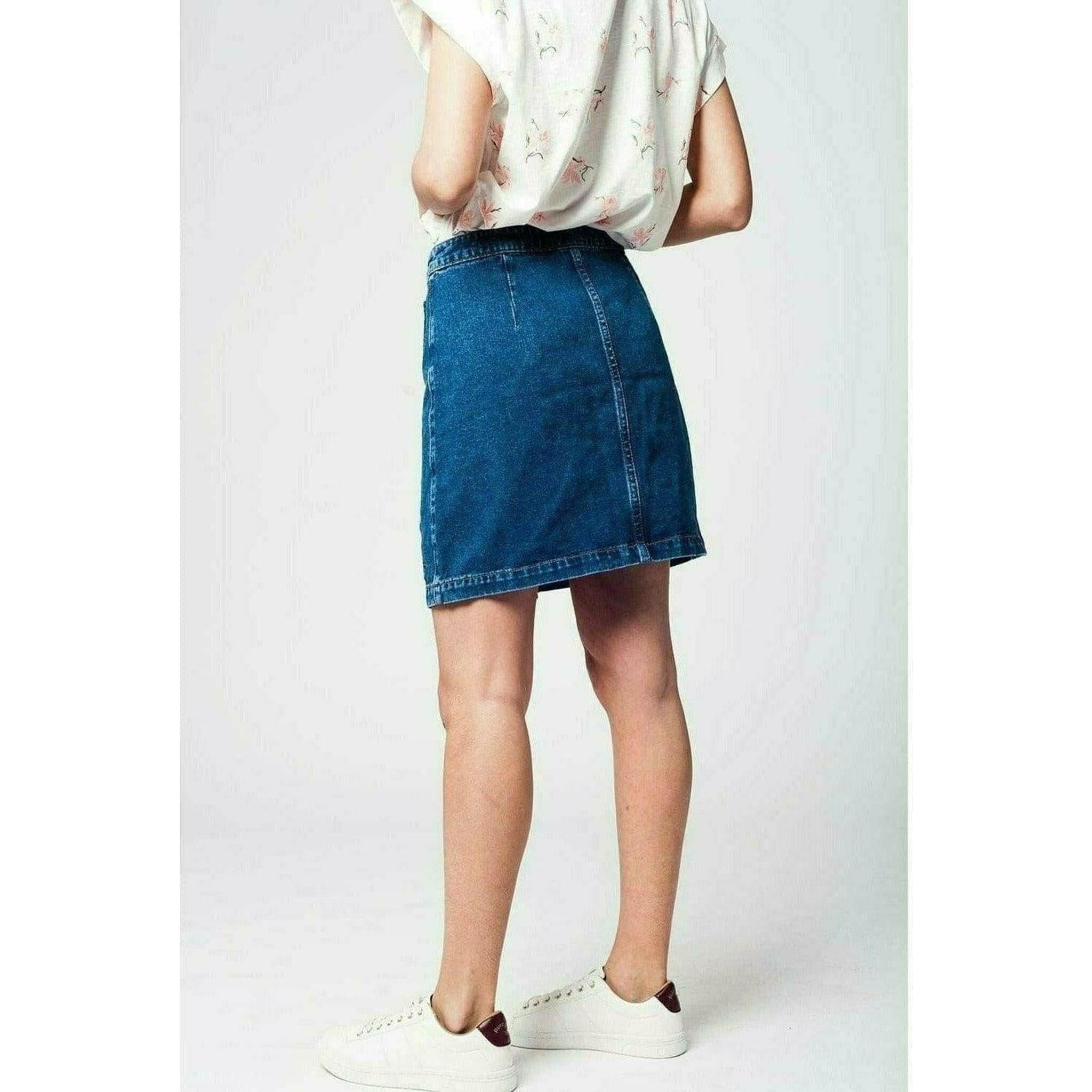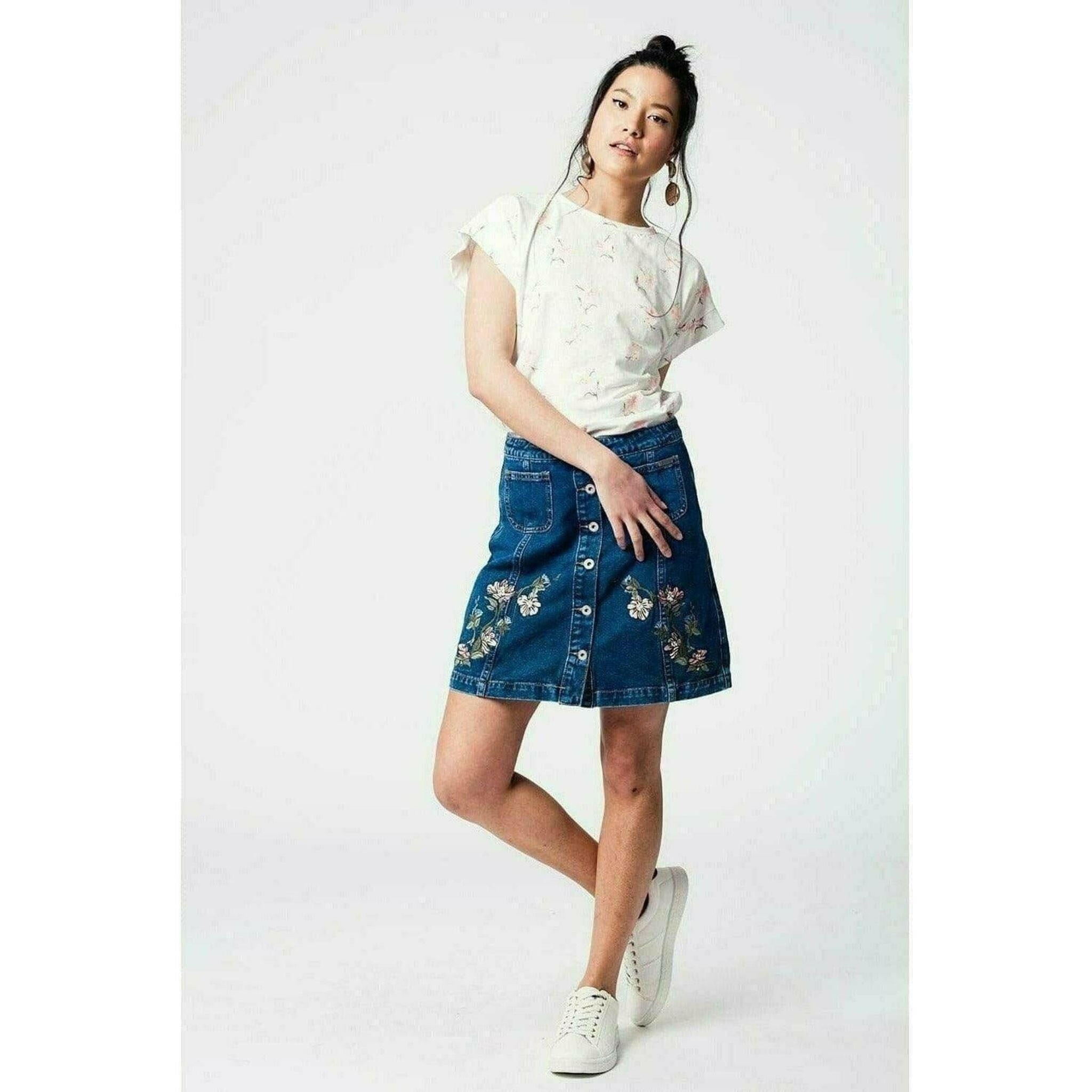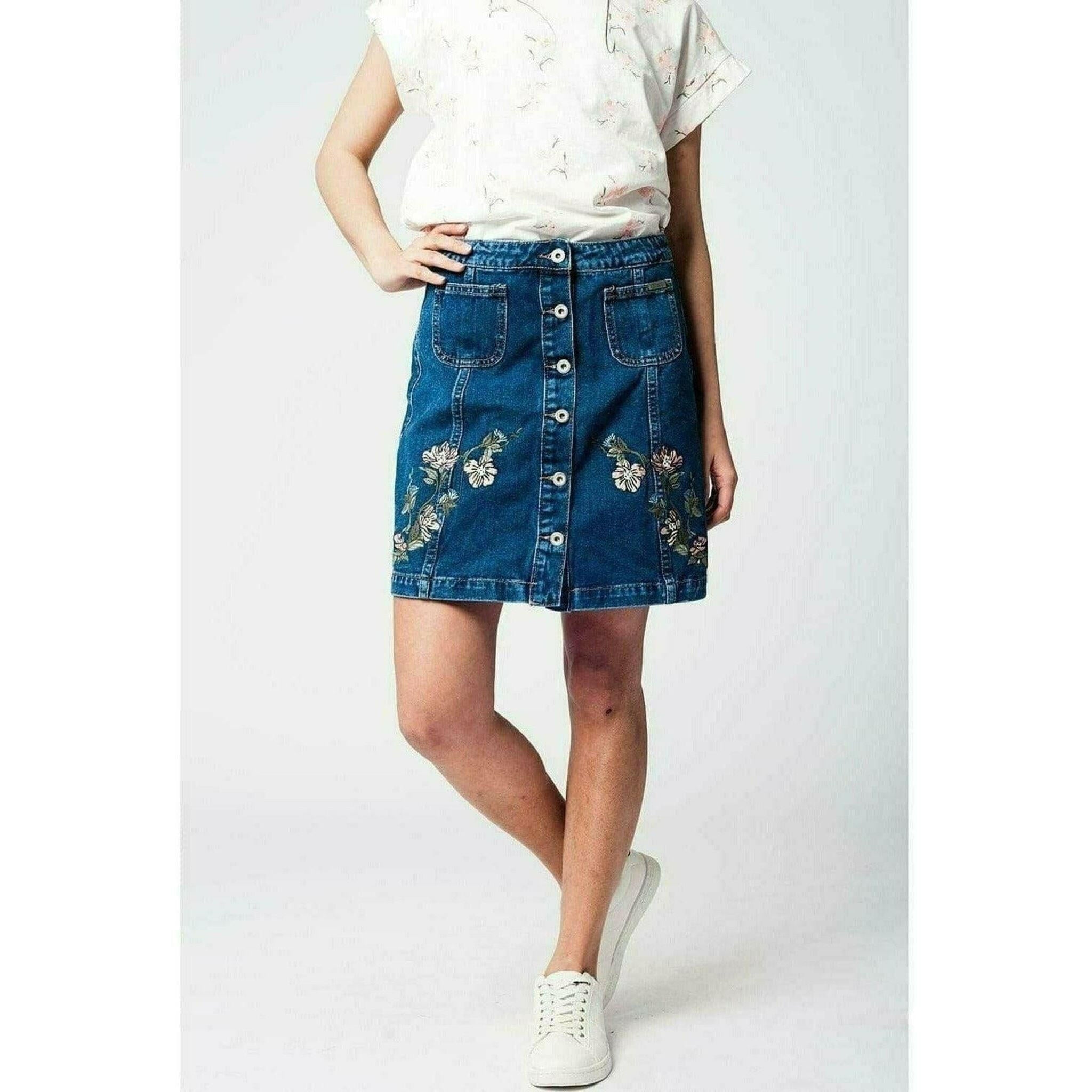 This Denim Skirt with Flower Embroidery screams outdoors & vacation time. Dark wash low waist denim skirt with floral print. Features two pockets at the front separated by buttons.