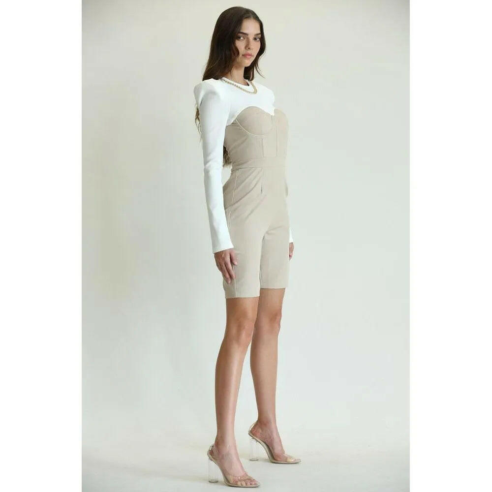 This ultimate romper features a ribbed knit top bodice and a stretch linen effect bottom bodice! It's got everything you need, from power shoulder pads and a removable curb chain necklace trim, to built-in underwire and bra cups for support. The corset waist with boning gives a flattering silhouette, paired with a biker short fit and zipper back closure.