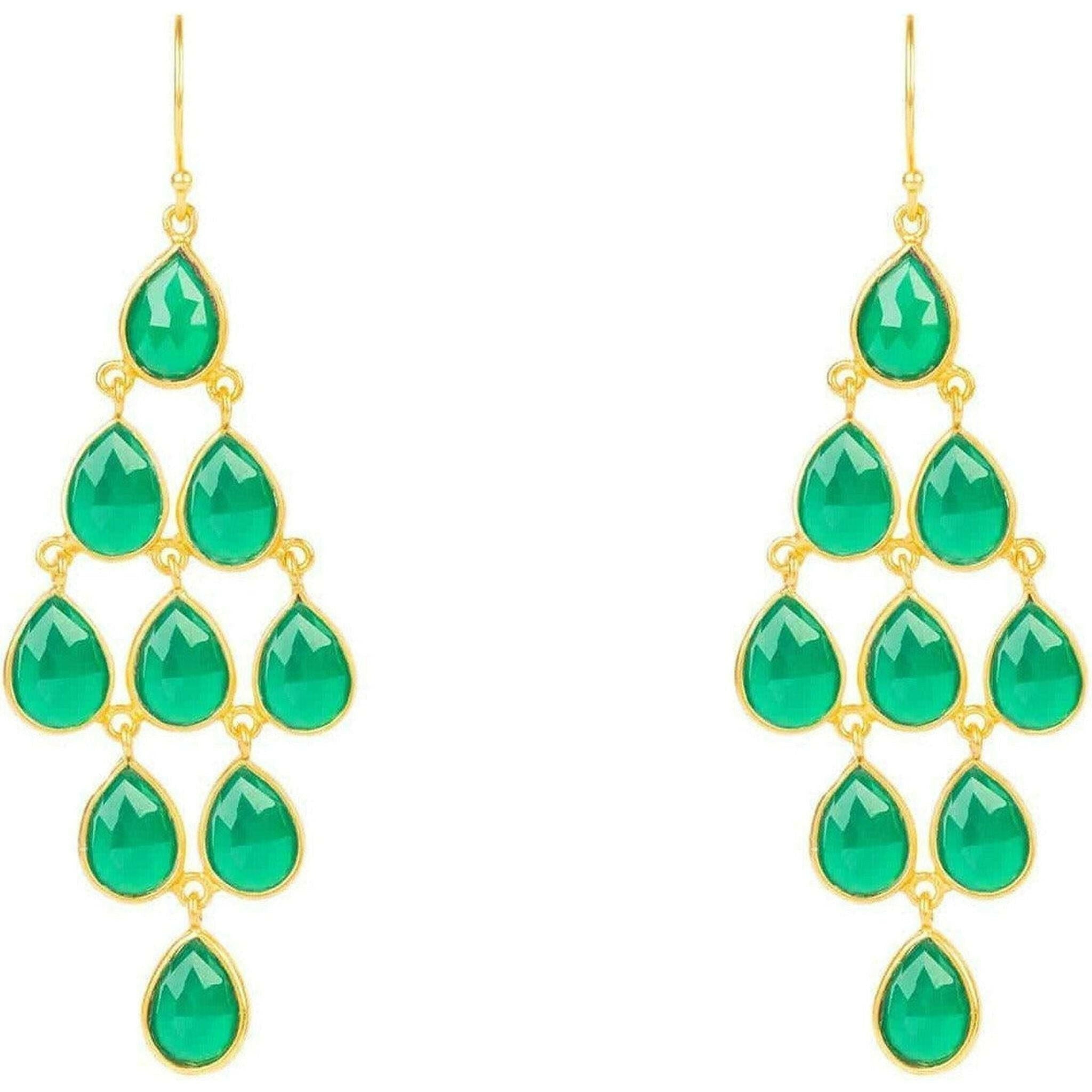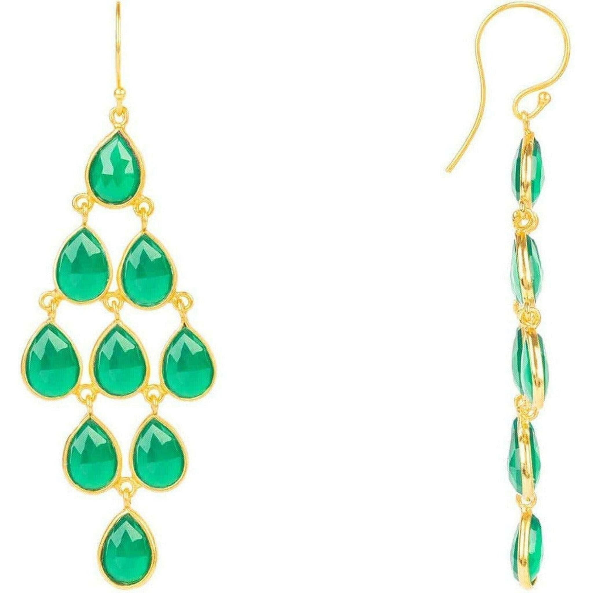 If you're looking for an exquisite and attention-grabbing statement piece to add to your jewellery collection, look no further than the Erviola Gemstone Cascade Gold Green Onyx earrings. This eye-catching earring features nine intricately linked green teardrop-shaped gemstones that hang from a polished French curved hook that enhances the look of the earring by adding an elegant dangle.