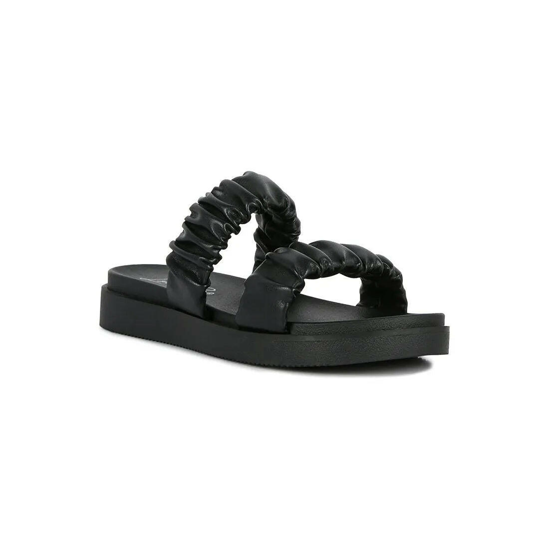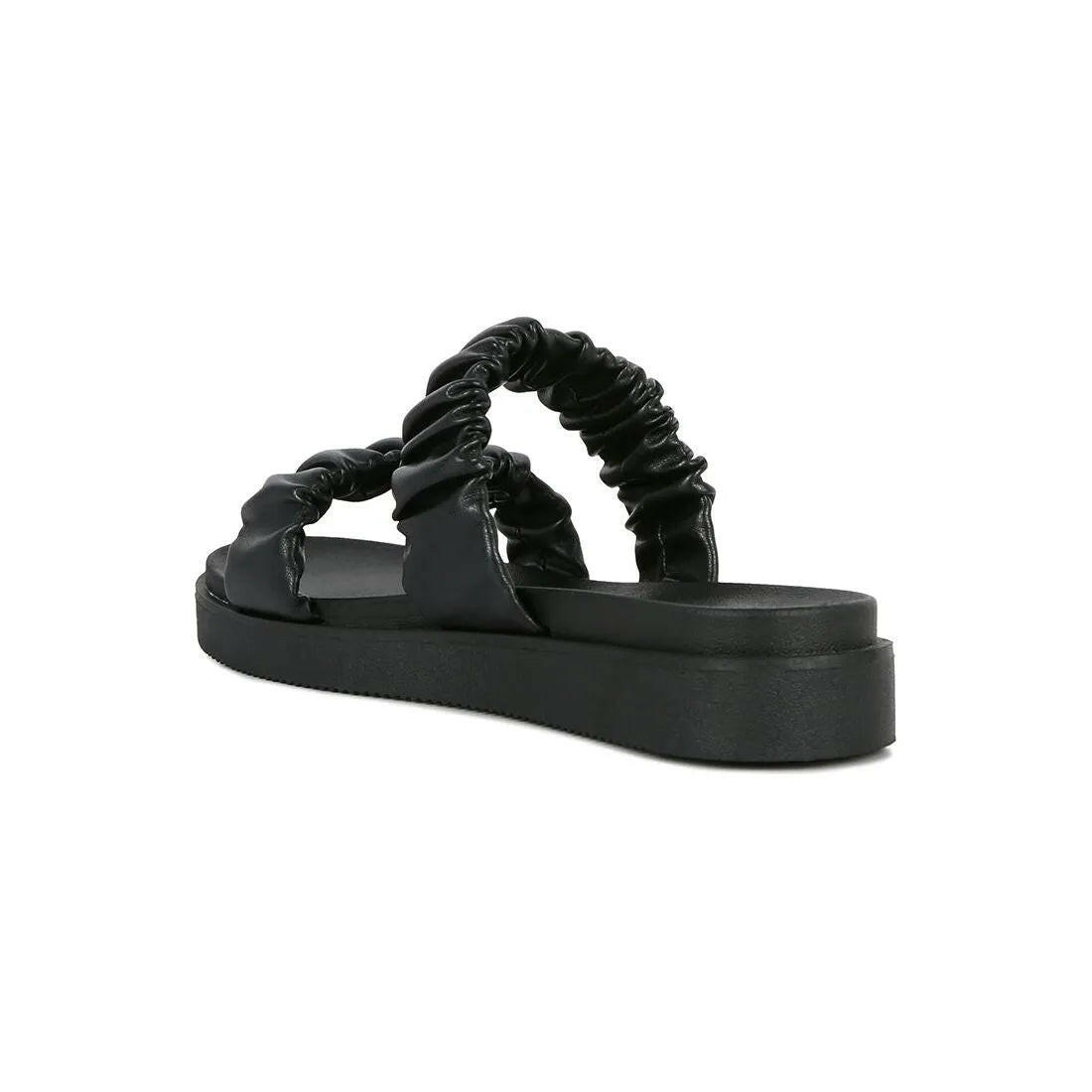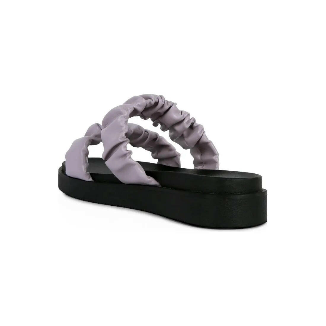 Soft and comfy, this pair of ruched strap slider platform sandals is a perfect leisure shoe. Comes with a padded insole and anti-slip rubber outsole.