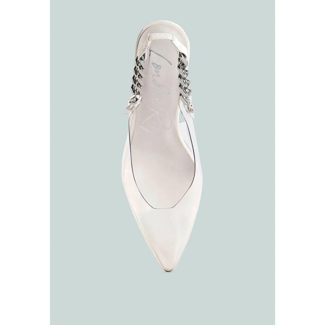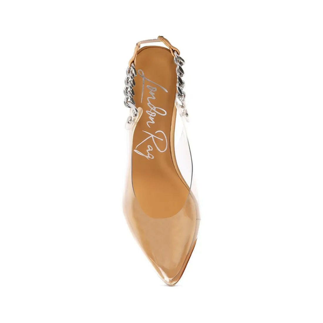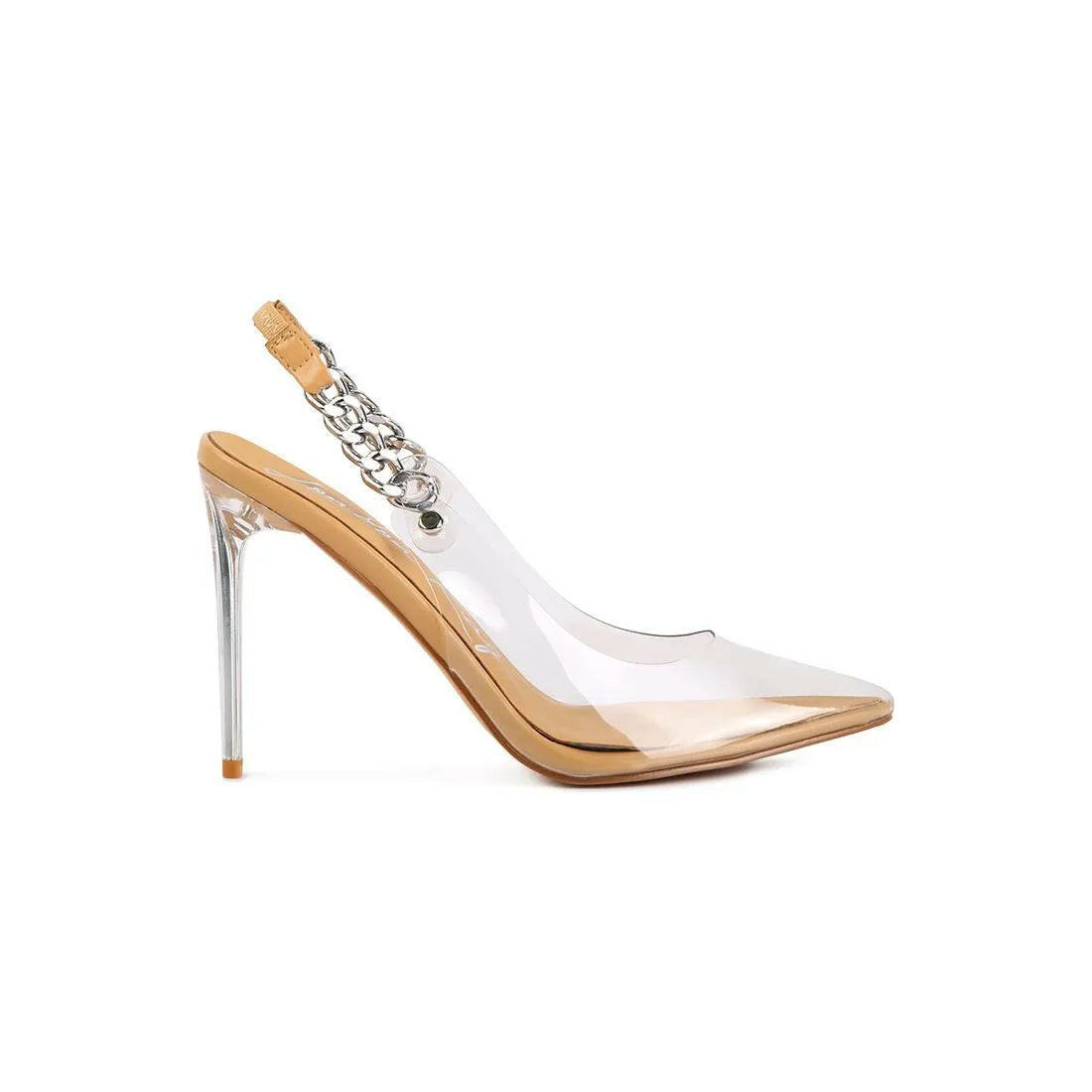 These Goddess Metallic Slingback Stilettos are all about showing some skin and keeping it simple. With a trendy clear design and a perfect touch of metallic chains, they'll hold onto your feet with their elasticated slingback.