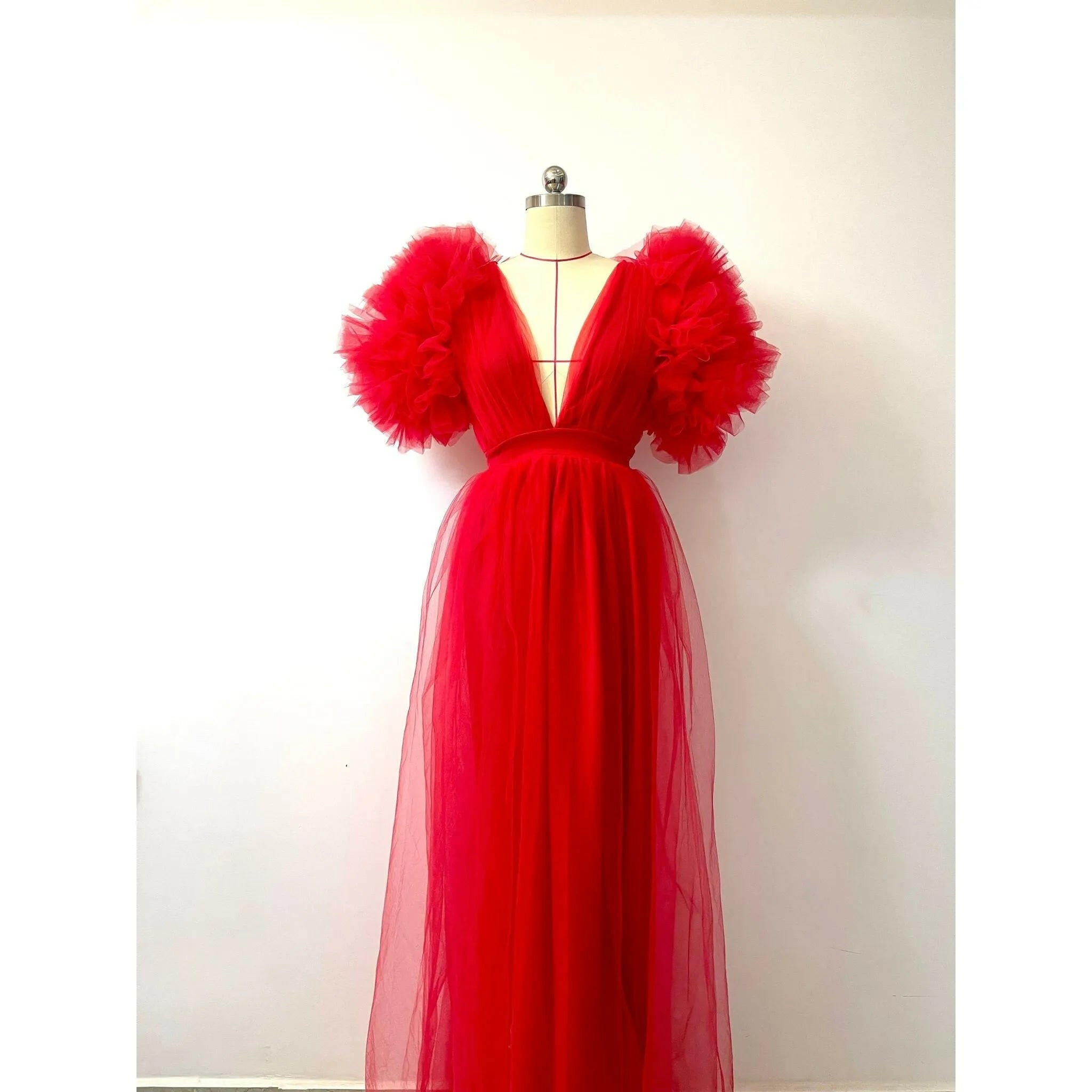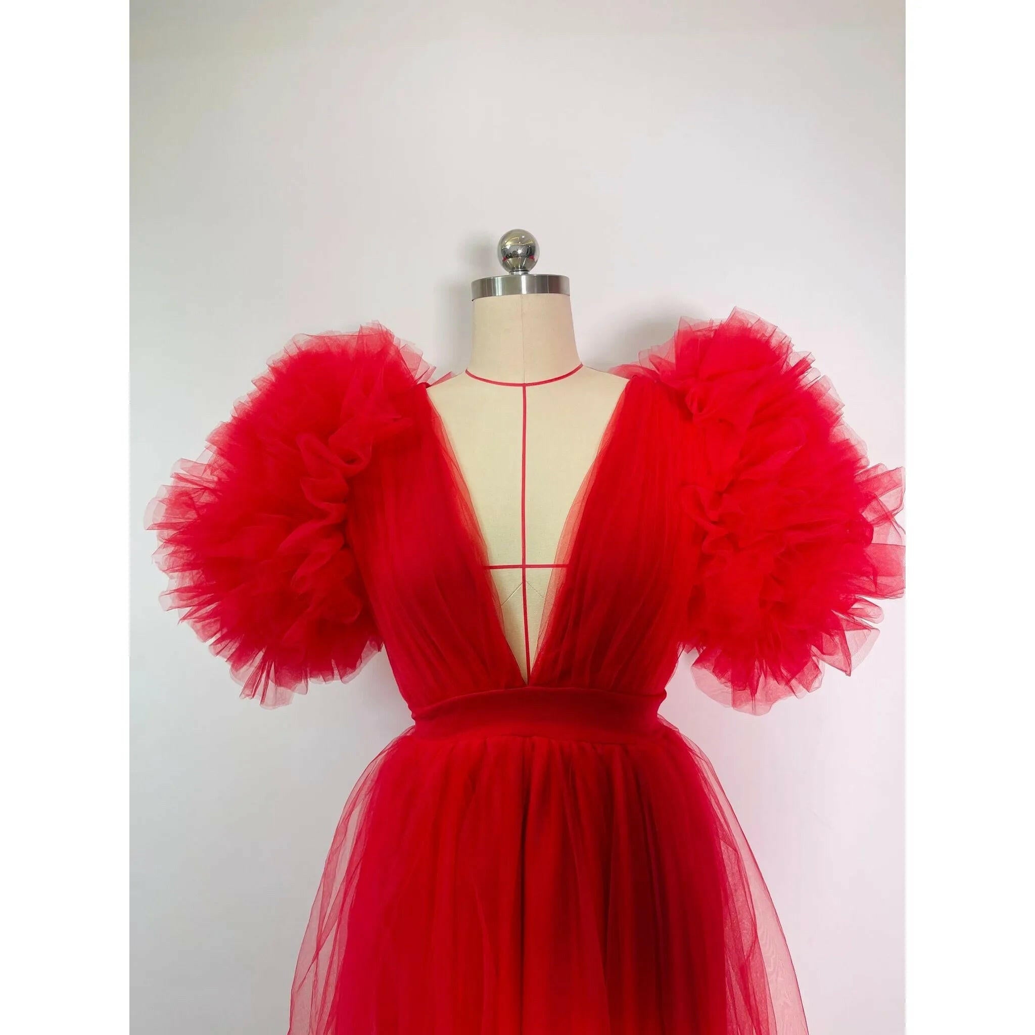 The Ixora Dress features top-notch tulle and a fully lined design with a high slit that highlights its full length, while the playful cotton candy puff sleeves add a touch of whimsy. Ideal for every girl and woman, regardless of their unique shapes and sizes. You can indicate your custom measurements and color choice in the 'Order Box' notes at checkout.