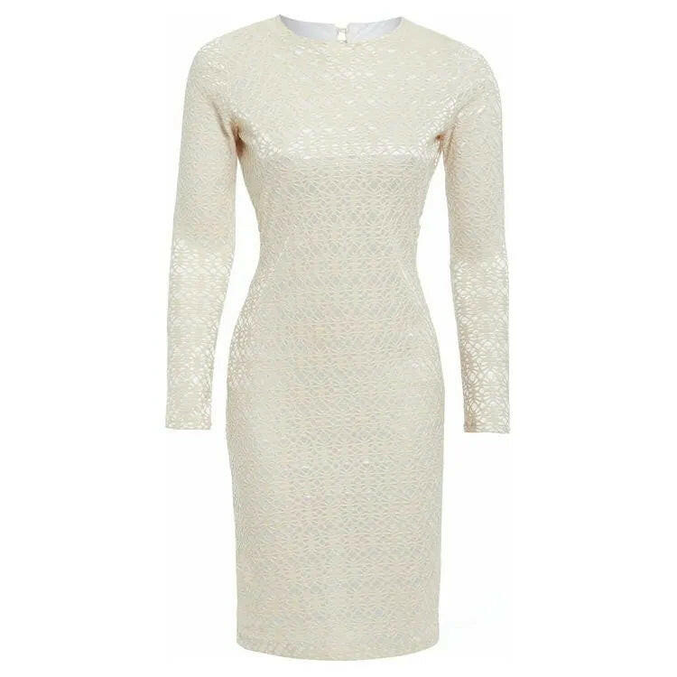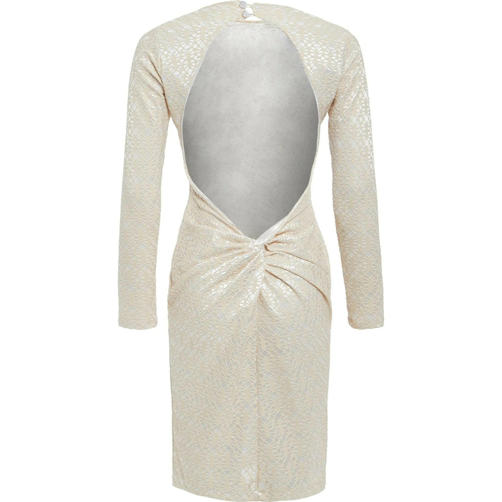 A Sarvin signature, Morena, is a stunning choice for all your glamorous evenings out. This cream backless dress is knee-length and crafted in second-skin-like lace fabric. It is cut to hug your figure perfectly. Morena long sleeve backless dress is open back with a concealed hook and eye neckline fastening and twisted detailing at the base for some extra allure.