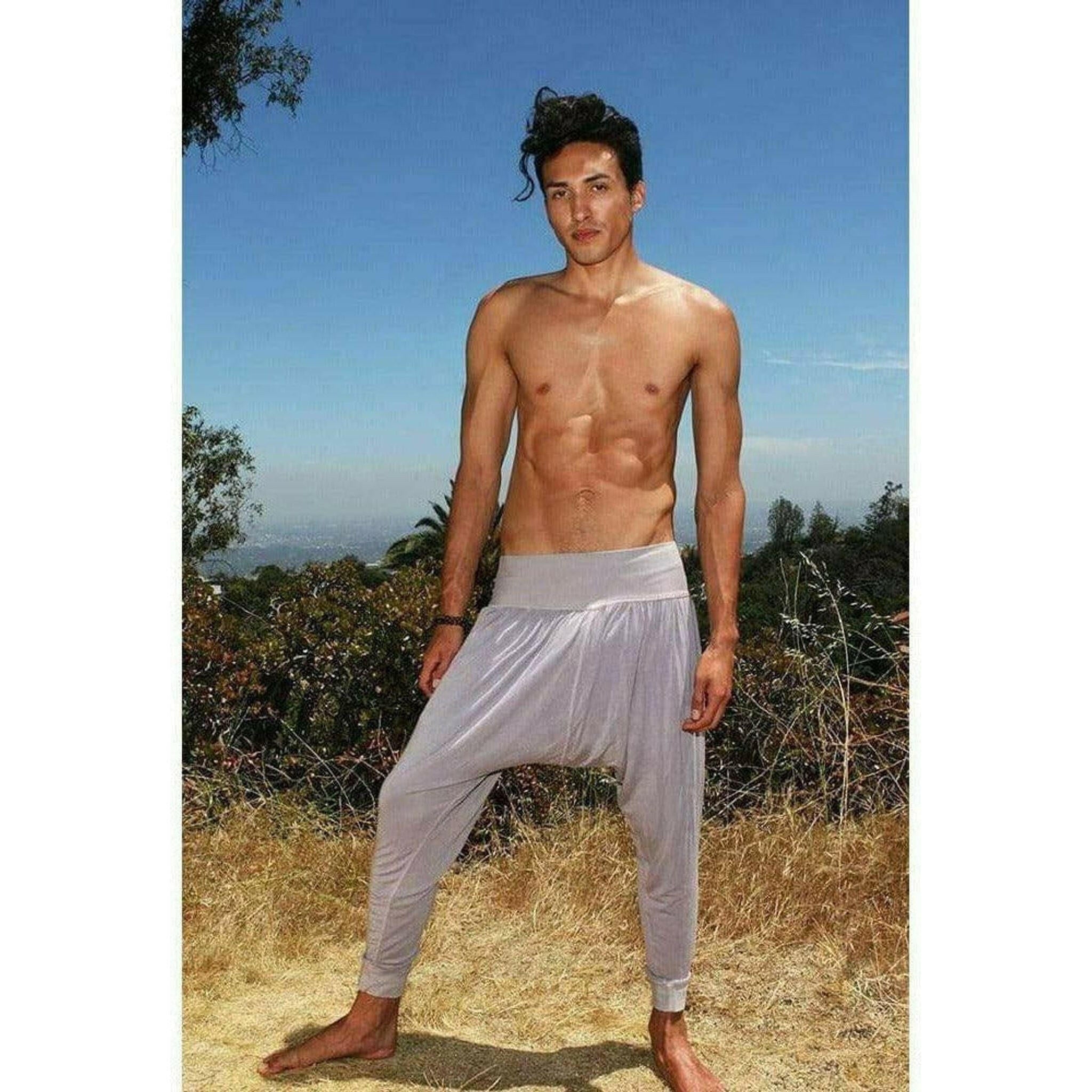 These Men's Yoga" Satya" Drop Crotch Pants have deep pockets, drop crotch and a nice thick waist band. Pants have lower ankle bands sewn in so you can push up pants to hold. Gathered edges made with rayon from organically grown bamboo for a luxurious soft, silky feel.