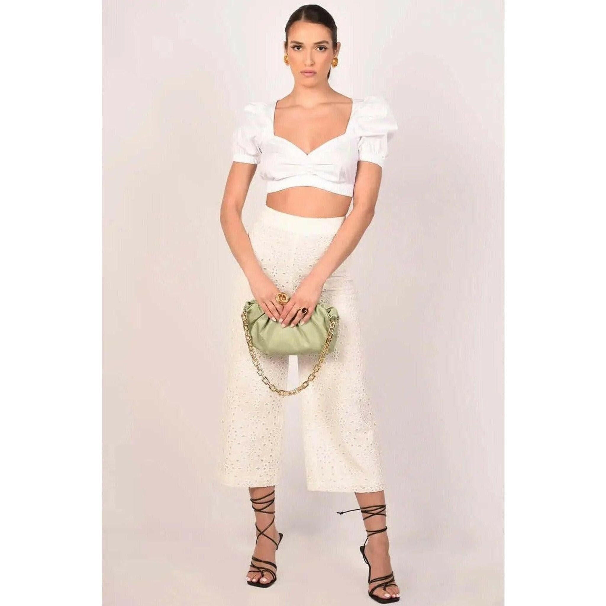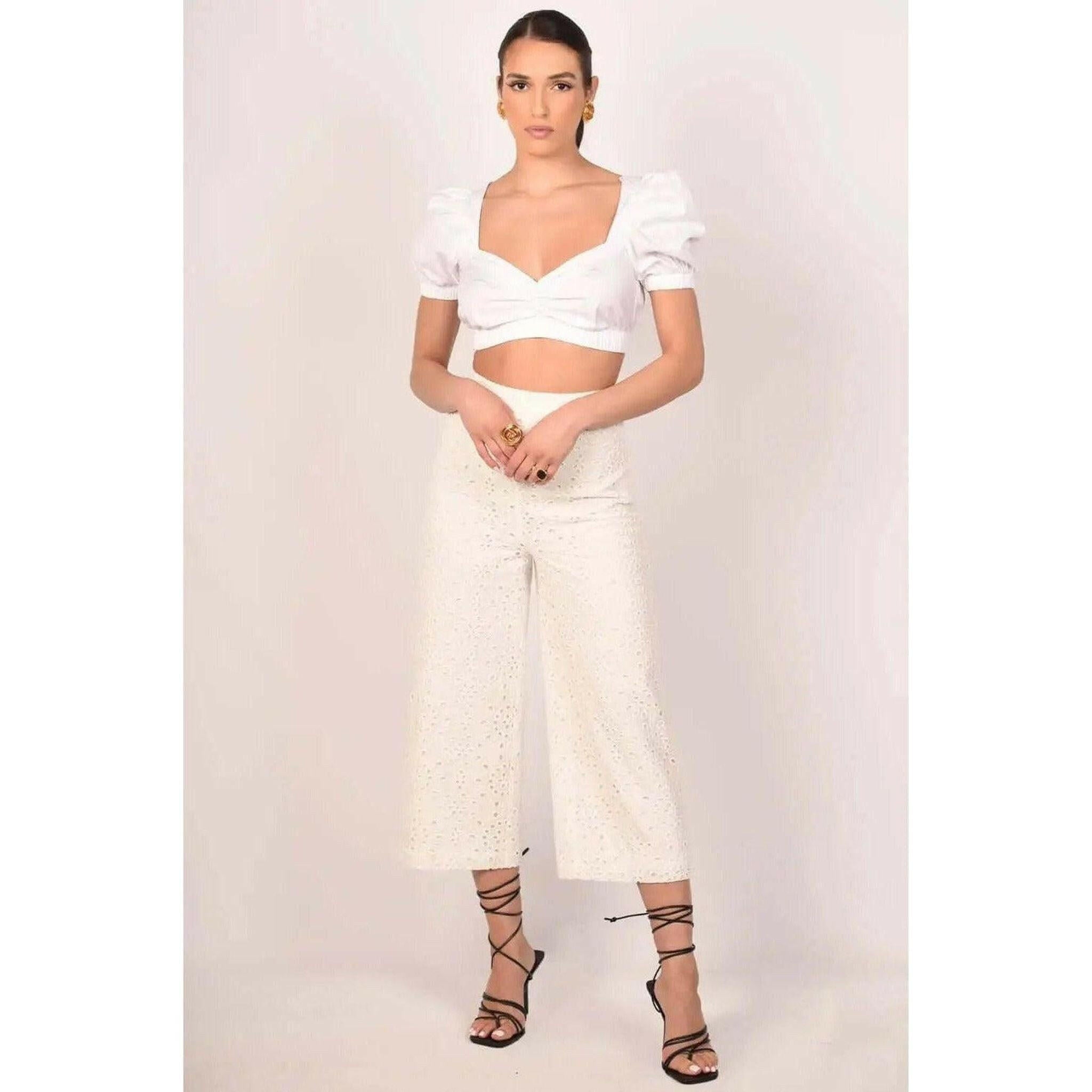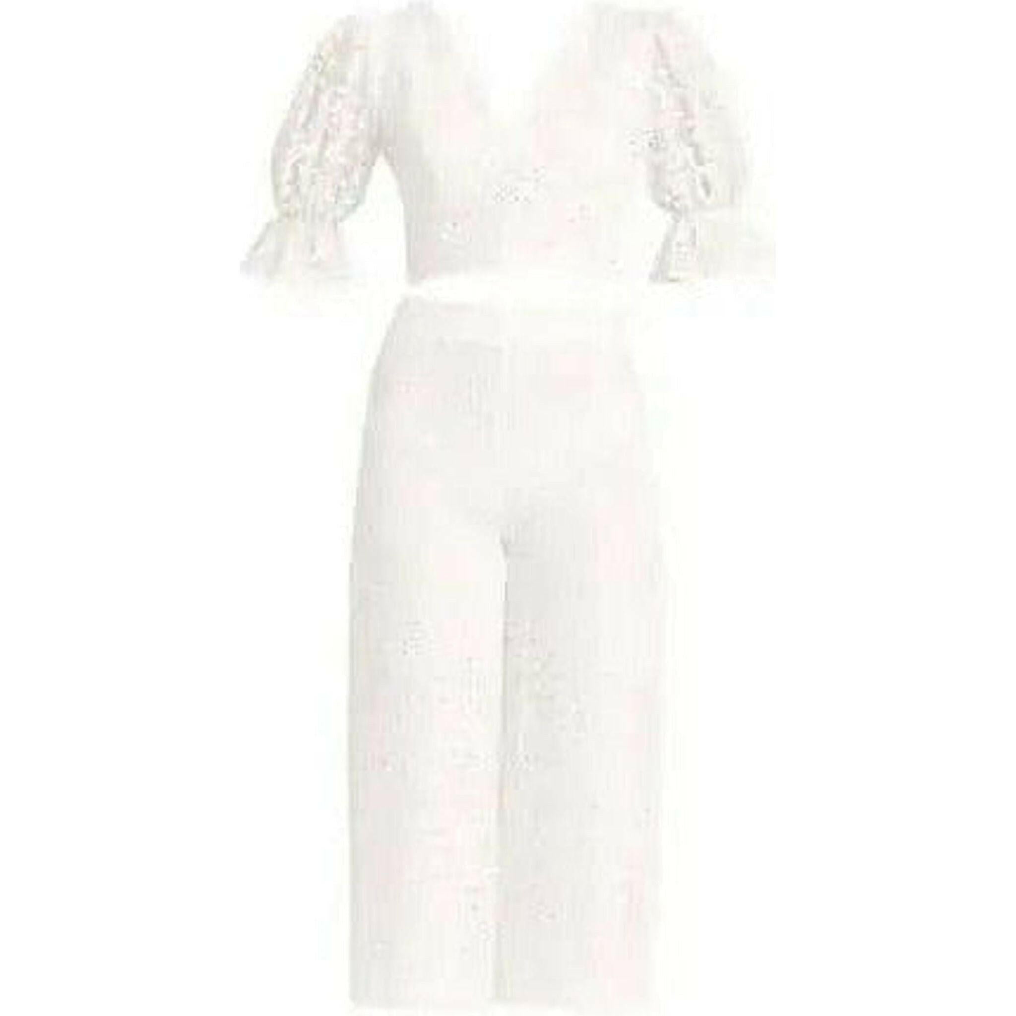 A modern ensemble crafted with an eyelet fabric in classic white color.  The pants have a fitted silhouette contrasted with wide hems.  Not sold as set.
