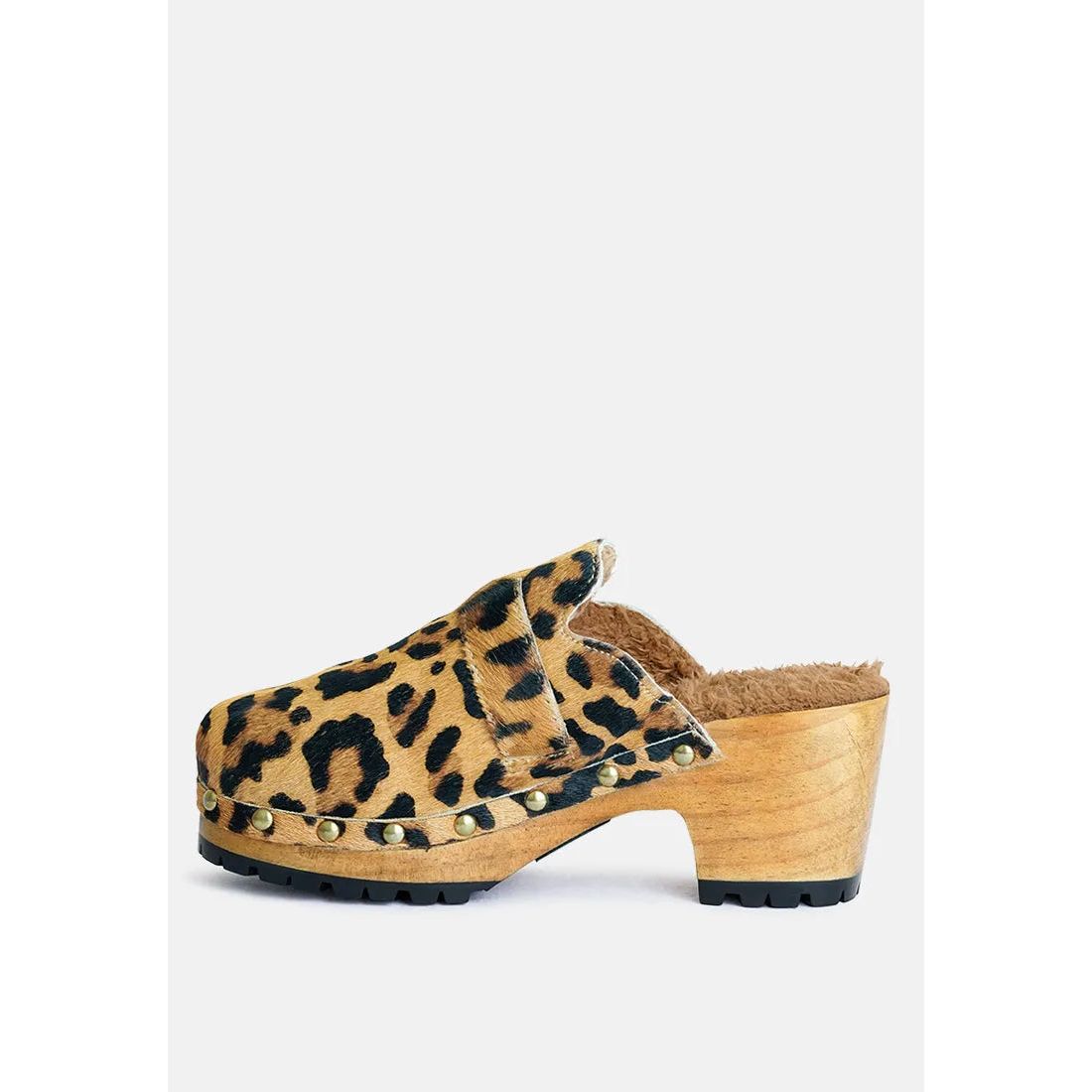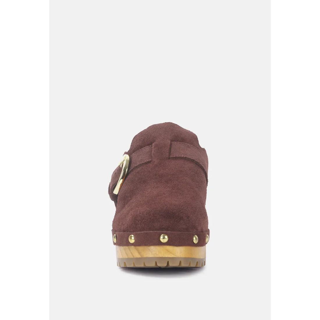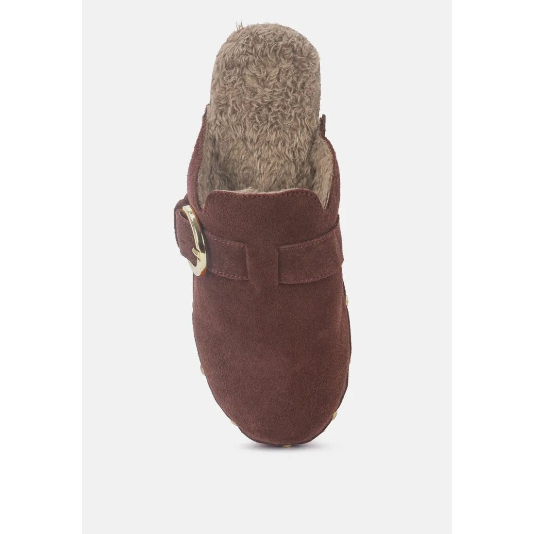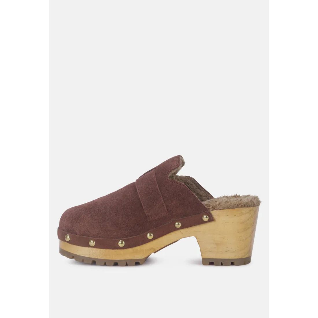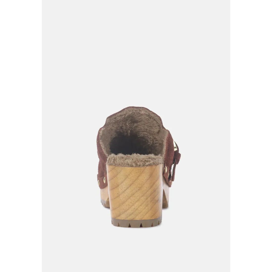 The carefully handcrafted wooden mule clogs have fur on insole lining keeping feet warm and at comfort. Fine Suede lined with sparkling studs and with quality metal buckle is a head turner. The round toe mule clogs have an anti-slip durable outsole that keeps you protected on all surfaces. Superbly stylish, available in limited quantities with ethically sourced fine leather suede.