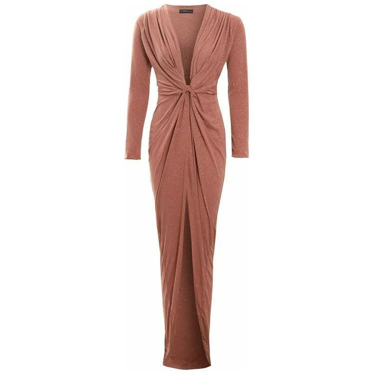 Clara black twist front dress shapes and skims your curves. This front knot dress features a long sleeve and a floor length. Made from glitzy glitter fabric for extra sparkle and is cinched in at the waist with a sophisticated knot design. Clara's plunging neckline and tantalizing high slit make it a must-have for glamorous evenings out.