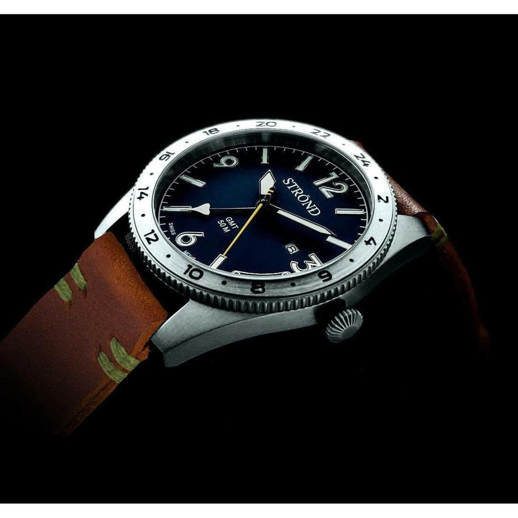 Comes with the handmade, gorgeous rustic brown calfskin leather strap, and a blue NATO strap made from seatbelt material, both with quick release spring bars for ease of strap removal.