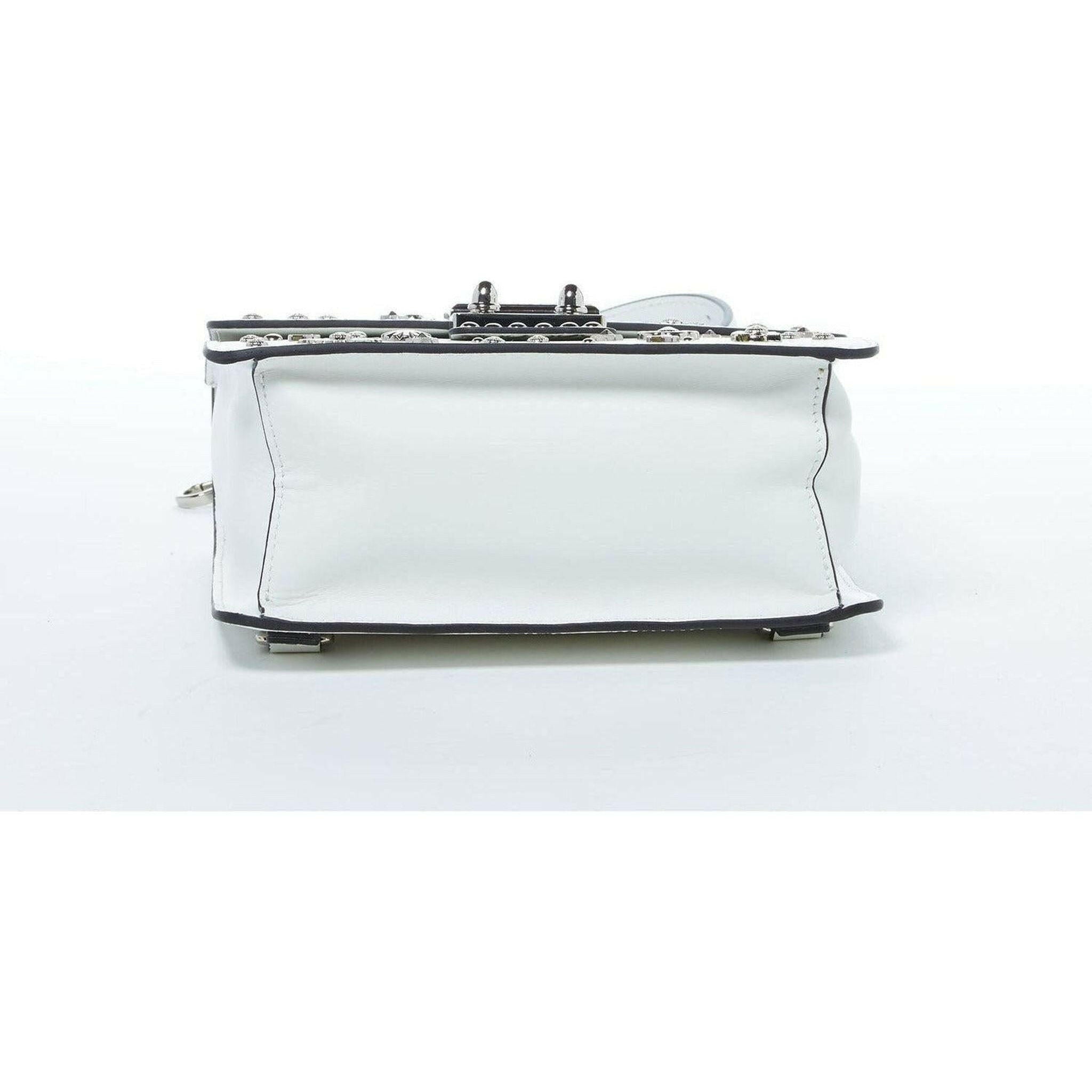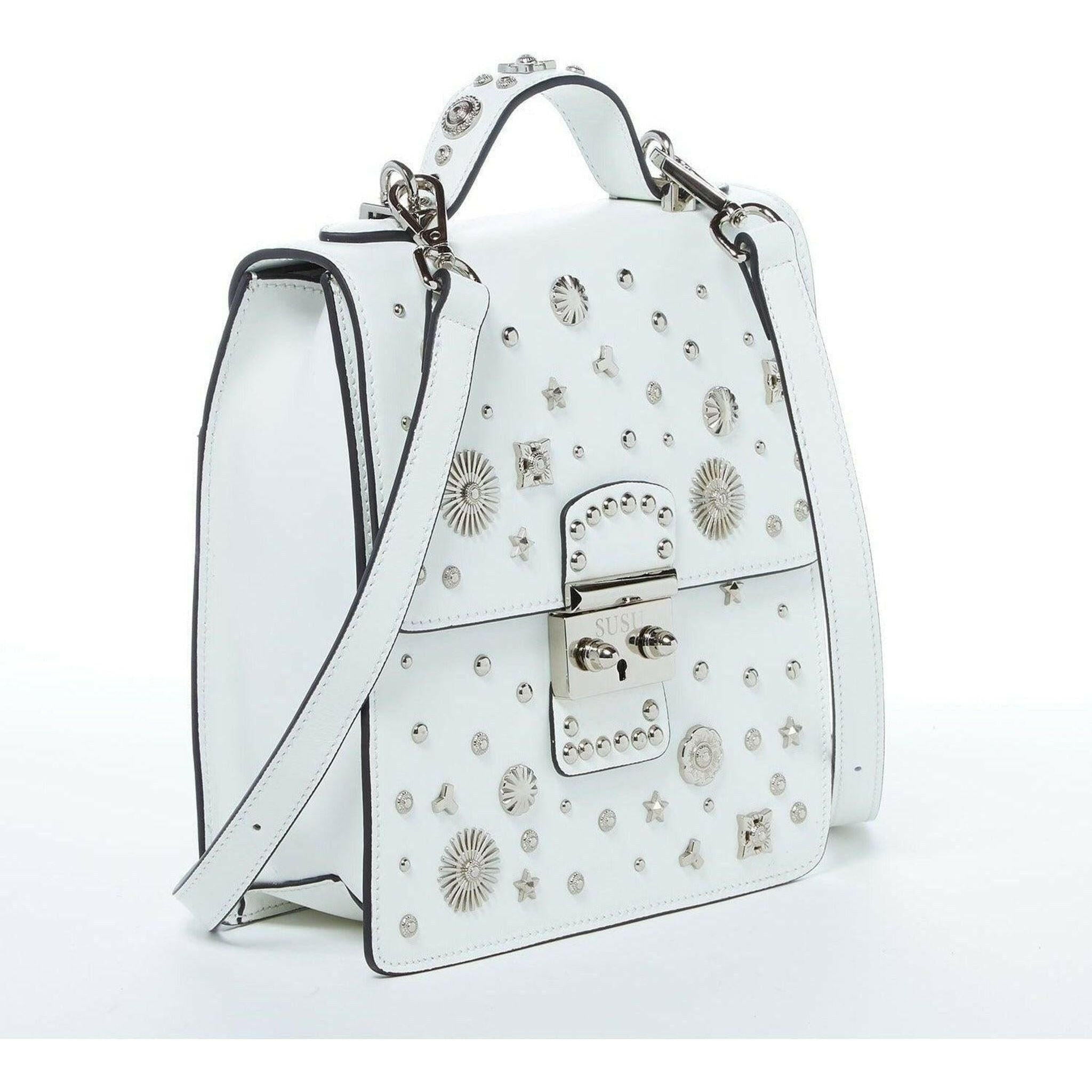 The signature Hollywood design comes in the form of a fashionable backpack! Featuring a boxy shape complemented by adjustable straps that not only move with you but also allow you to wear it as a crossbody or as a shoulder bag! Secured by a polished silver metal push lock on the front flap, a spacious interior with one zipper and one pouch pocket and a designated exterior back pocket. With carefully selected silver appliqués sitting atop vivid white leather, this backpack purse
