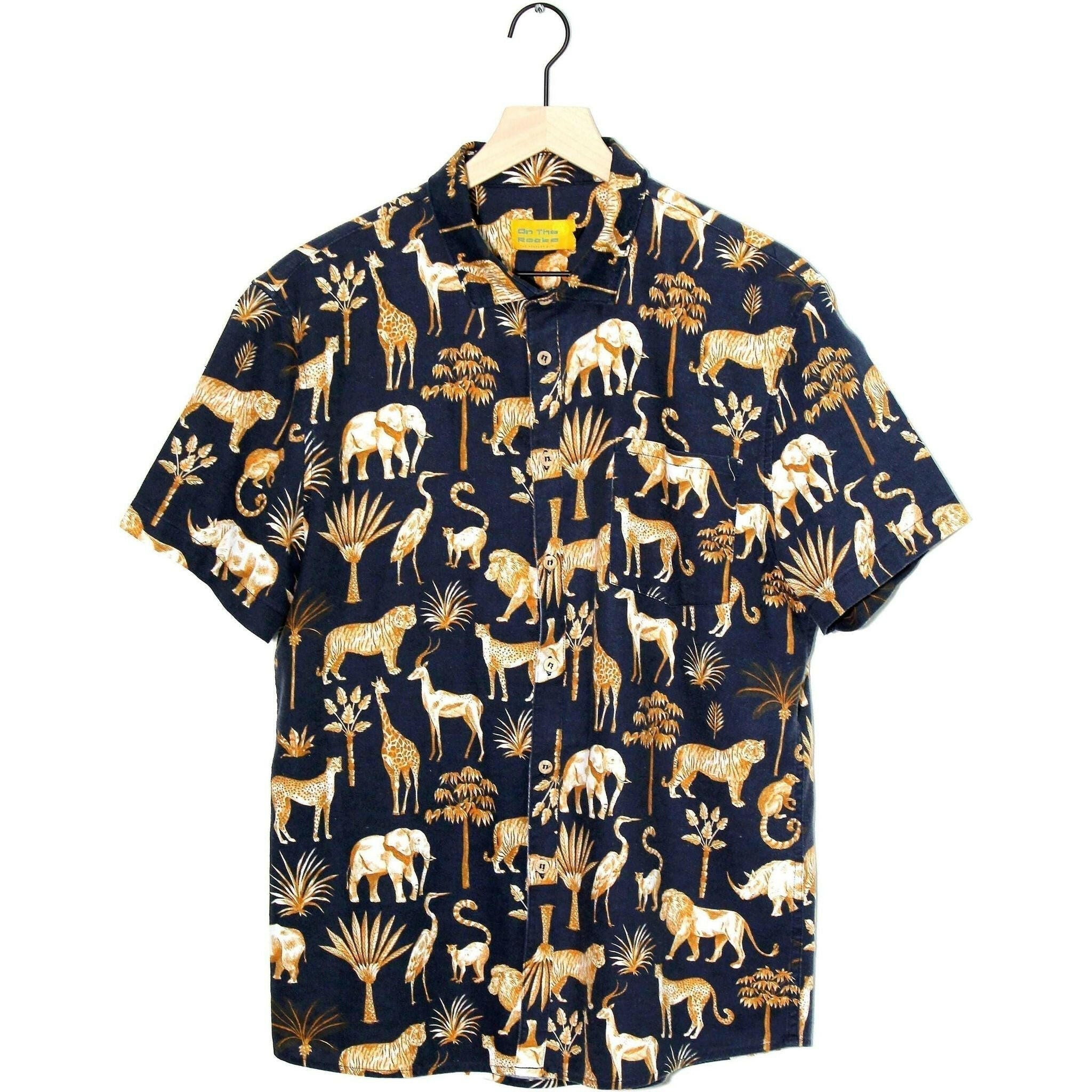 The elegant Mombasa jungle print shirt with its rich blue, cream, and tan color palette. This perfect cut shirt is tailored to maximize the look of your upper arms, shoulders and chest, while keeping you feeling cool and comfortable. Our ultra soft, lightweight, drapey linen viscose blend will leave you refreshed at the hottest of social gatherings.