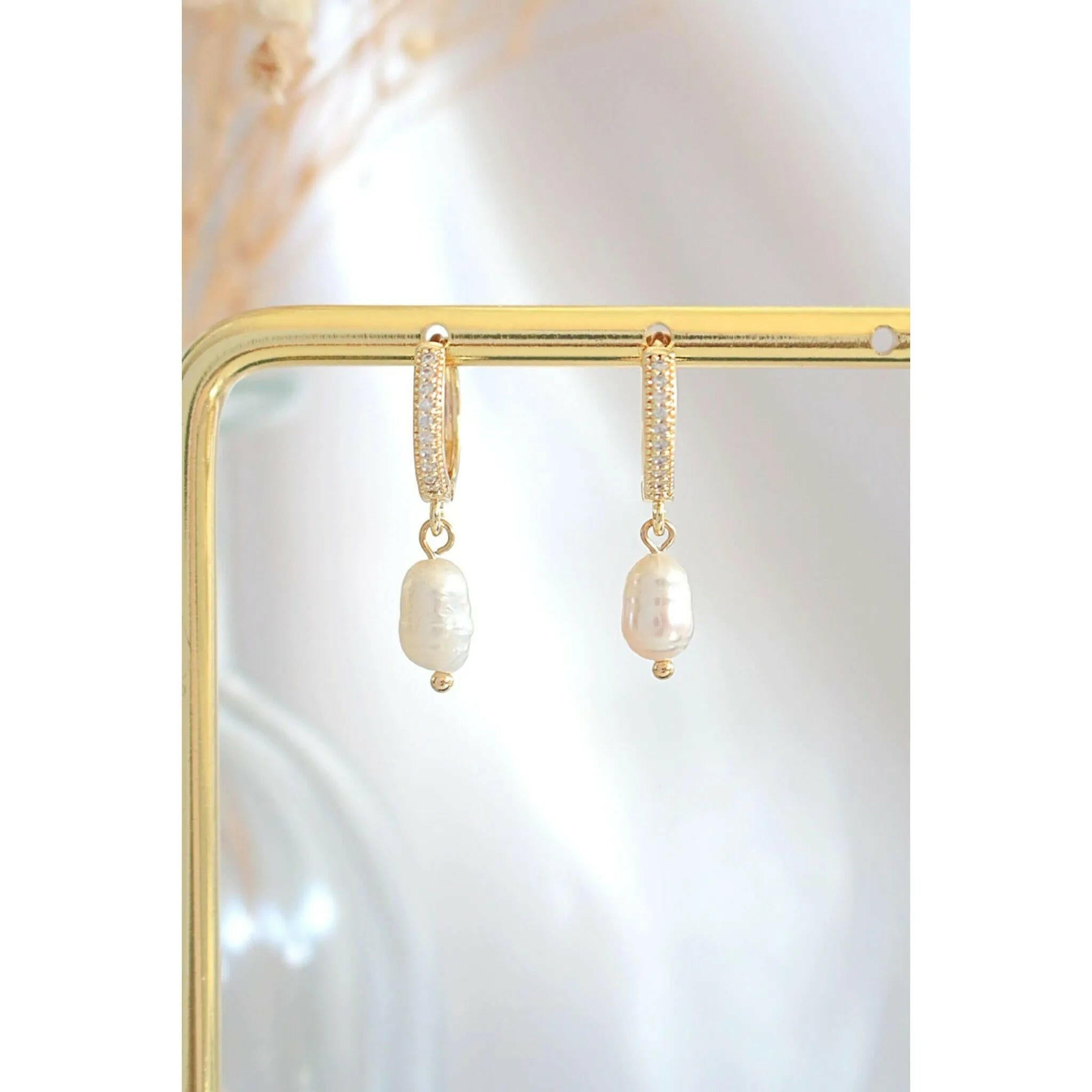 Elegant and dainty pearl hoops made with genuine freshwater pearls. These pearl hoops earrings are made of stainless steel plated in 24 karat yellow gold and inlays with colorless cubic zirconia stones and dangle drop of genuine freshwater pearls that give it a natural and unique touch. Thanks to its minimalist design, it is very versatile and can be perfectly combined with elegant, minimalist, casual, effortless and aesthetic outfits.