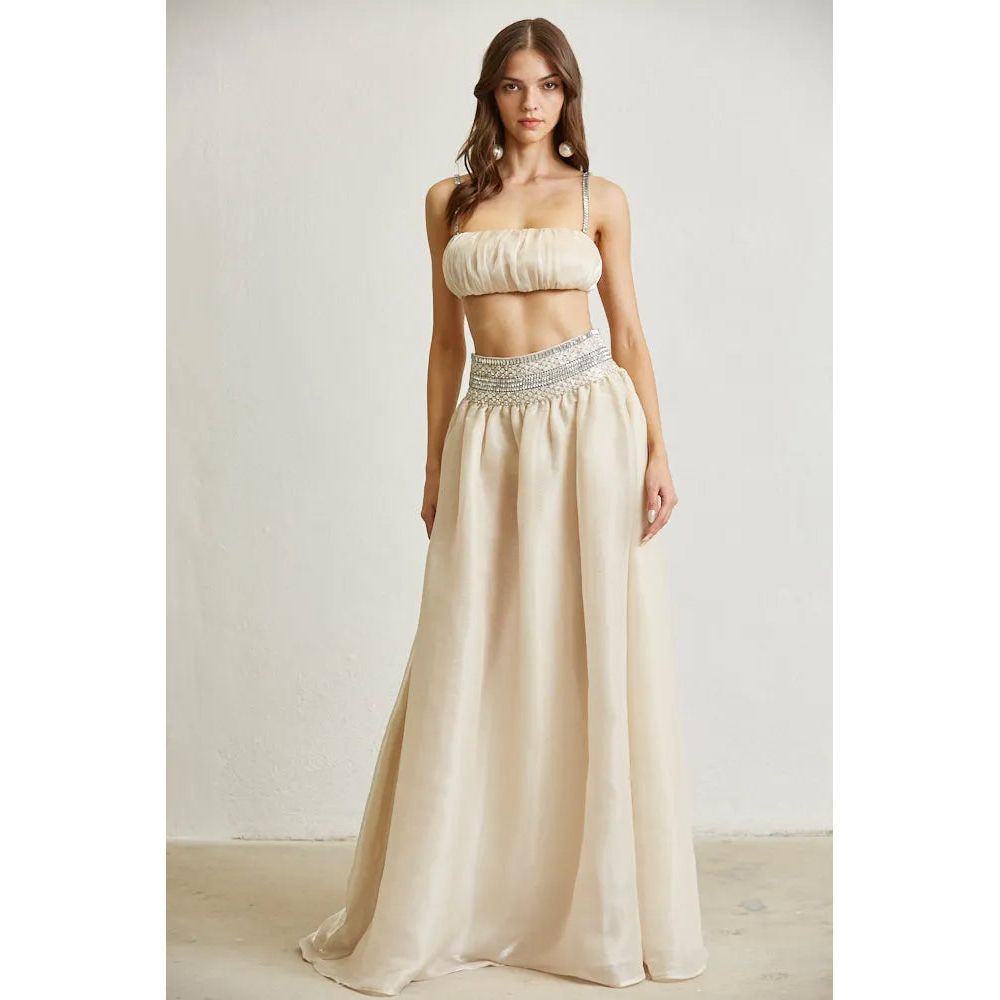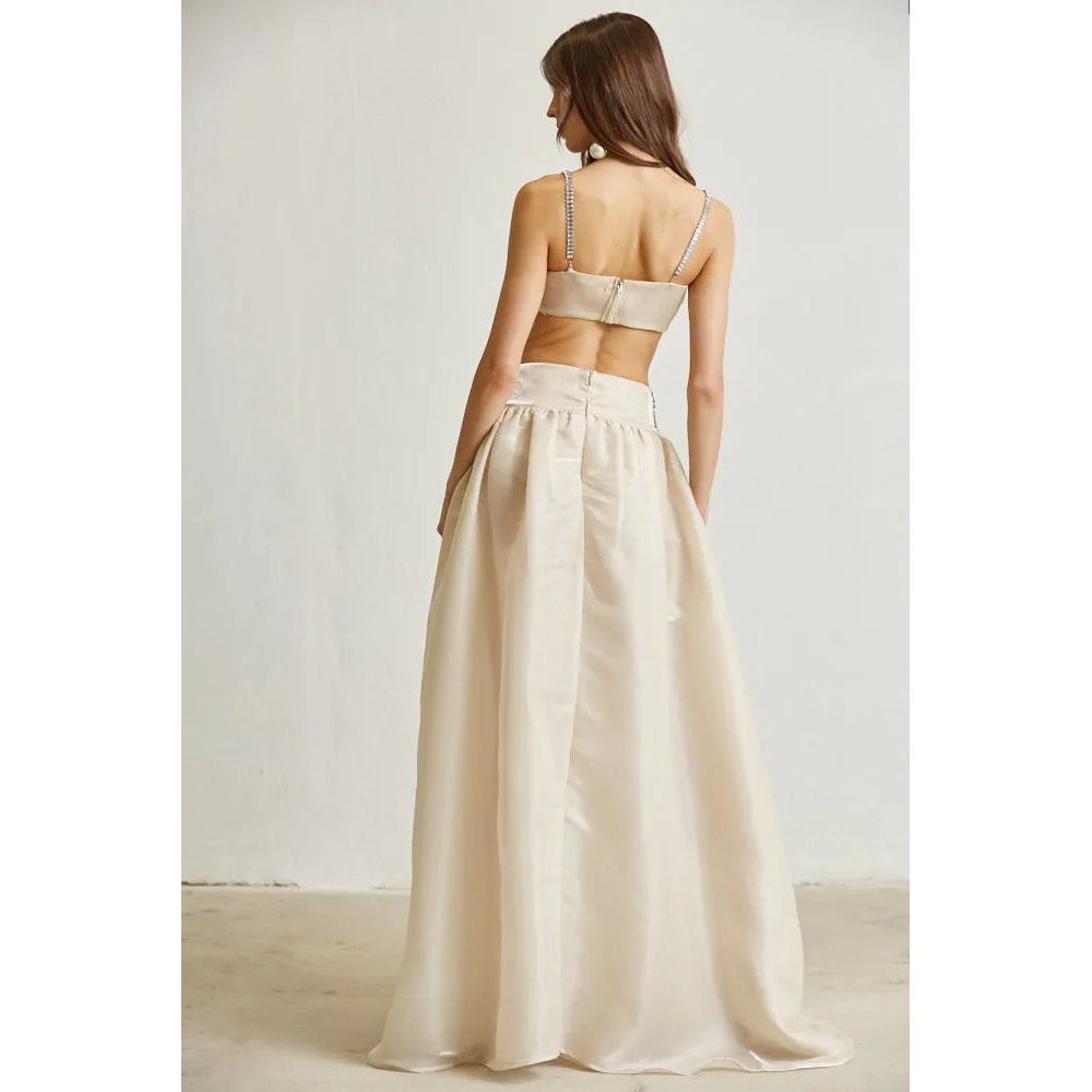 Dress up in iridescent organza with this top and skirt set! Featuring shoulder straps with rhinestone trim, a ruched bodice and padded cups, an exposed zipper at the back, and a maxi skirt with rhinestone detailing and pockets. Finish off the look with a double layered skirt with a high waist and a hidden panty underlay. Can you say fabulous?!