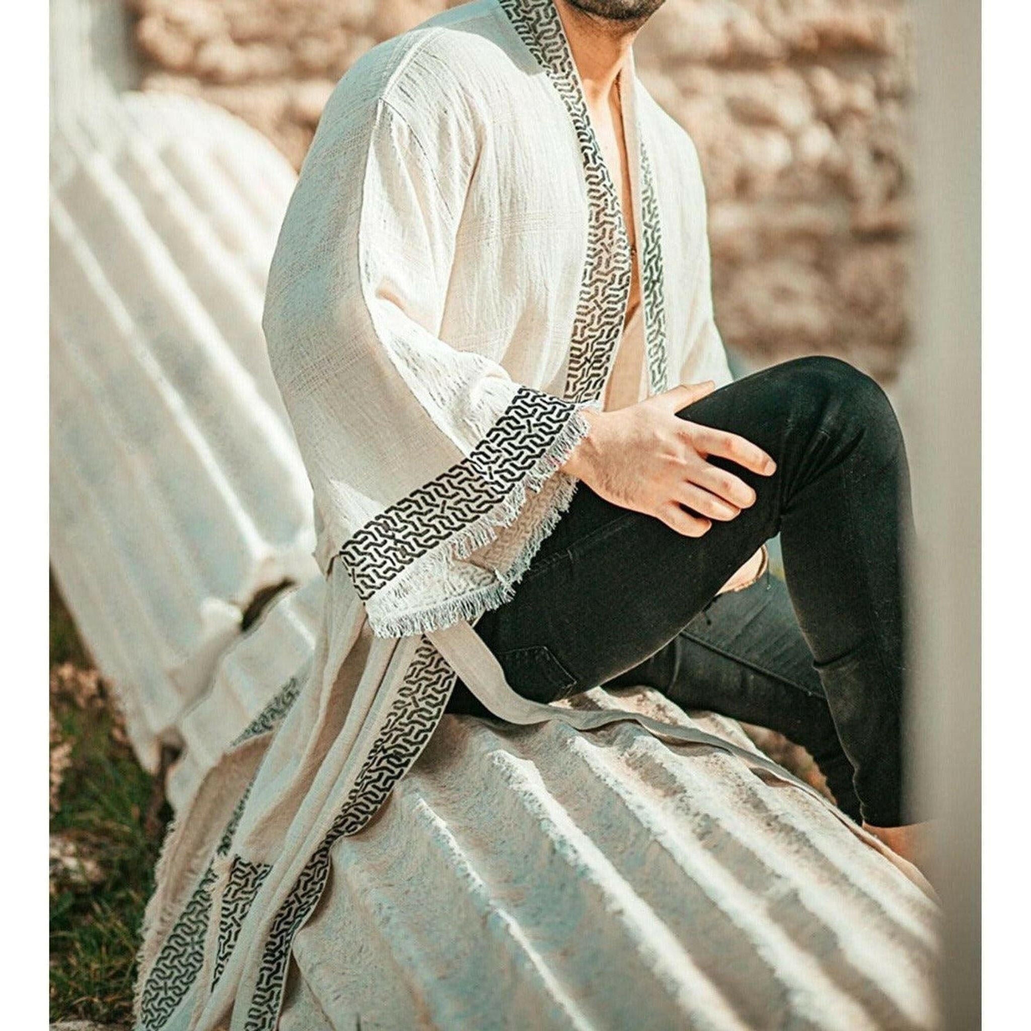 This unique kaftan kimono is produced from natural linen fabric woven by hand in old style hand looms. The pattern was applied by hand by printing from wooden molds. Oeko-Tex®100 certified organic dyes are used in printing. Patterns do not fade as they are washed. Linen is considered a pure material with its antimicrobial properties and smooth texture.