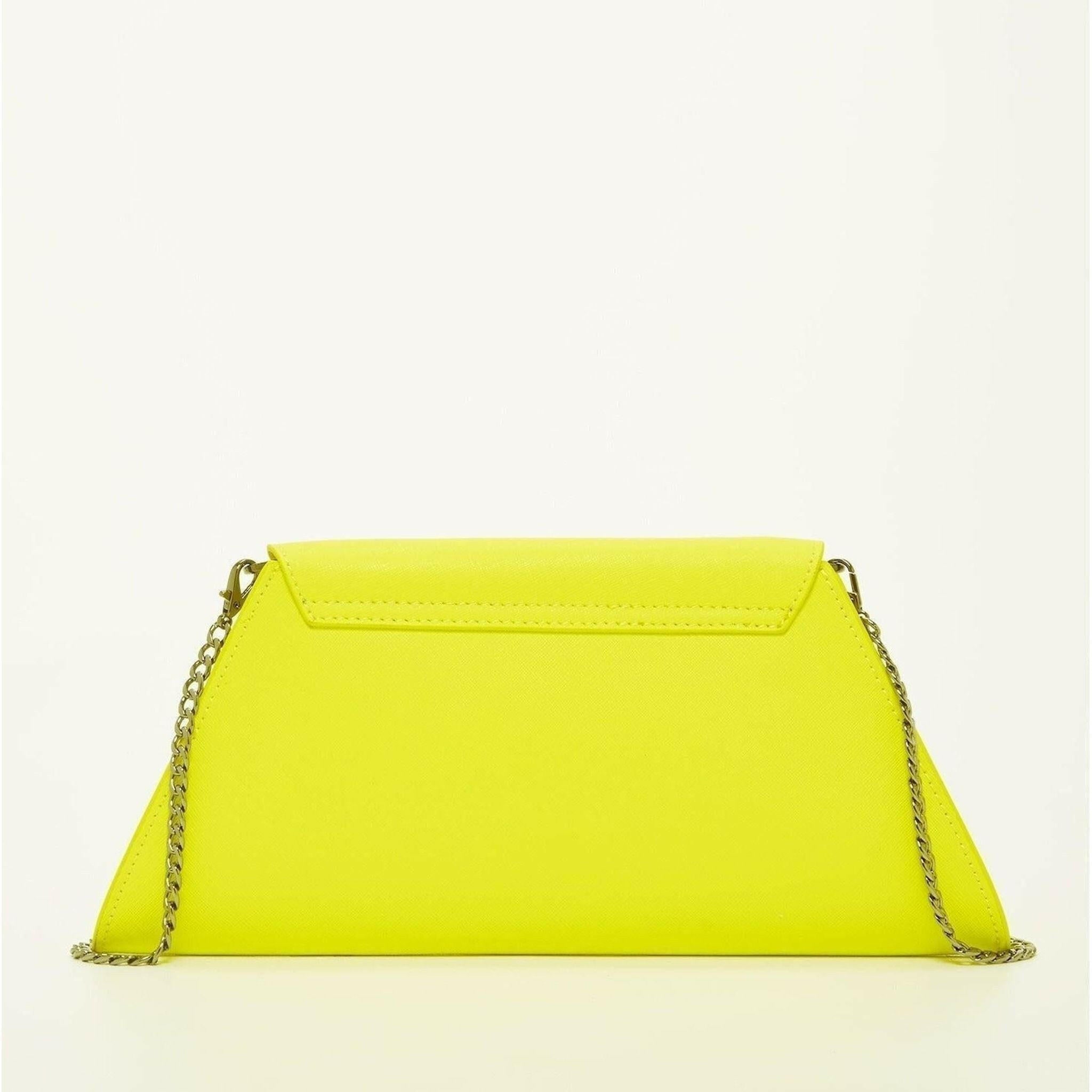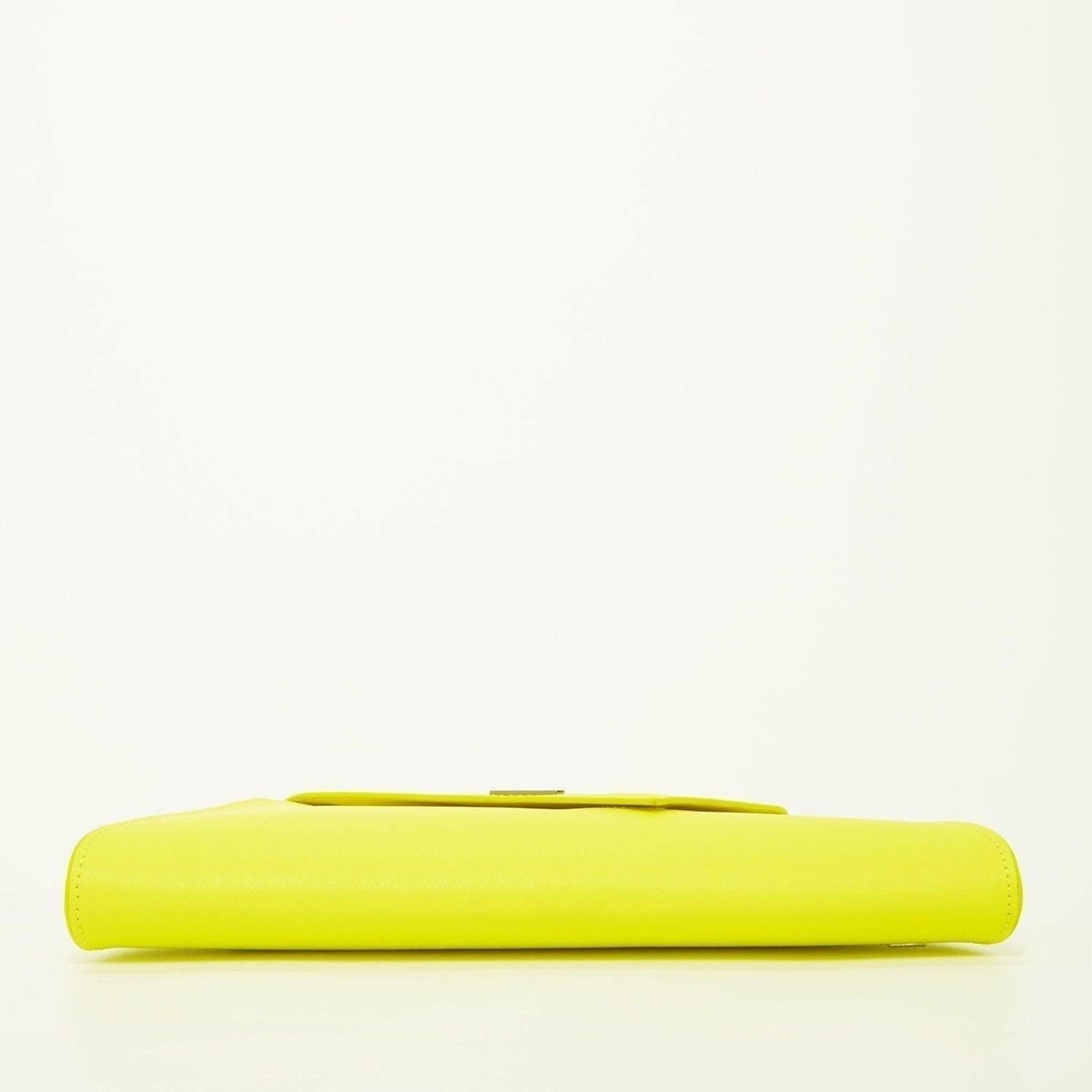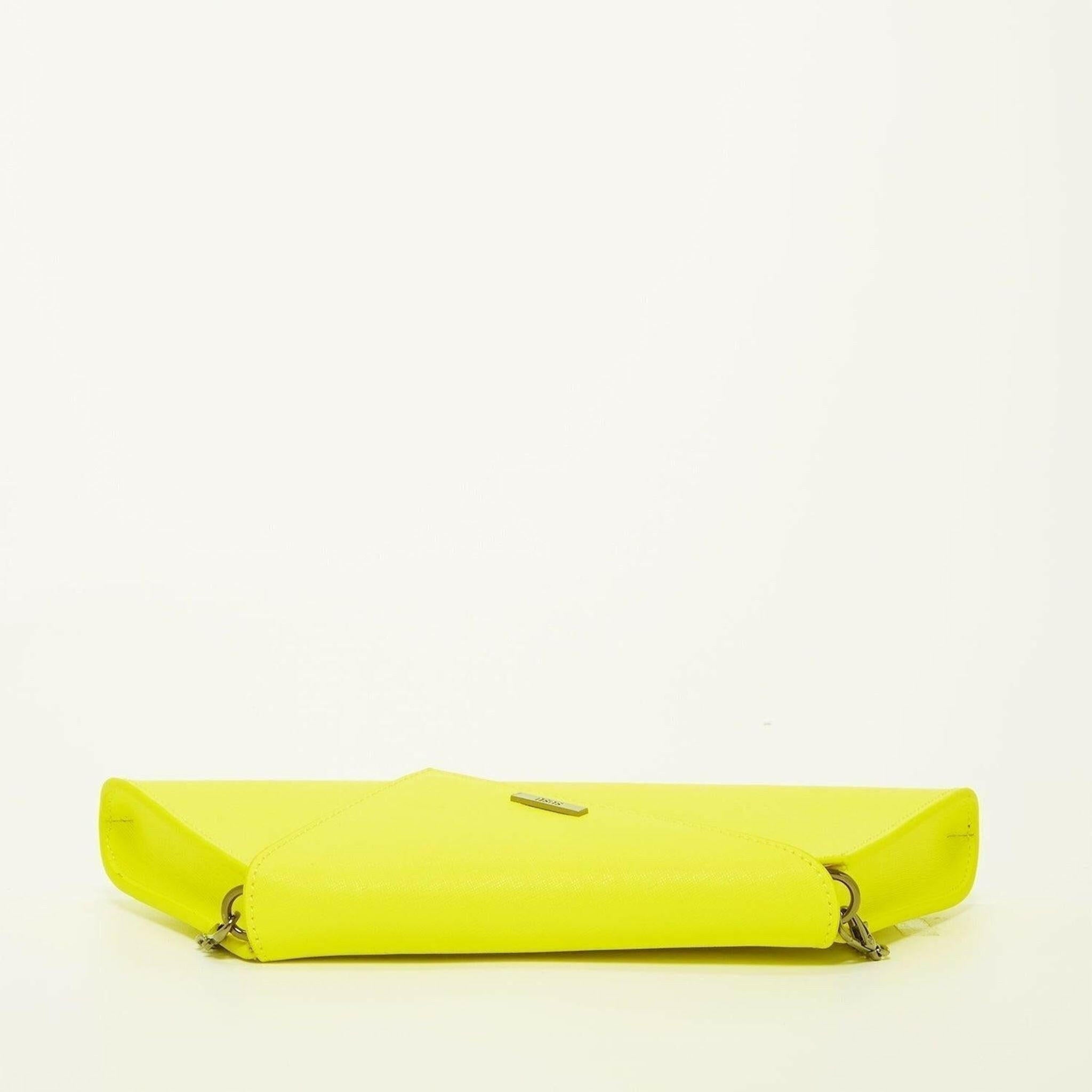 The Angelica is a sleek lime yellow evening bag made from crosshatched bright color time leather and is accented with a diagonal flap. It has a fabric lined interior with a zipped pocket and a zip closure at the top. With a removable chain strap, it can be worn over the shoulder or as an envelope clutch. This yellow leather clutch bag will be your go-to day to night designer handbag and evening clutches for a wedding.