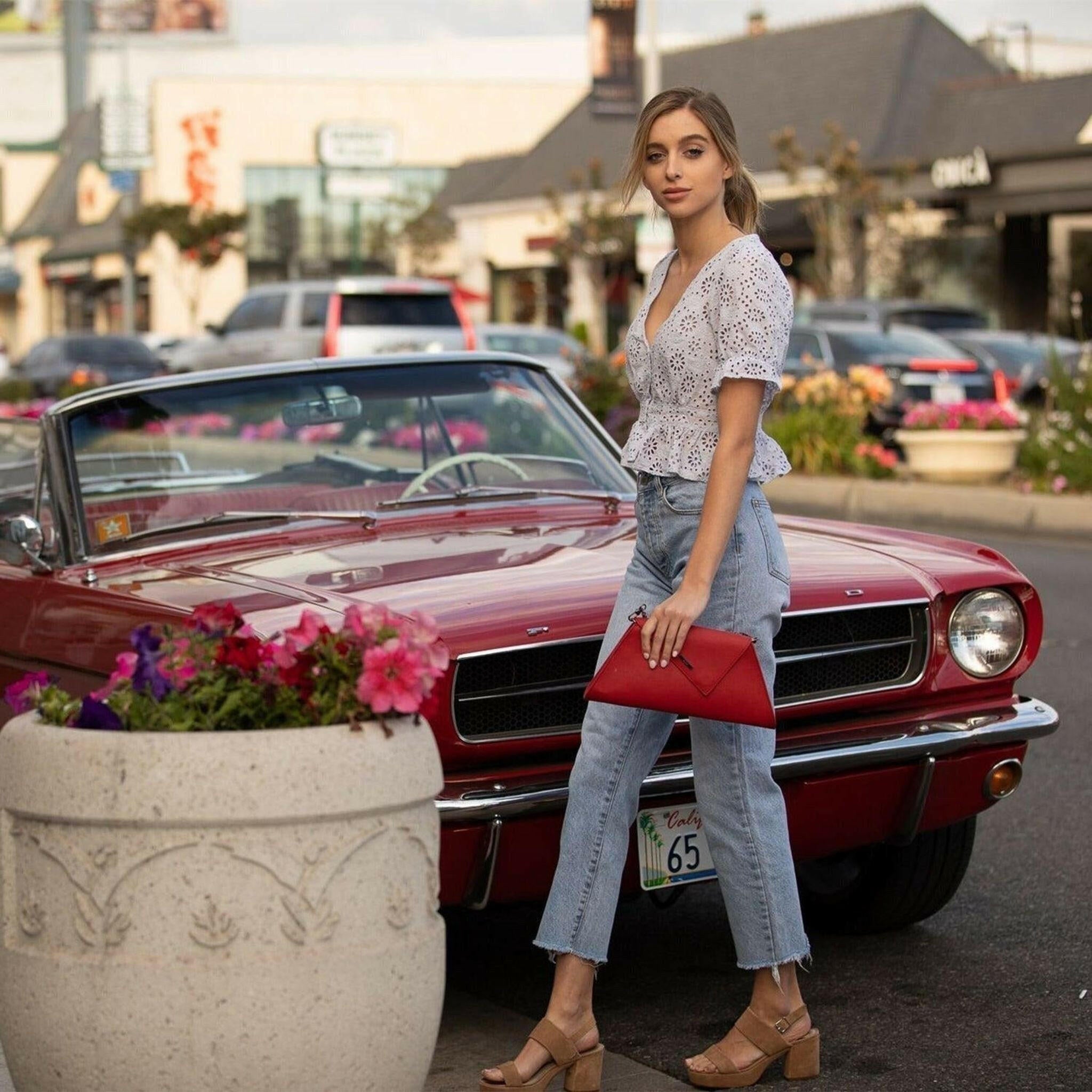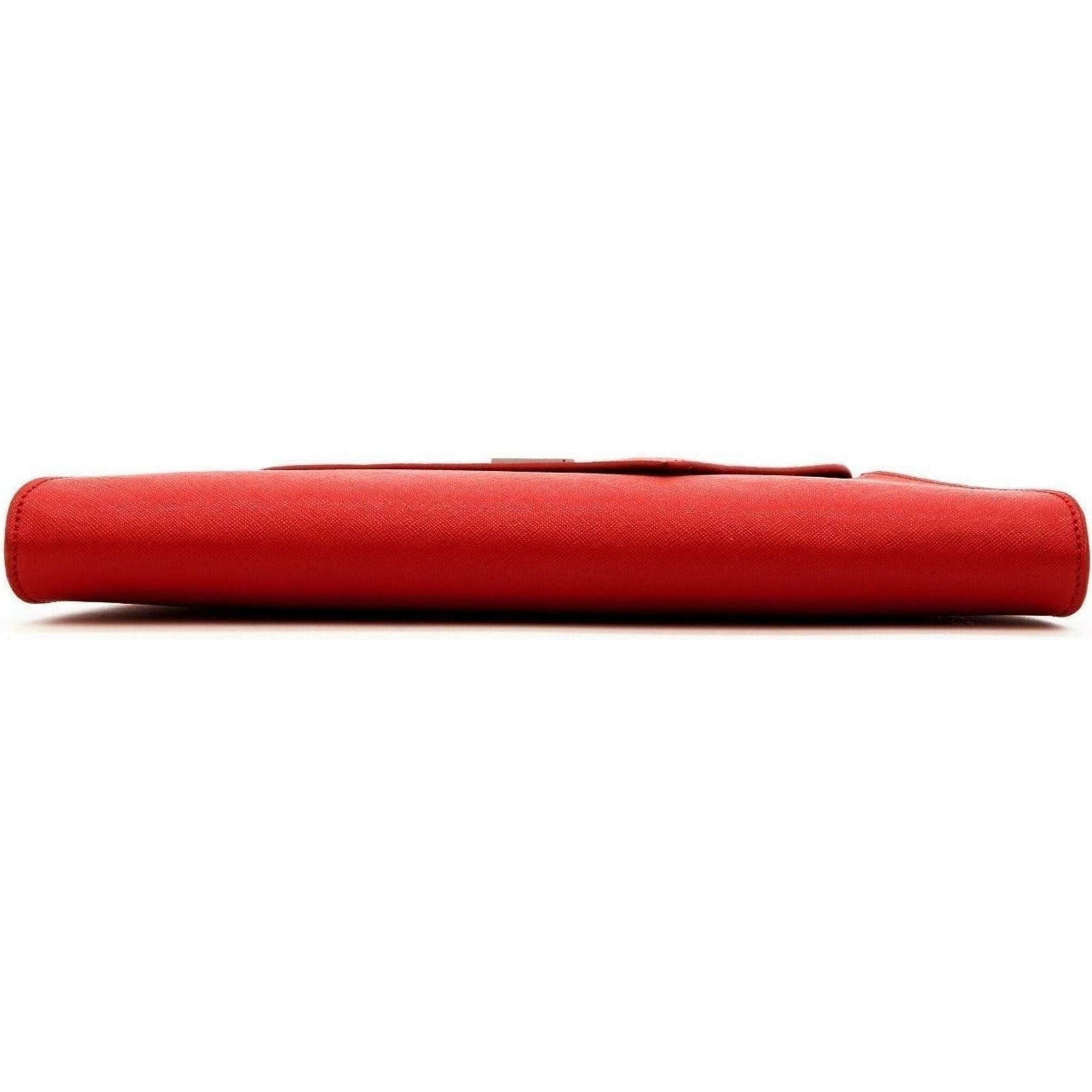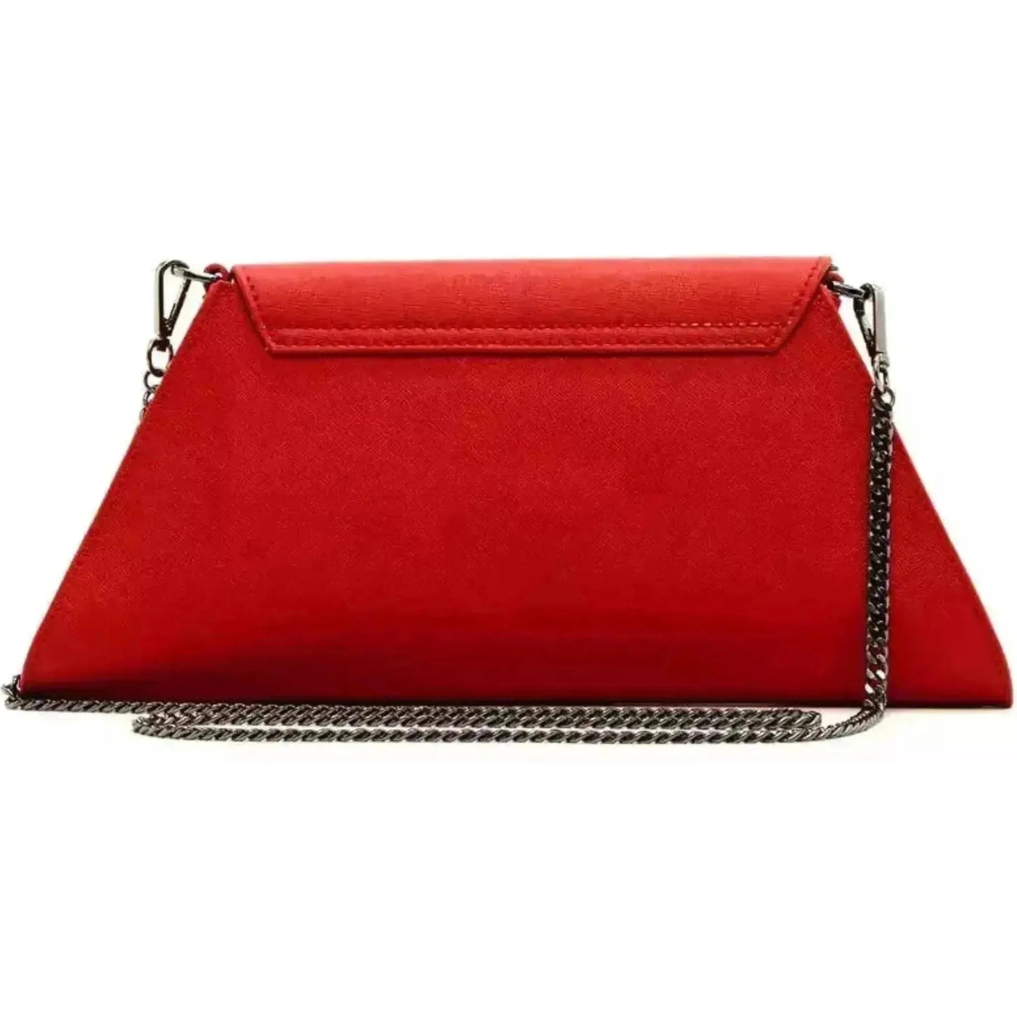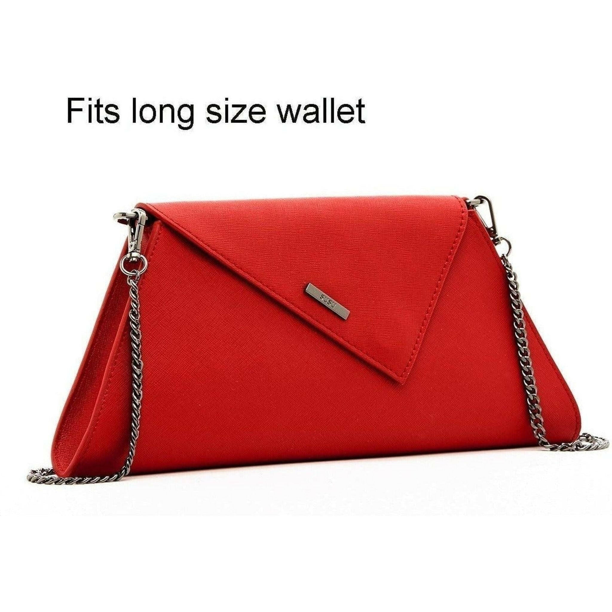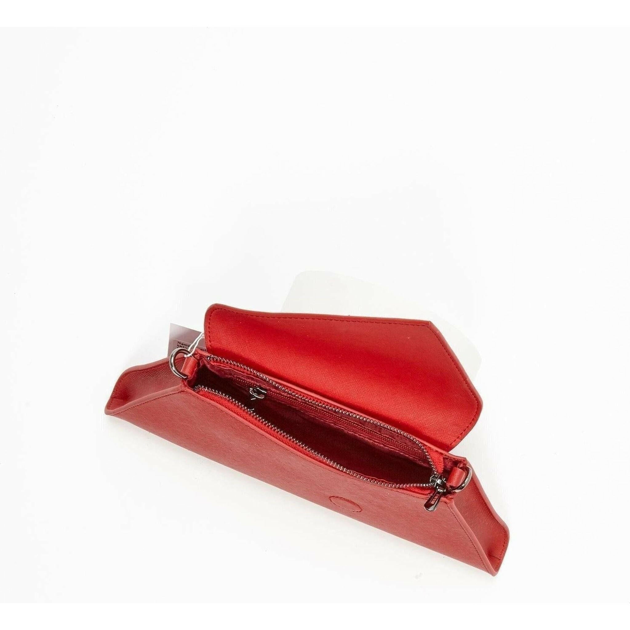 The Angelica is a sleek red purse leather bag crafted from crosshatched leather and is accented with a diagonal flap. This women's evening bag features a fabric-lined interior with a zipped pocket and a zip closure at the top. With a removable crossbody chain strap, The Angelica can be worn over the shoulder or as a chic clutch. This will be your go-to day to night designer handbag.