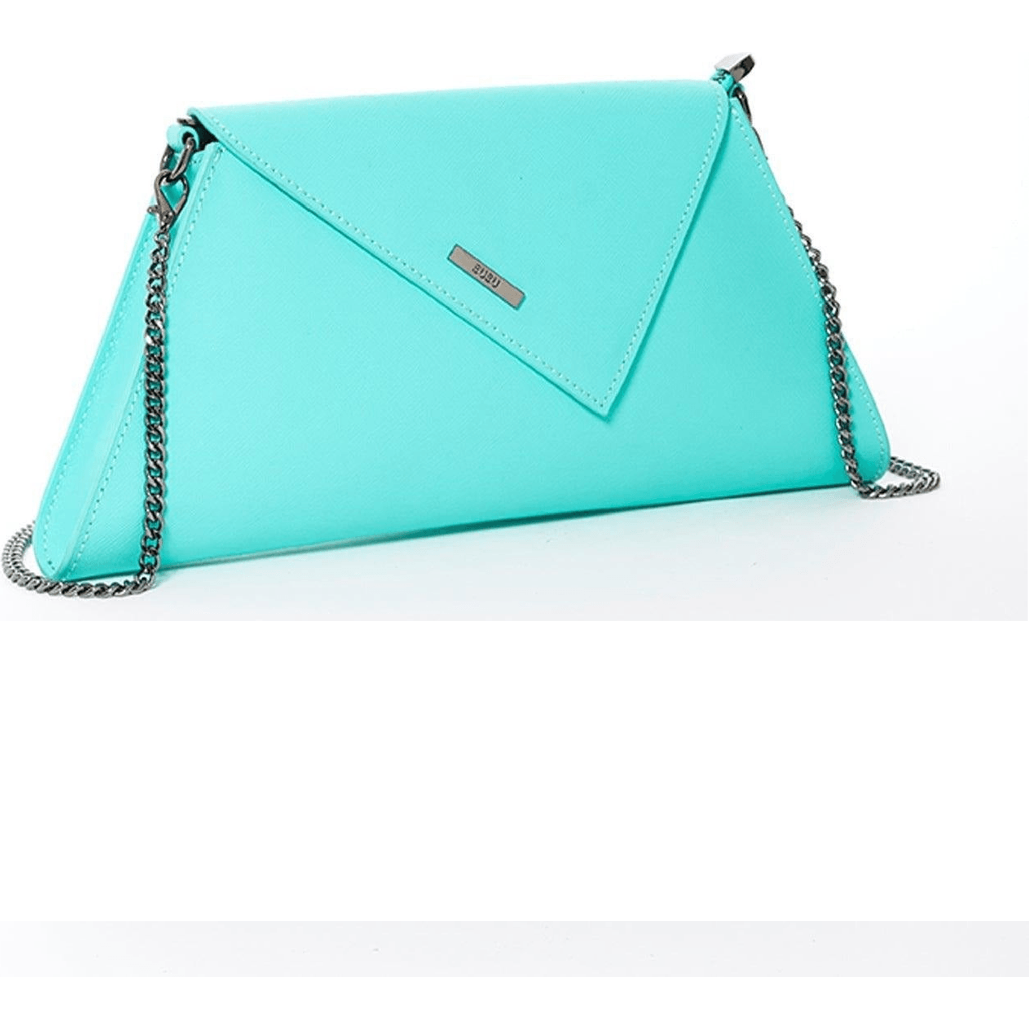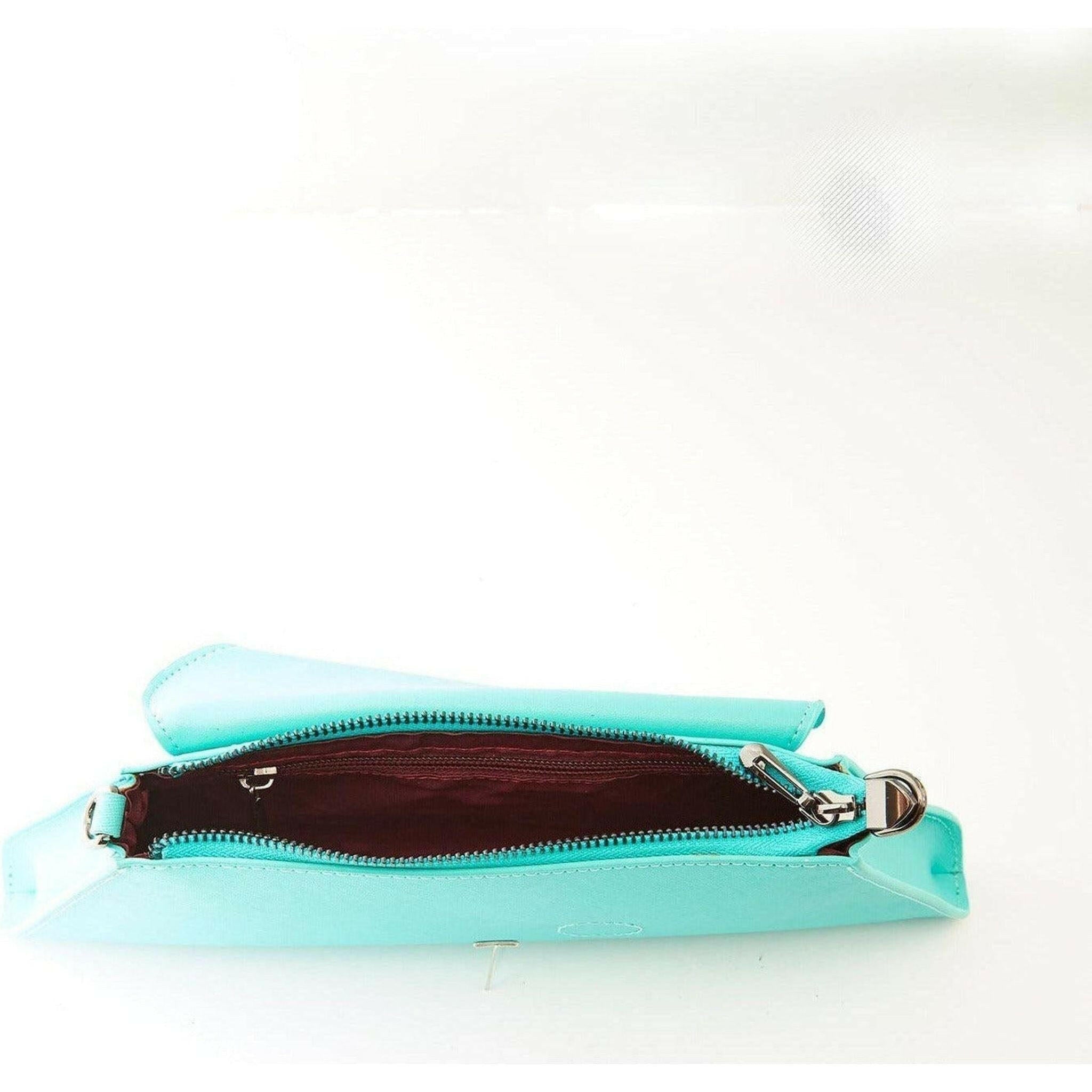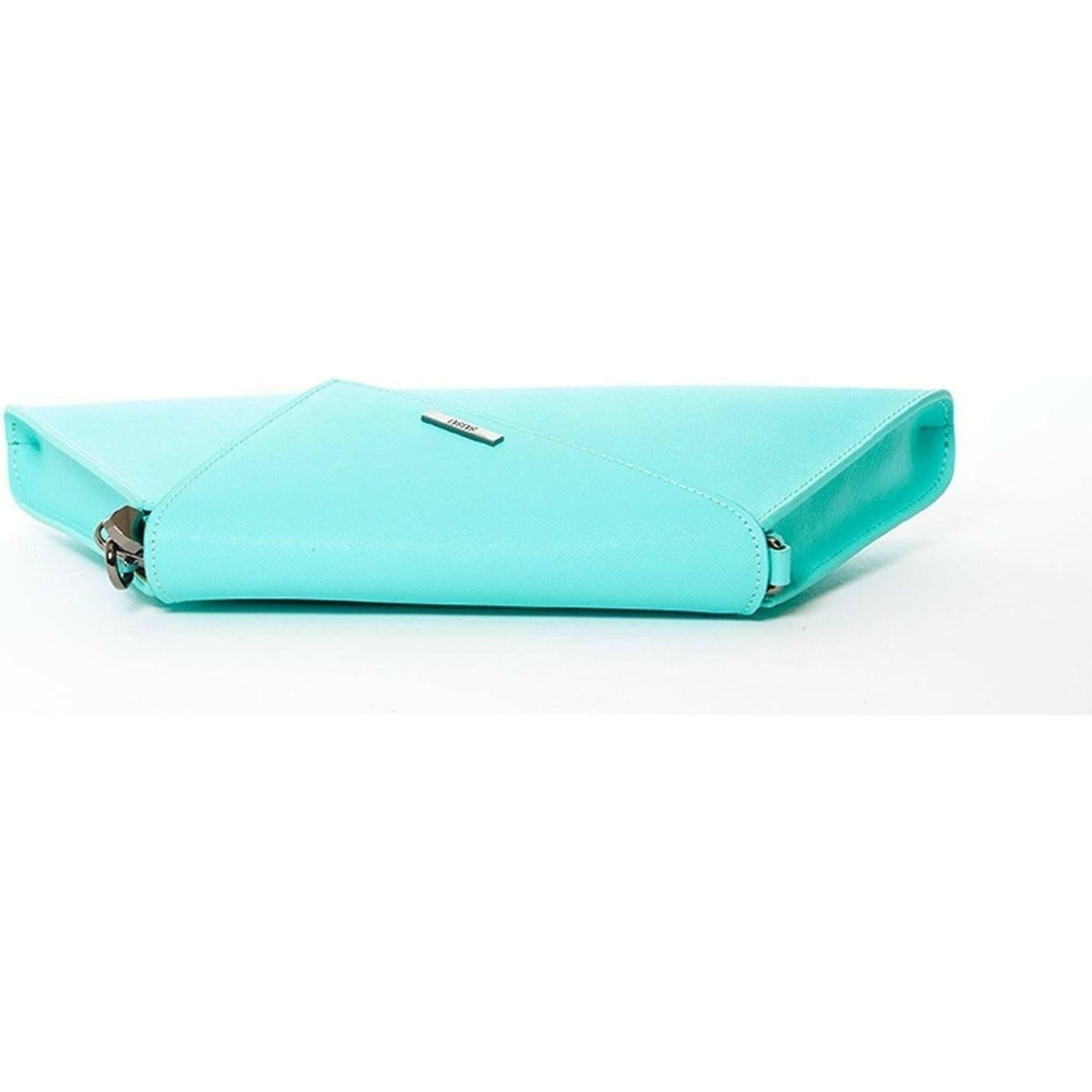 This turquoise Angelica clutch purse is made from saffiano leather and accented with a diagonal flap. Features a fabric-lined interior with a zipped pocket and a zip closure at the top. Four credit card slots been added inside of the bag. A removable chain strap can be worn over the shoulder or as a simple crossover envelope clutch. This will be your go-to day to night designer clutch.