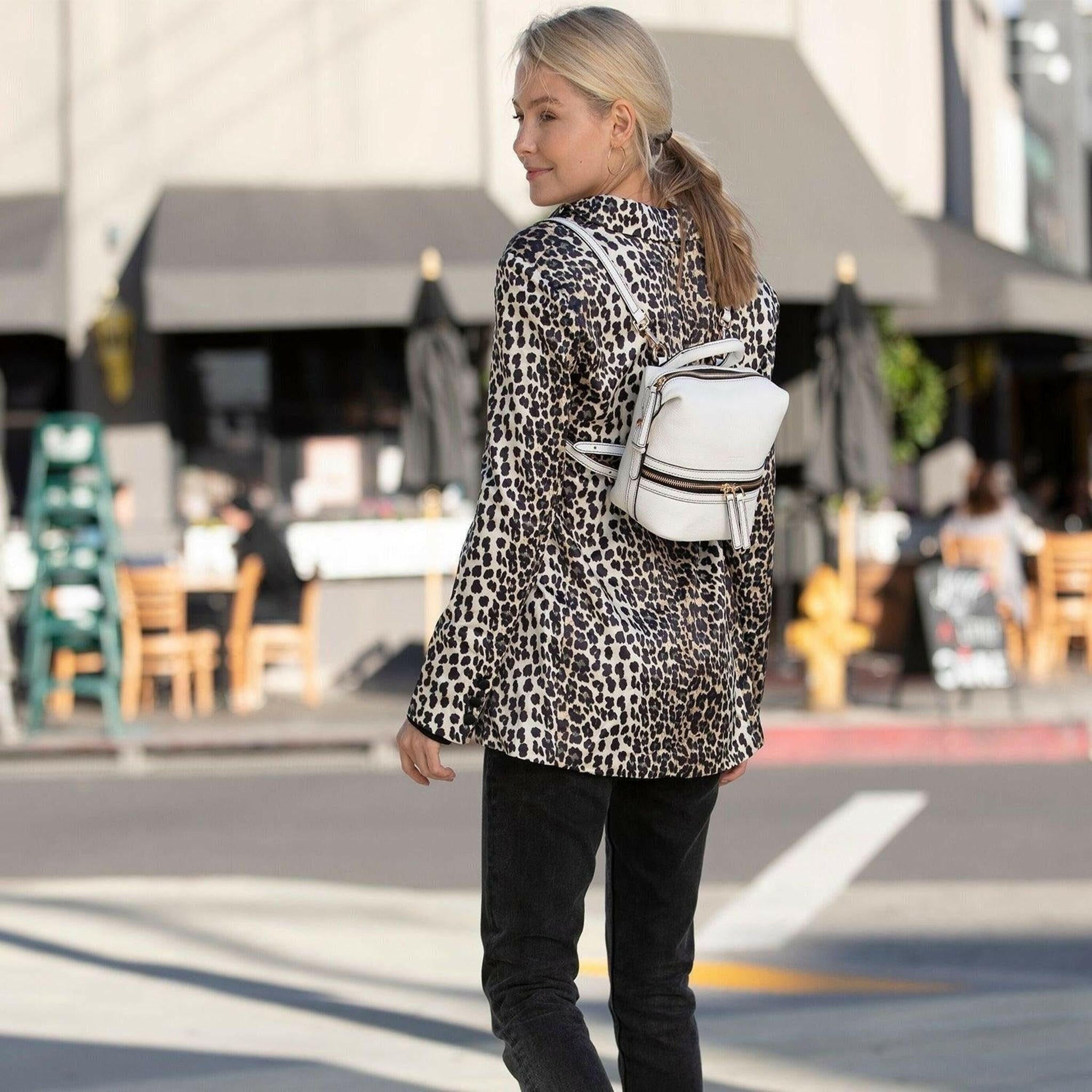 The Ashley white leather backpack purse is made with genuine pebble leather, gold zippers, and leather tassels.  It is a fun, practical alternative to your traditional designer handbag. You can convert it from a backpack style to a crossbody bag or shoulder bag making this your new go-to bag. This white purse includes a zipped front pocket, back pocket, middle compartment, and a cell phone slot. This is a best leather backpack as it is perfect to wear to