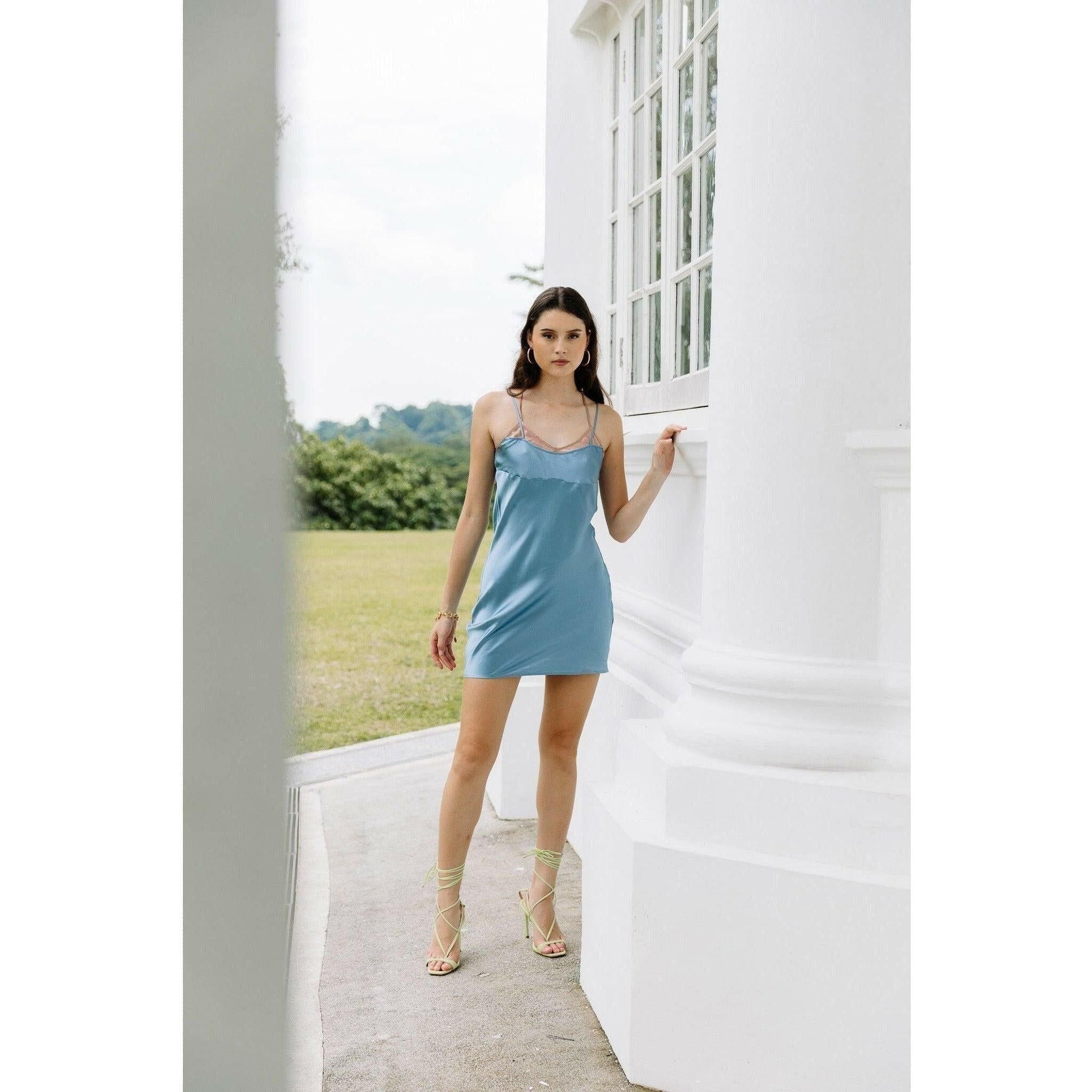 A different twist on the classic slip dress, the Bikini Slip Dress features a double layer design at the bust with adjustable shoulder straps and halterneck tie straps. This lightweight silk, bias cut short slip dress comes in a beautiful tranquil blue with a contrasting rose gold. Dress slips on for a comfortable fit.