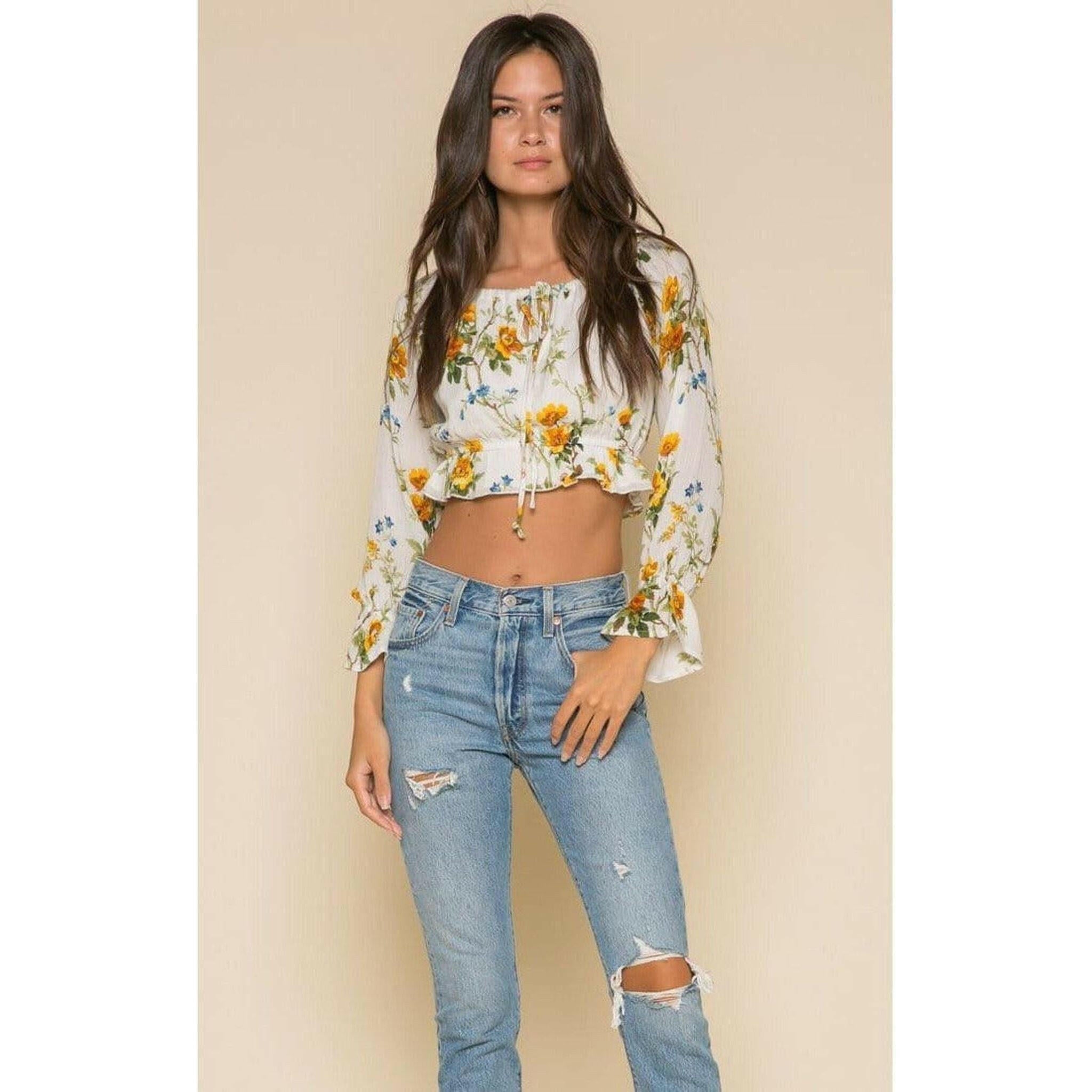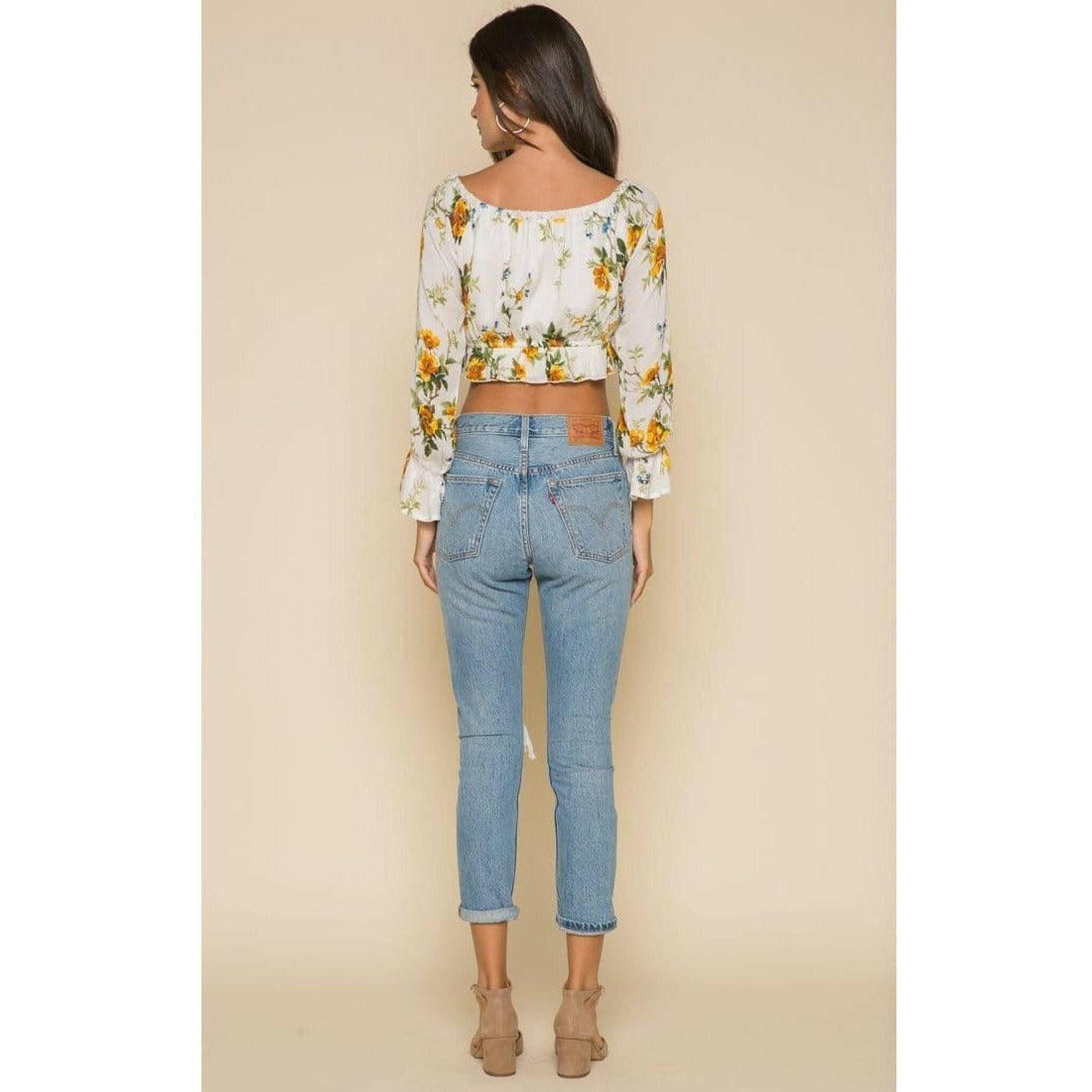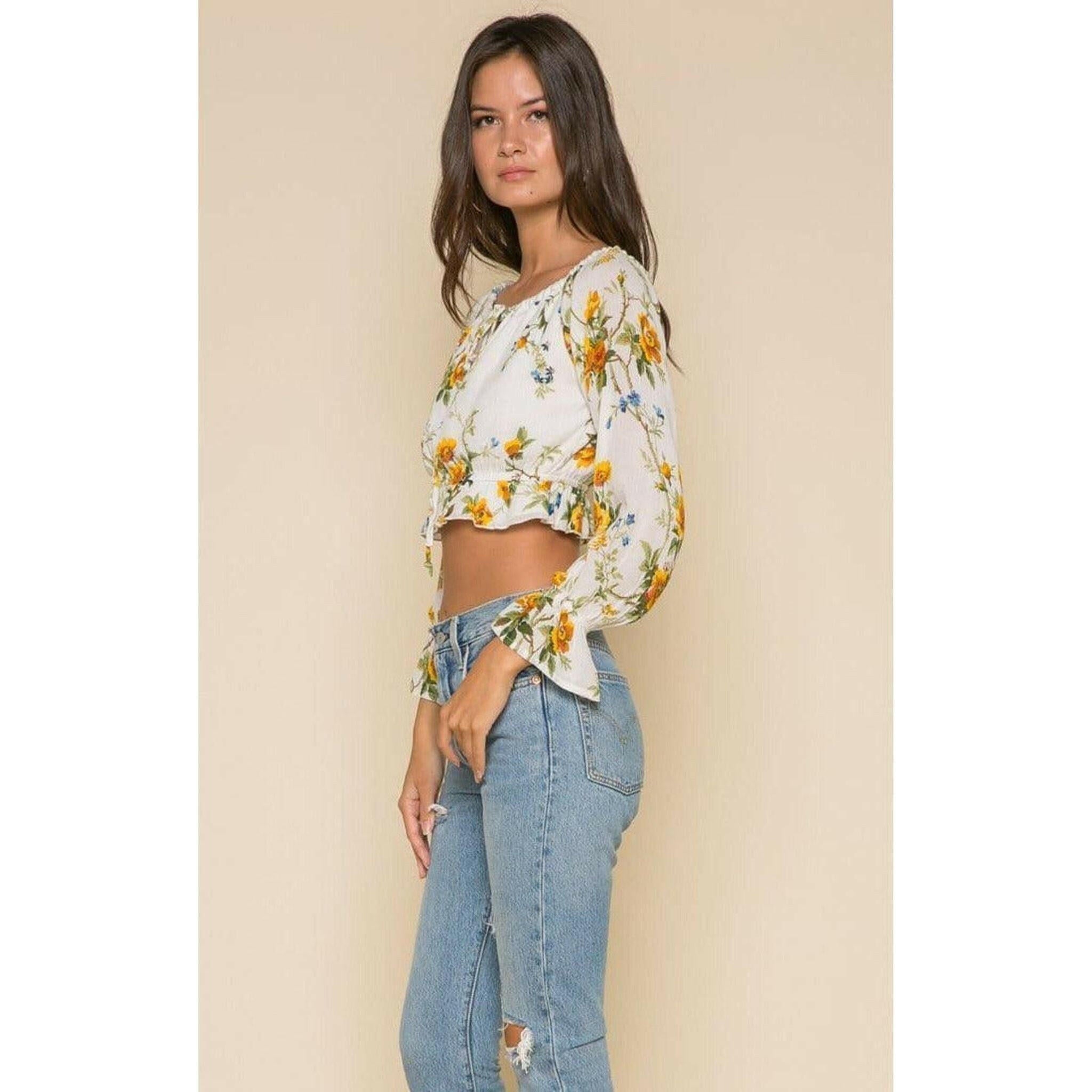 Long-sleeved crop top with all over buttercup print. You can wear this top off-shoulder or scoop neck.