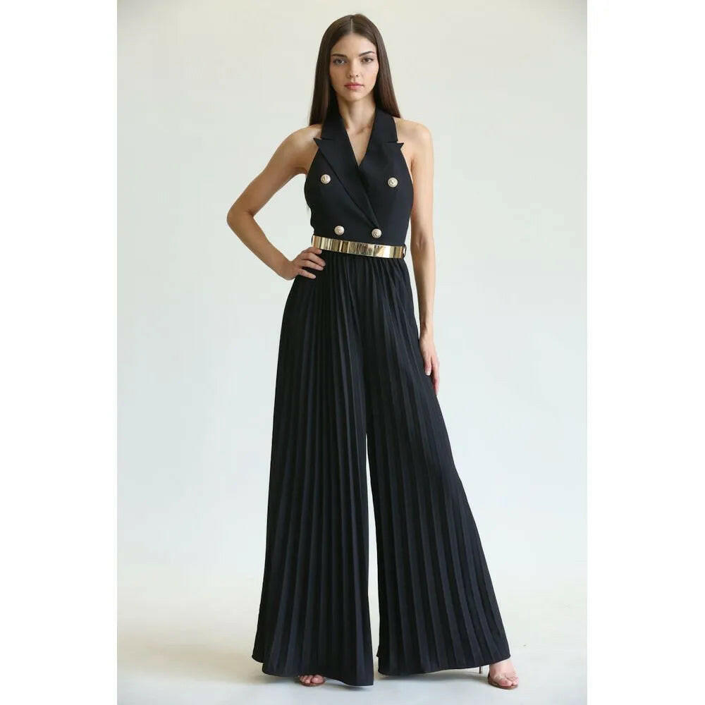 This jumpsuit is sleeveless and has a solid woven top bodice, adorned with gold buttons and detailed front embellishments. Features a notched, lapel collar with a double-breasted button back, pleated chiffon wide-leg pants, and belt loops with adjustable gold metal melt. The low-cut back is finished with a zipper and back closure for easy wearability.