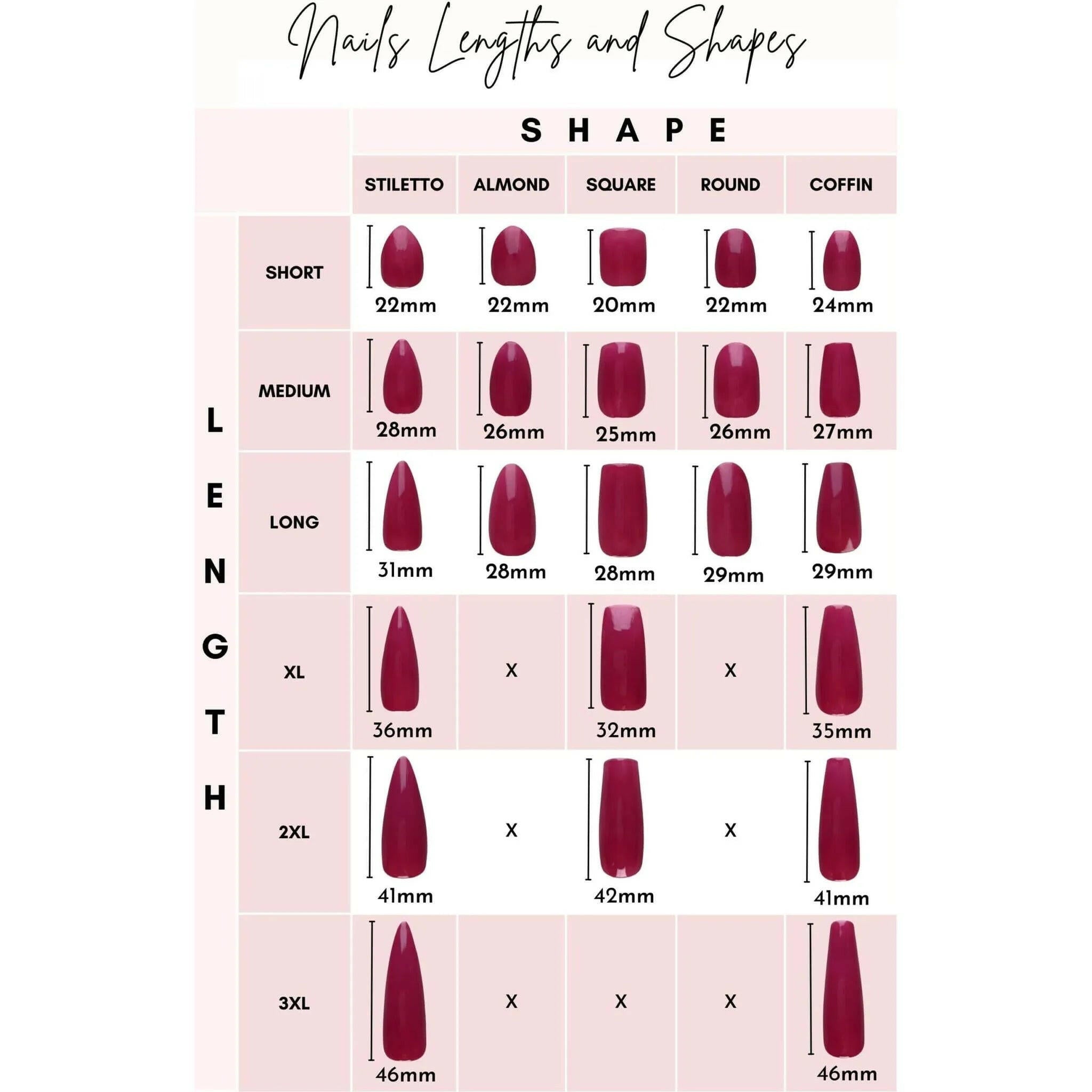 • Each set comes with 10 nails / 20 nails and an Application Kit: Alcohol wipes (2 pieces), nail adhesive glue tabs (enough for two applications), cuticle pusher and remover wooden stick, nail buffer, nail file and liquid nail glue.