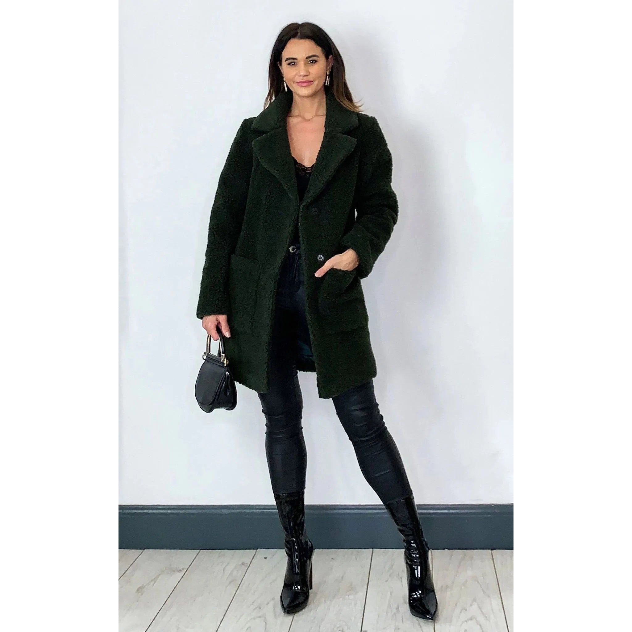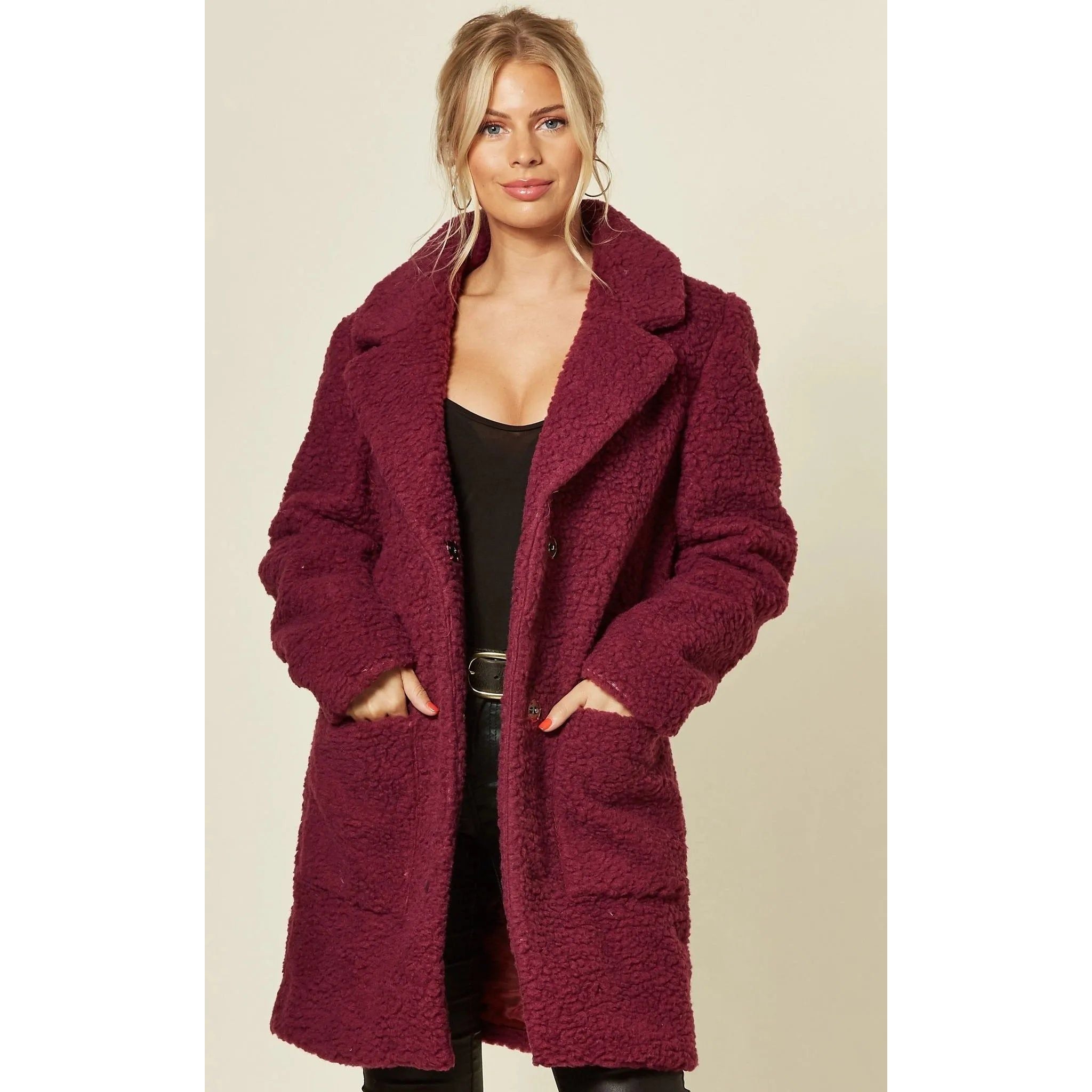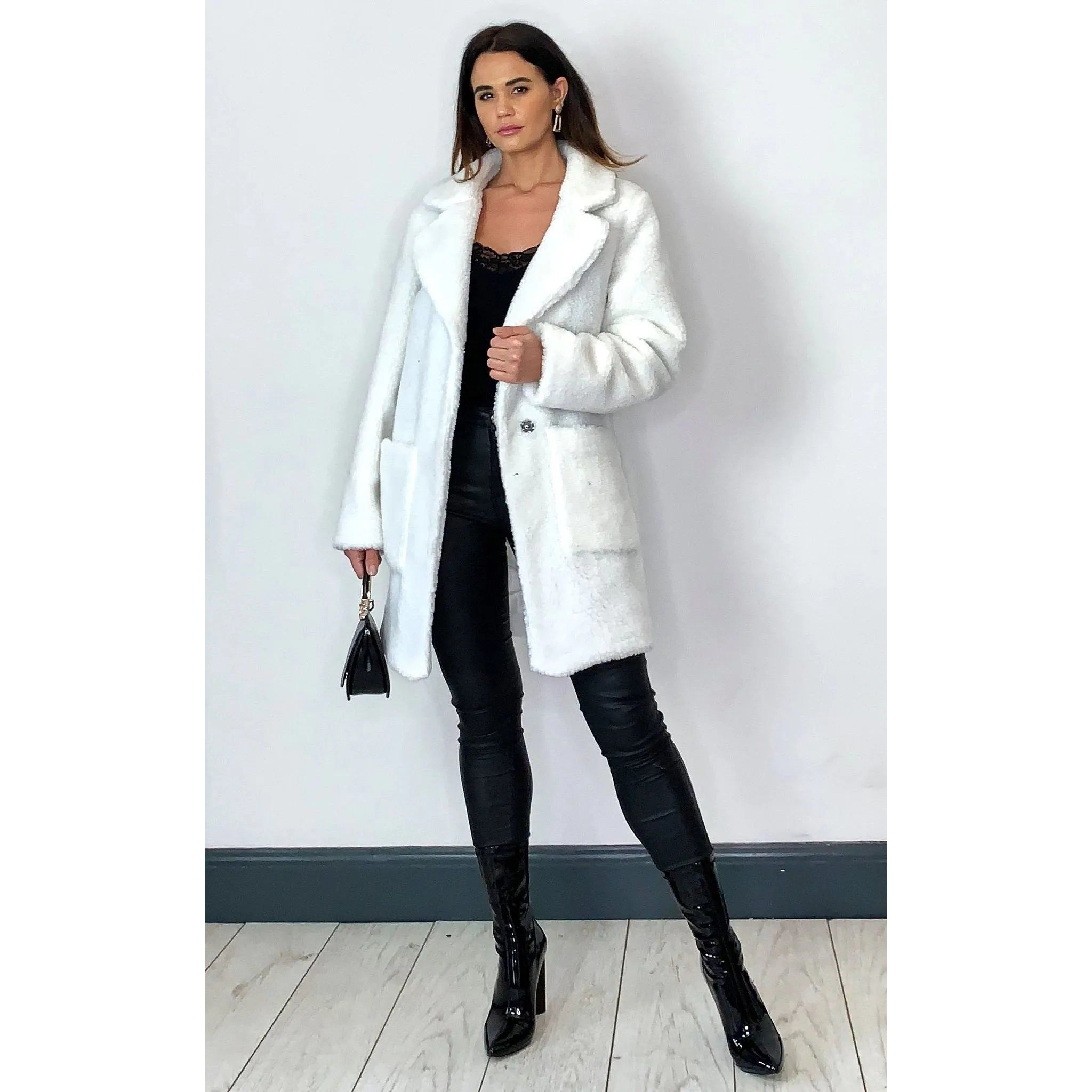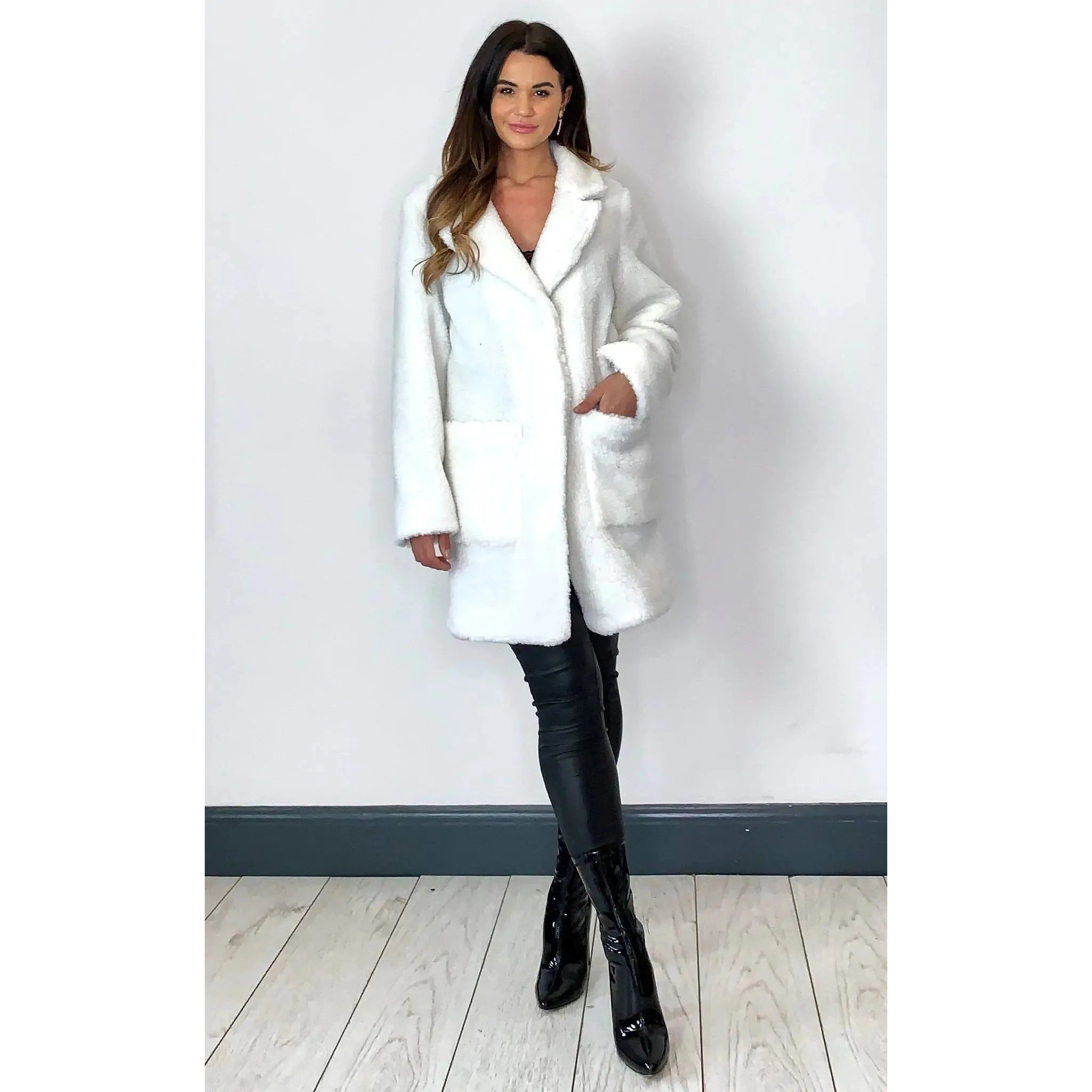 A big and cozy coat with a borg teddy finish, perfect for rocking the oversized look. Made in England and featuring an oversized fit, this coat is sure to keep you warm and stylish. It's even got popper button fastening and 2 side pockets for added convenience. Fully lined with 100% polyester, you'll never want to take this coat off!