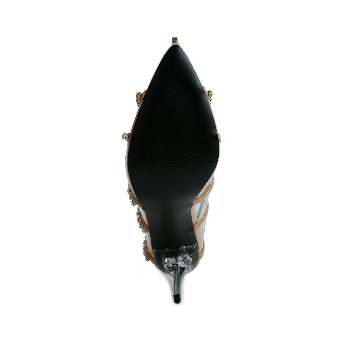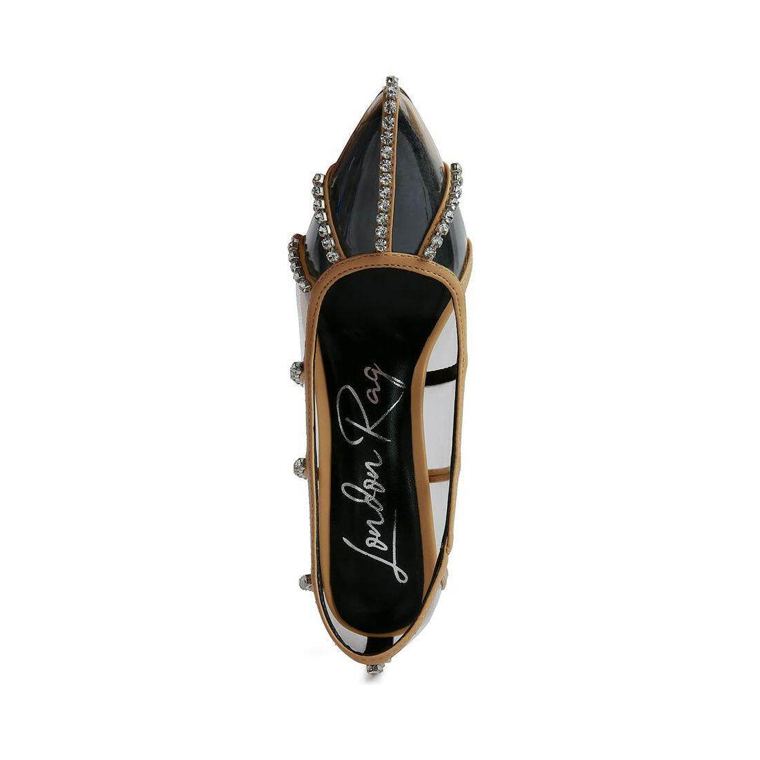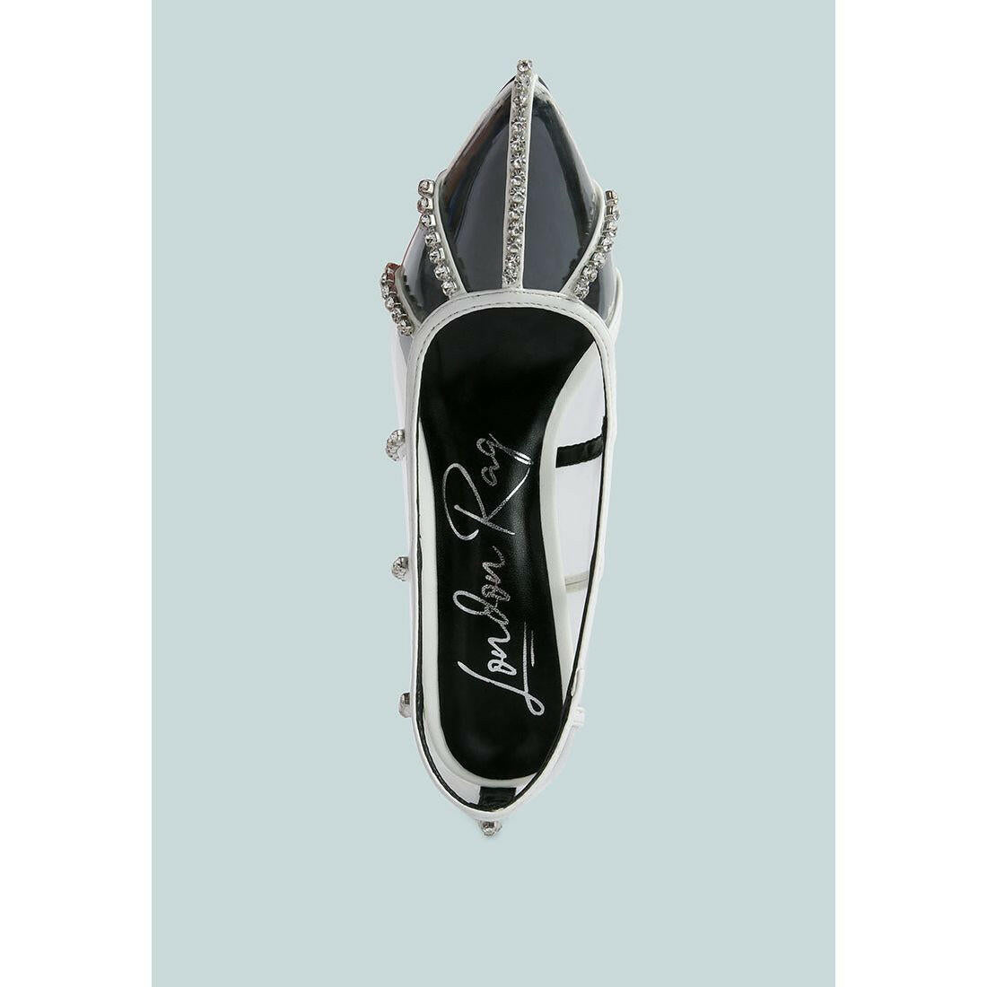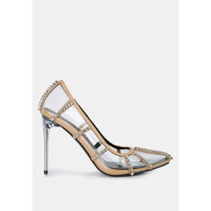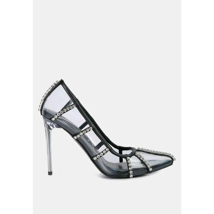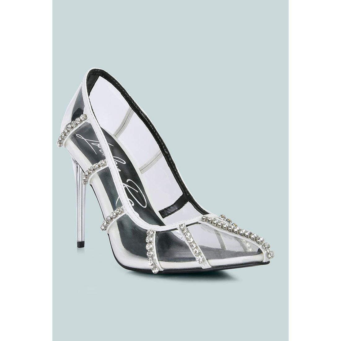 The clear clear stilettos are absolutely ravishing with the cage construction adorned with gorgeous diamante embellishments. The clear heel is also an intriguing touch of trendy. These party heels are perfect for weddings, bachelorette parties, and even as wedding heels!