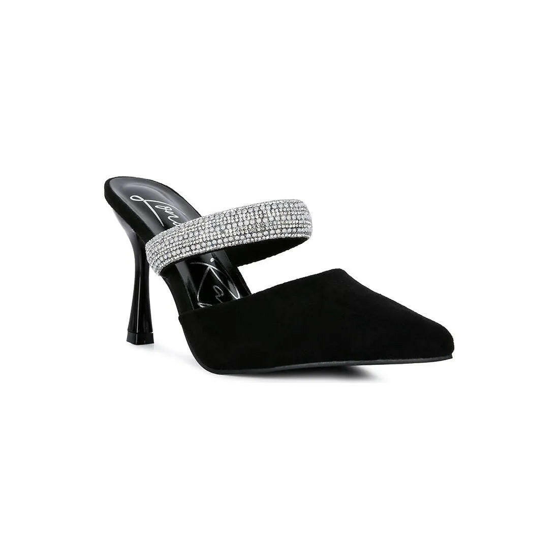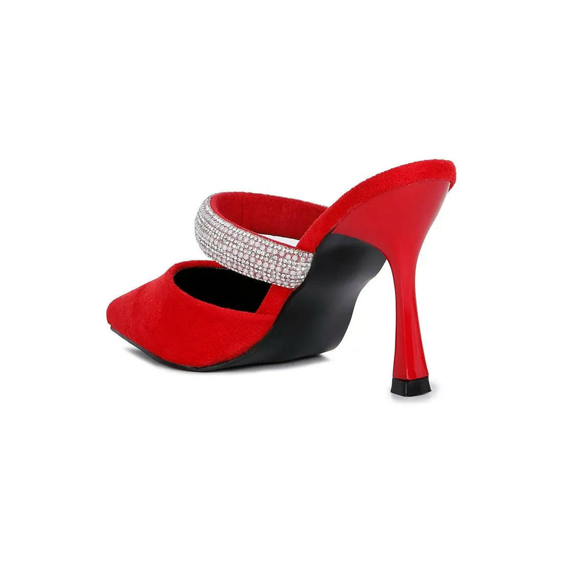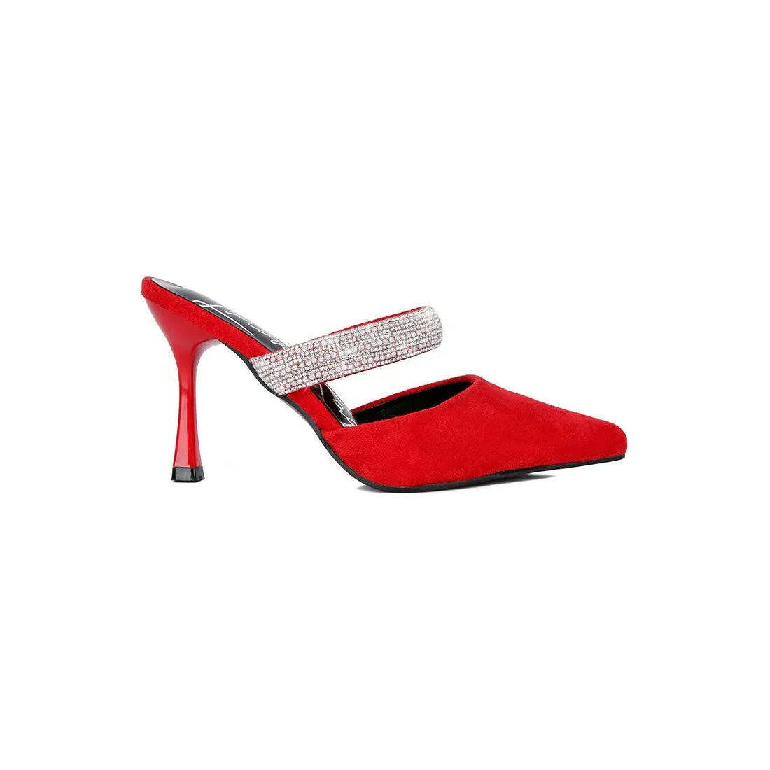 The diamante detail strap amps up the whole look, and the pointed toe construction gives the sandals a sharp look. The pair is a show stopper, indeed! The short heel and soft innersole make the slip-on sandals easy to wear.