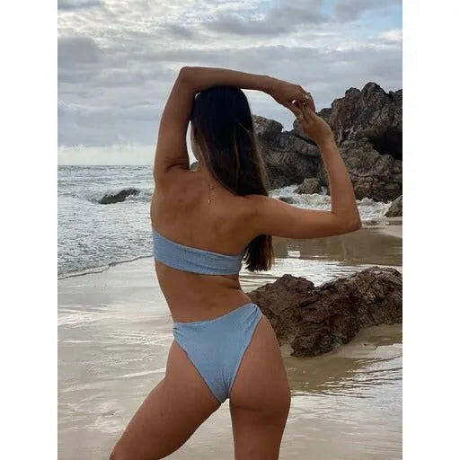 Make a splash in the Gigi Top! With a delicate baby blue hue and shimmering lurex fabric, you'll feel like a mermaid on land. The model is wearing a Size Small Top and Bottoms. Did you know? The brand's swimwear is ethically handmade by a handful of seamstresses in their atelier.