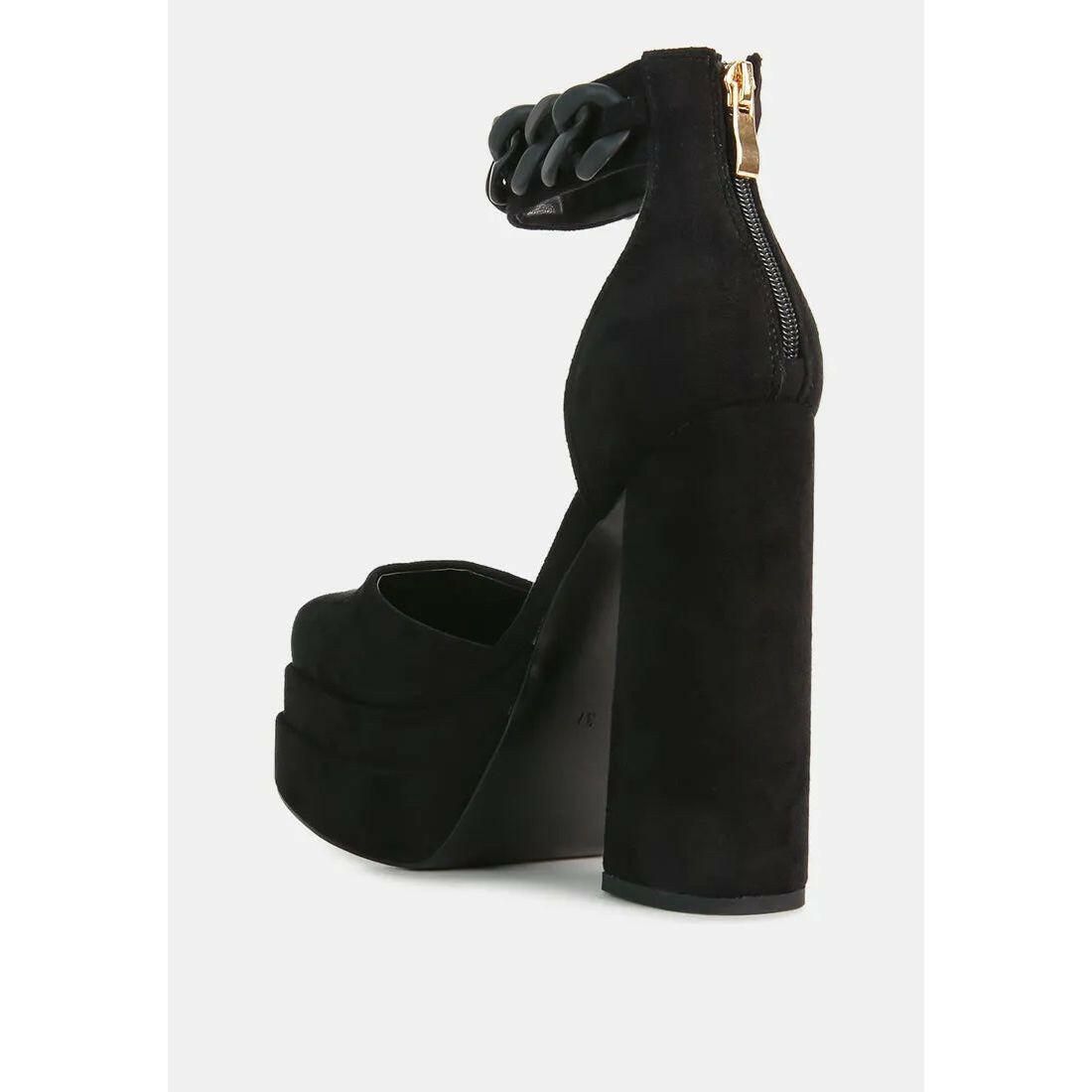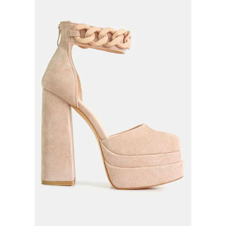 The platform sandals are supremely stylish with chunky chain embellishment on the ankle strap. The shoes style is quite chic and alluring and would look lovely as wedding shoes, wedding guest shoes, bridesmaid shoes, etc.