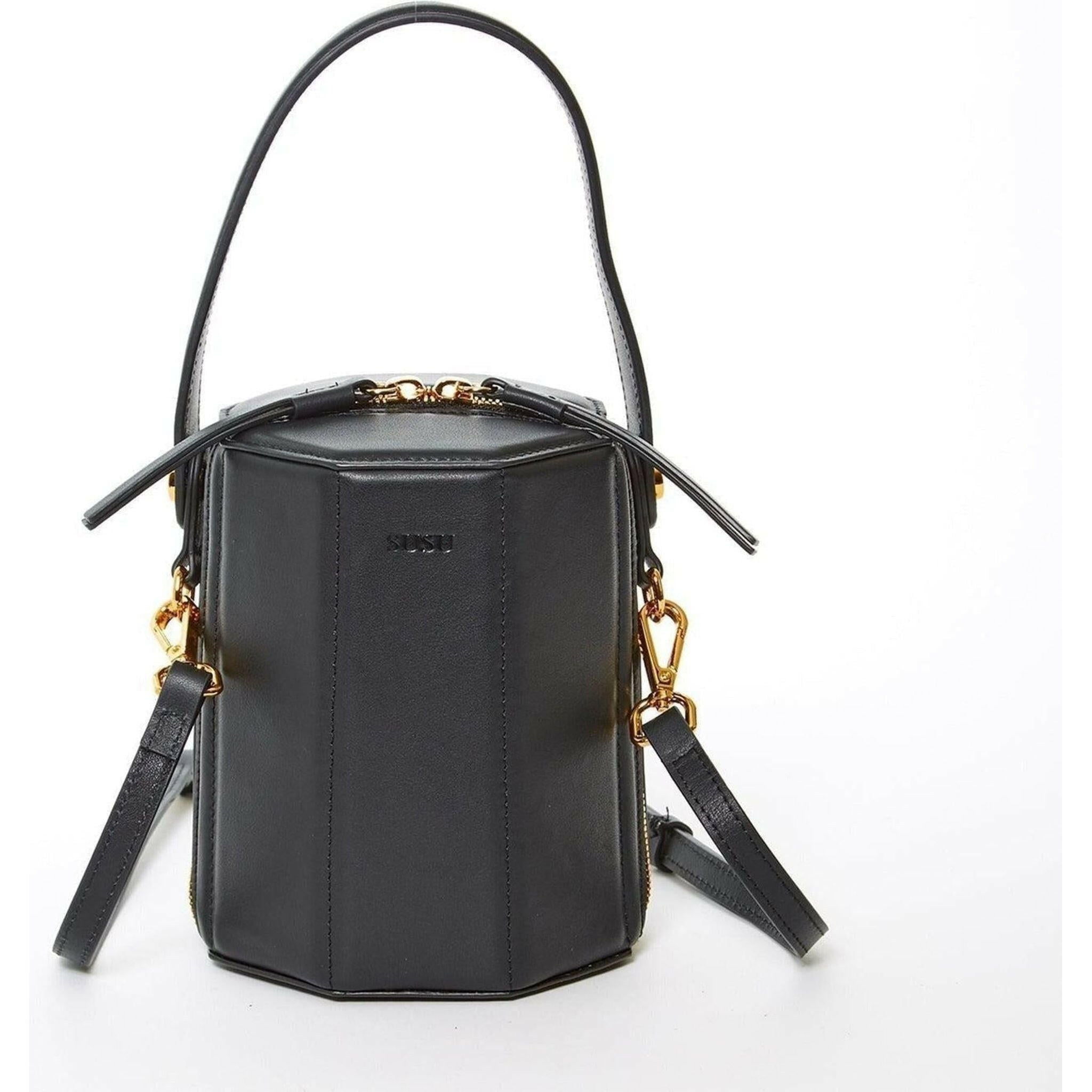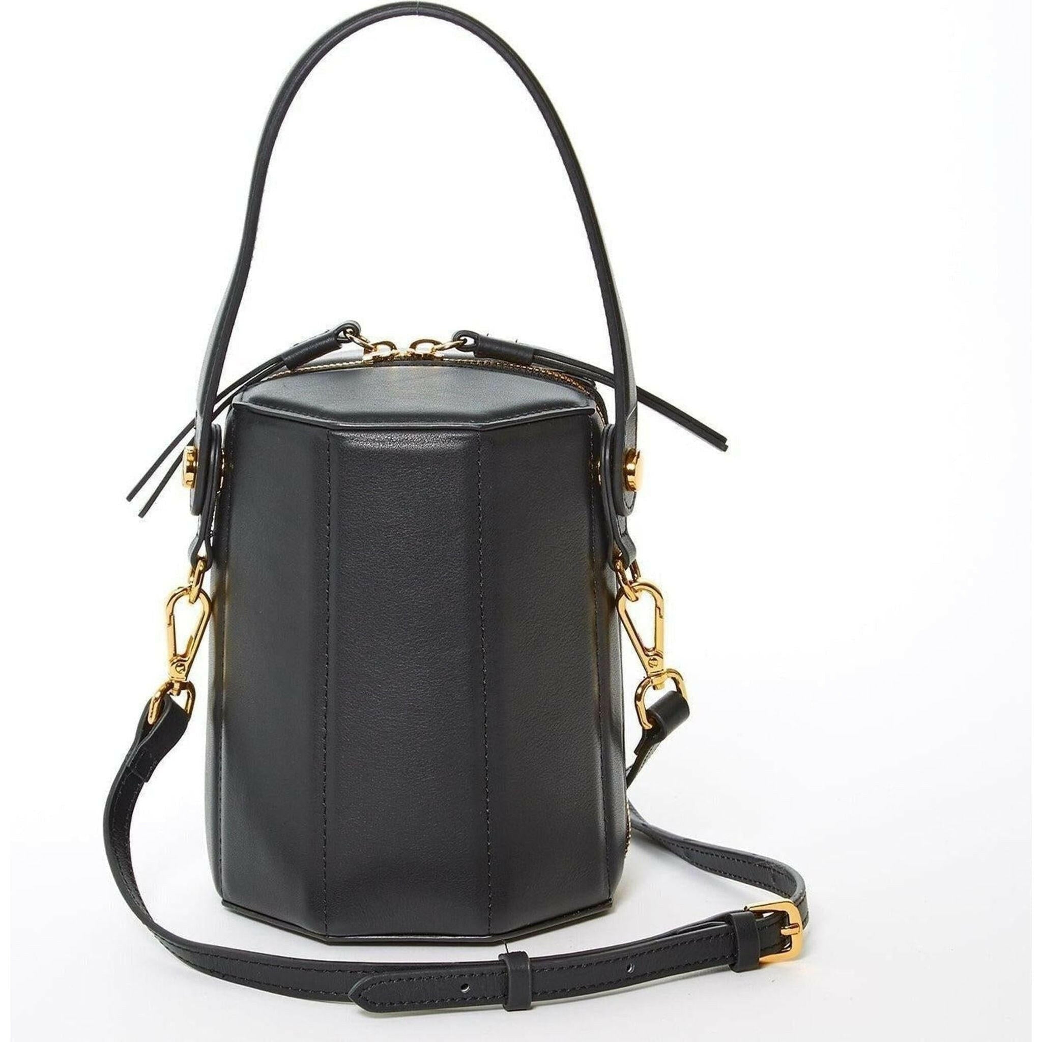 This black Harper leather bucket bag comes in a geometric shape and has a playful but sophisticated runway savvy look. With its gold hardware, its small handle allows the bag to swivel and be held in hand as a bucket. The top zipper will keep your contents secure while the cotton lined interior with 3 compartments keeps everything organized. This crossover barrel bag comes with a long and adjustable leather strap.