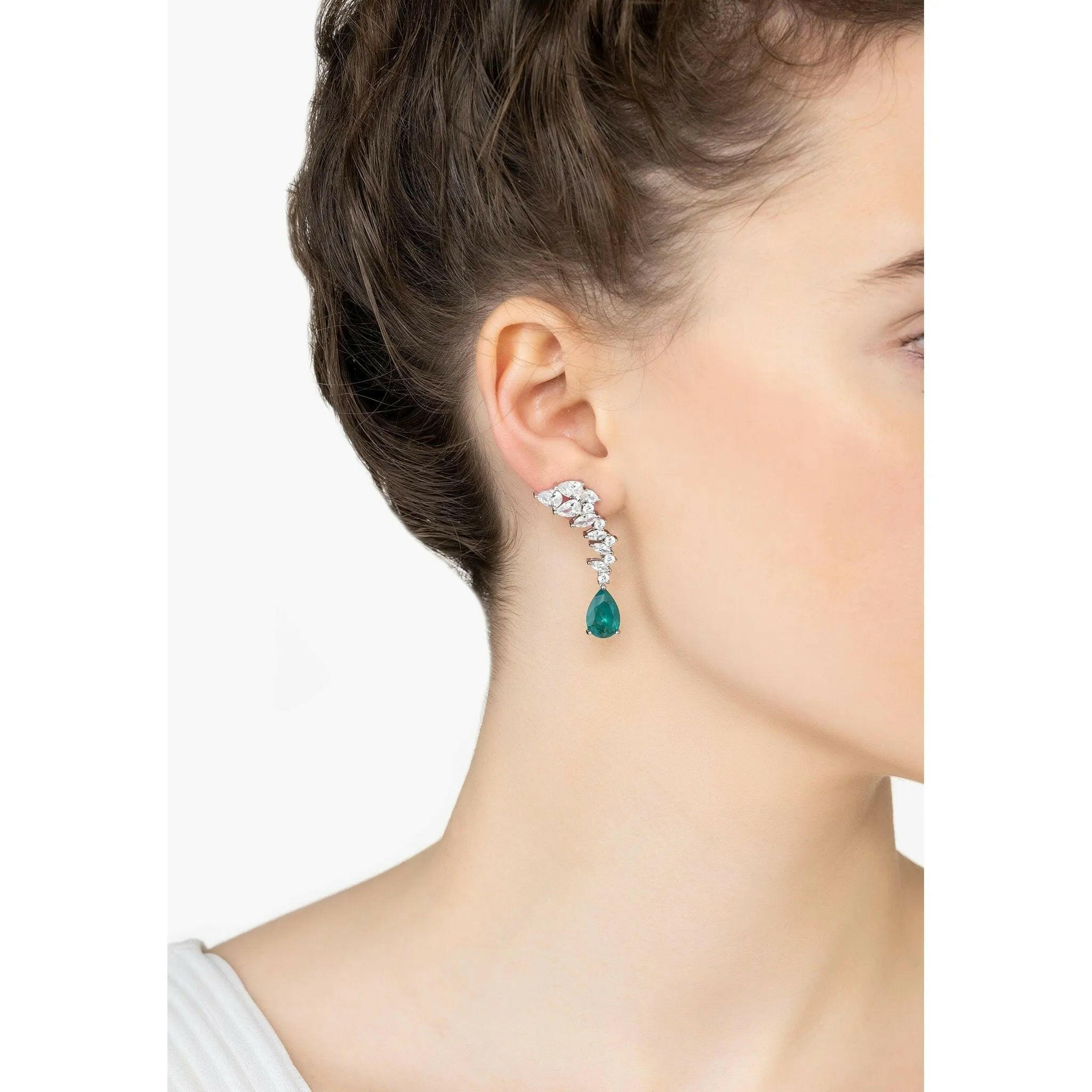 Introducing the Henriette Teardrop Earrings in Emerald Silver—a dash of elegance you can wear. Crafted from high-quality 925 sterling silver, these earrings are anything but ordinary. They feature a teardrop-cut, lab-created emerald that dangles just enough to catch the eye. Supported by a stunning design earring top sprinkled with simulated diamonds, these earrings add a perfect touch of sparkle to any outfit. Measuring 4.2 cm in length and 1.3 cm at their widest point, they weigh a comfortable 8.0 grams,