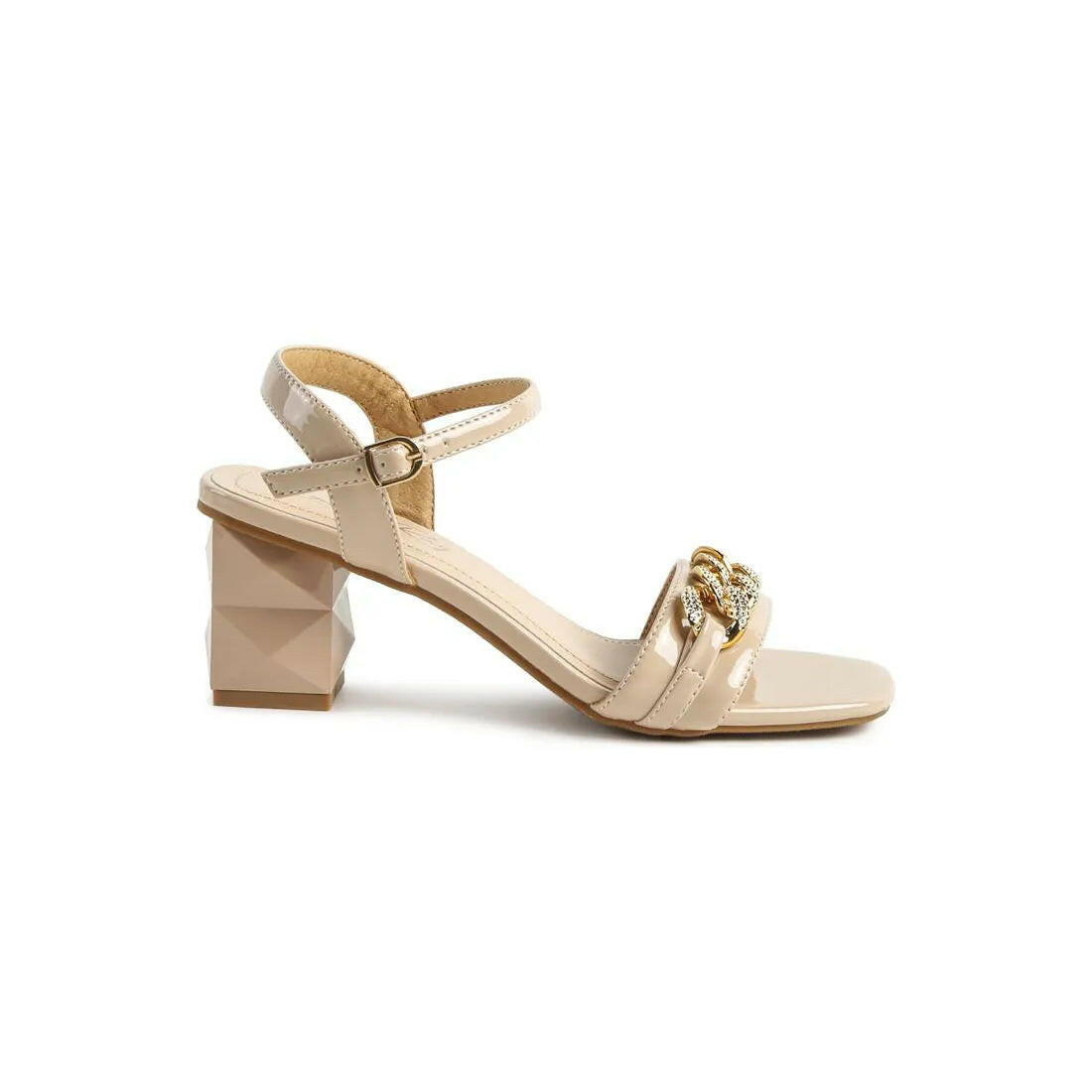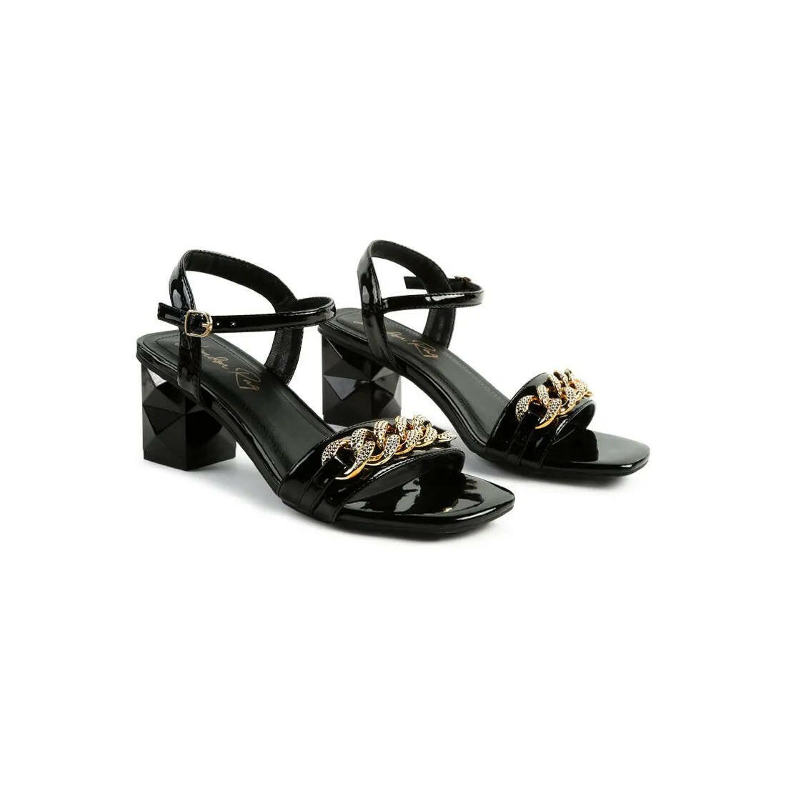 Beautifully detailed block heeled sandals with rock cut design.  The comfortable mid heeled sandals comes in high end construction and superb finish; has metallic gold chain with diamente details as addition.