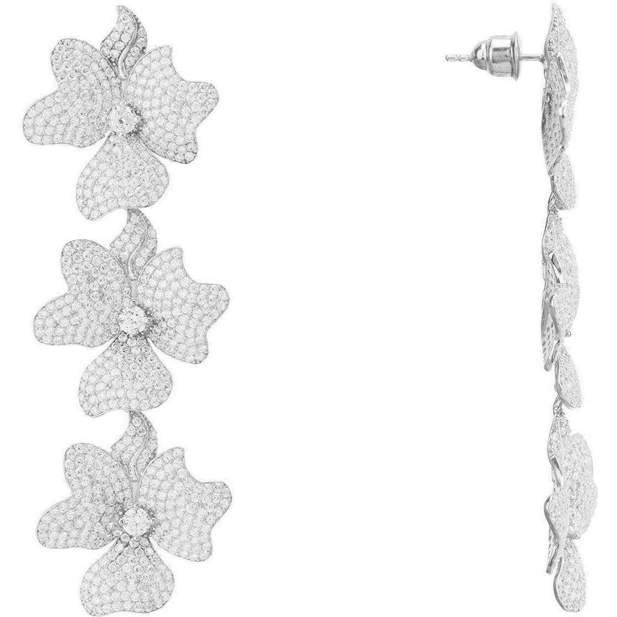 This triple drop earring features three flowers, of equal size, linked together to make a long drop earring. These stunning earrings are adorned with sparkling cubic zirconia which will add a touch of elegance and sophistication to any outfit. Although large, this