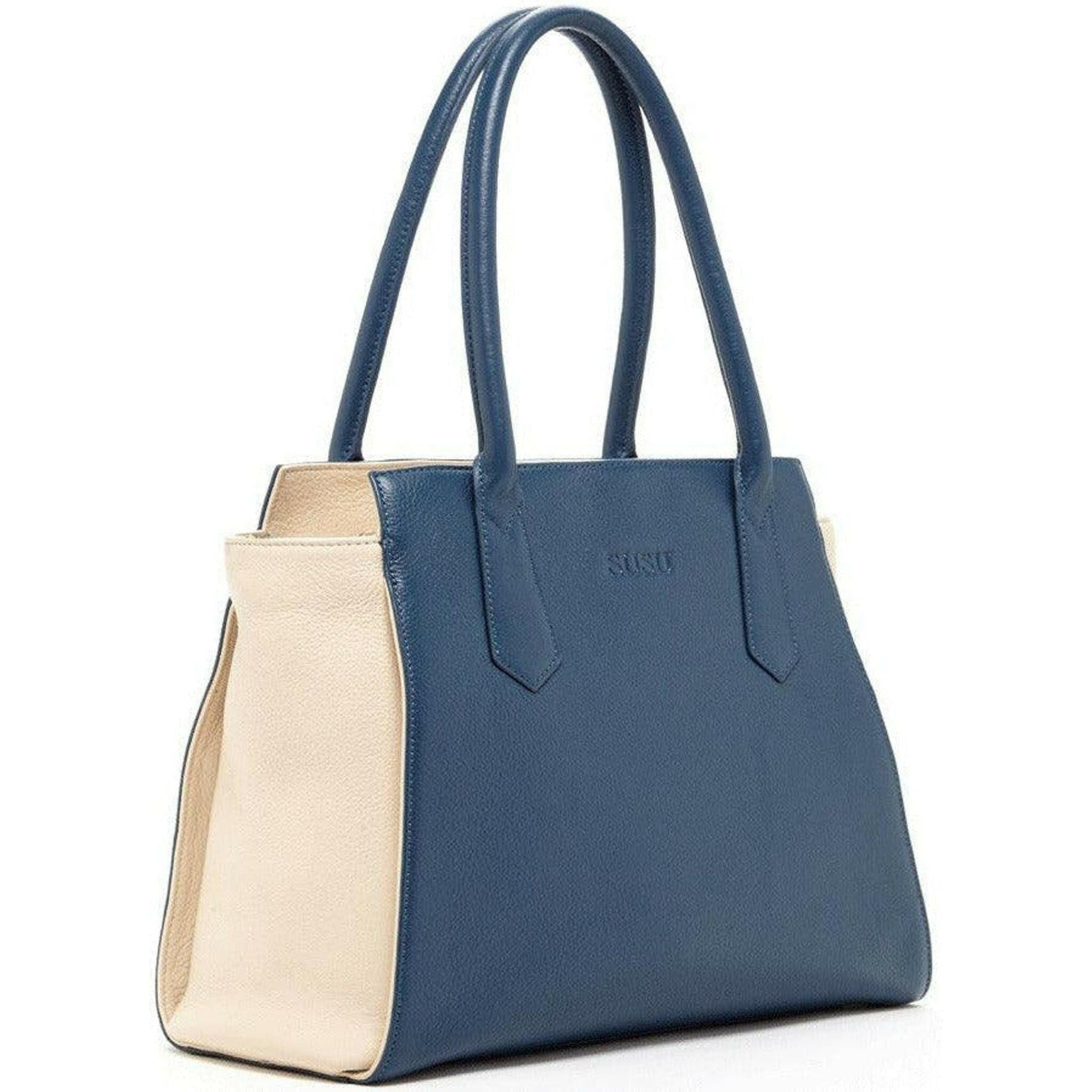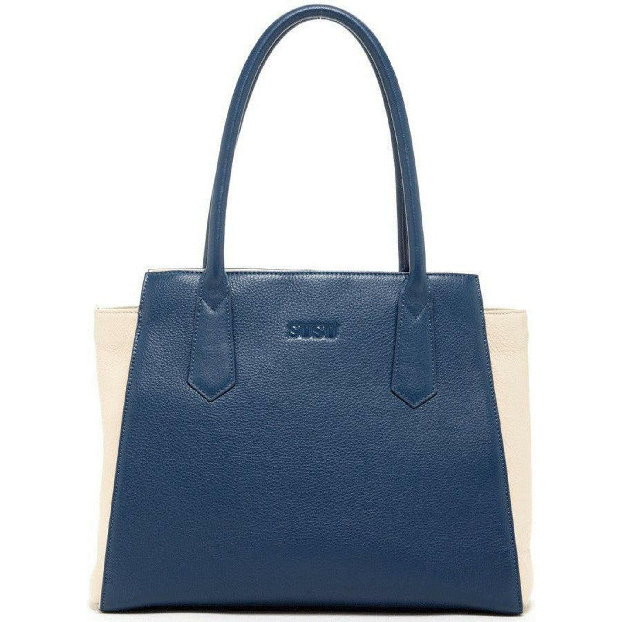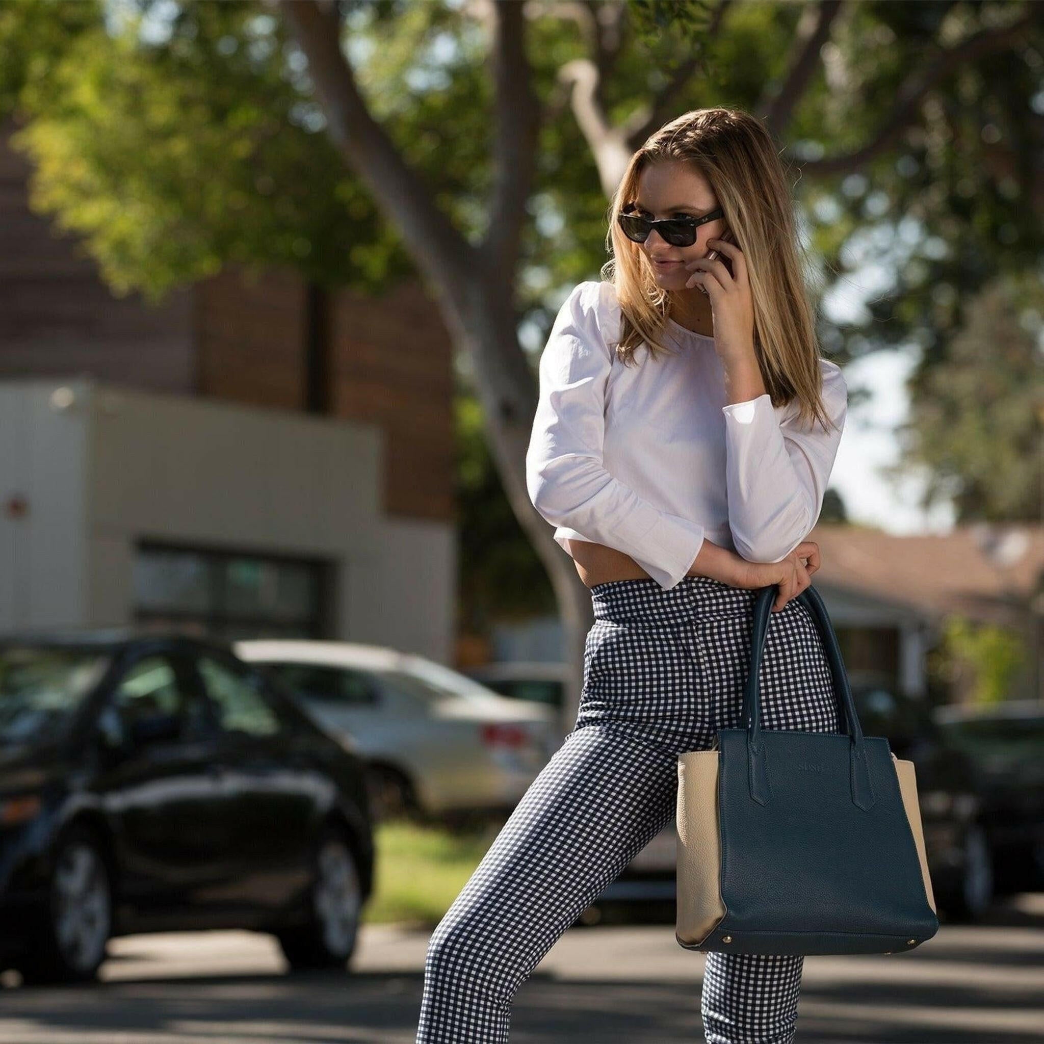 This two tone Jody tote bag is crafted from exquisite genuine pebble leather and features a top zip closure for secure storage. With its versatile design, it easily complements any ensemble. Its fabric-lined interior is outfitted with 2 interior zipper pockets and 2 interior cell phone slips to keep you organized all day long. The double handles let you slip the back onto your shoulder, arm or wrist for versatile carrying.